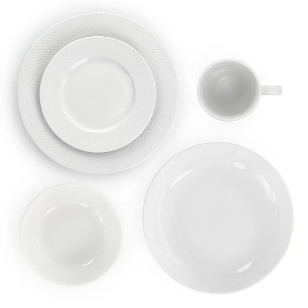 Enhance the table space with the Elama Maisy 18 Piece Round Dinnerware Set in White. Featuring a stunning embossed diamond pattern along the exterior of each dinner plate and bowl. The dinnerware set only proves to upscale simplicity. Made from a durable Porcelain construction, the material helps meals retain heat longer. Guests can enjoy your best cuisines at their own pace without fear. For complete convenience the set is dishwasher safe for easy cleaning and microwave safe for fast reheating. Relish in the moment as snacks, entrees, soups, desserts and more are served.
