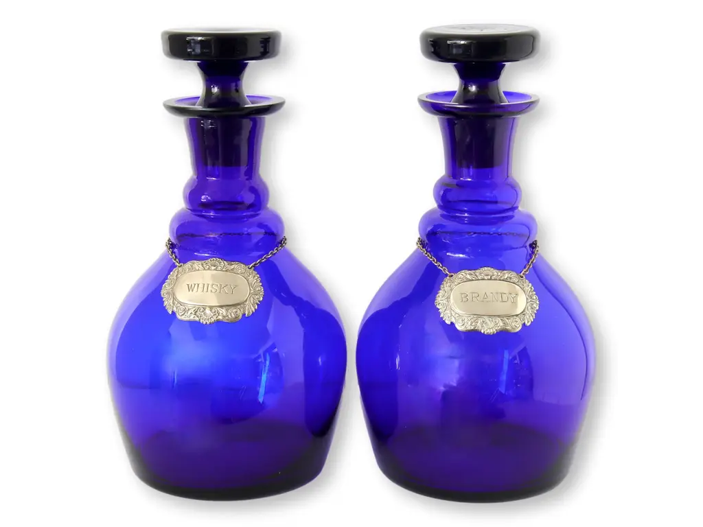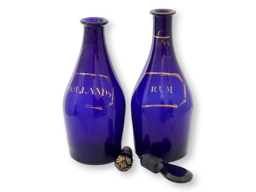 18th-century cobalt blue Bristol glass decanters, designed for "Hollands" and Rum. "Hollands", an older term, refers to what we now commonly call Gin, originating from the Dutch word "jenever". The deep blue hue radiates classic Bristol elegance, while the gilded names provide a glimpse into past terminologies. These decanters aren't just drinkware; they're a reflection of an era, capturing the essence of 18th-century libations and linguistic nuances.