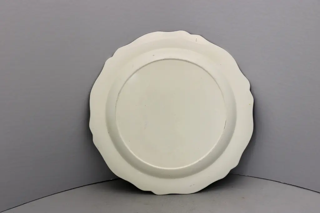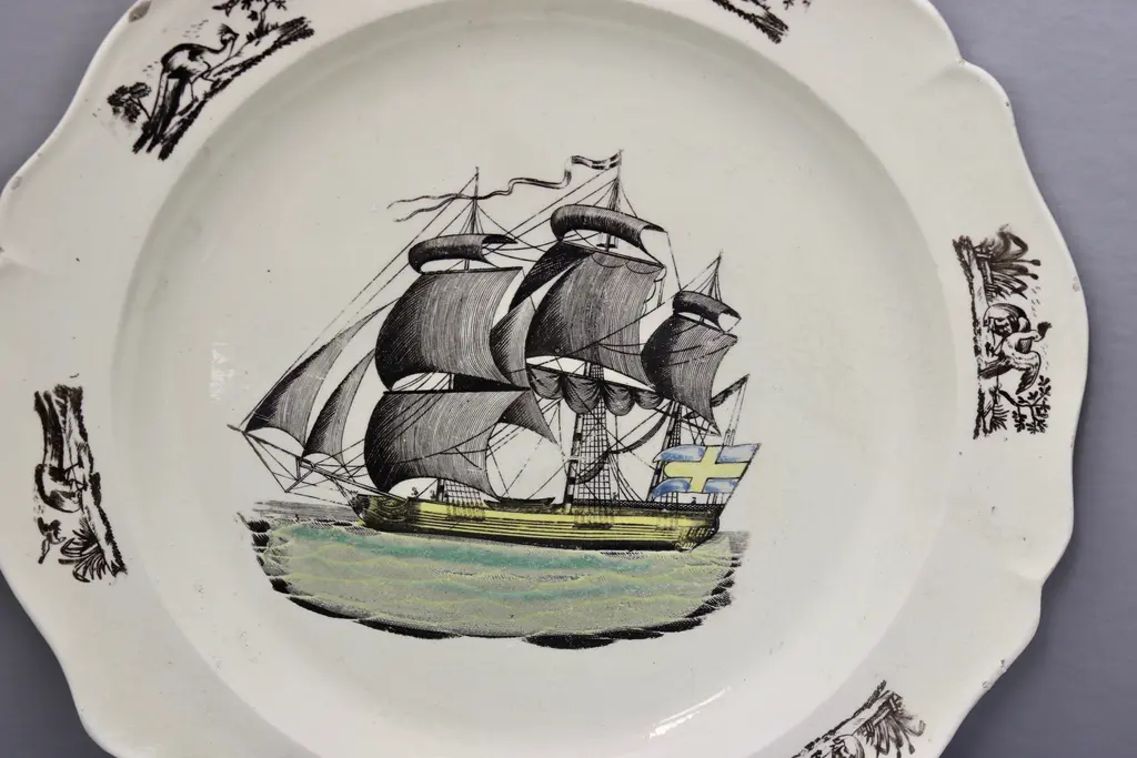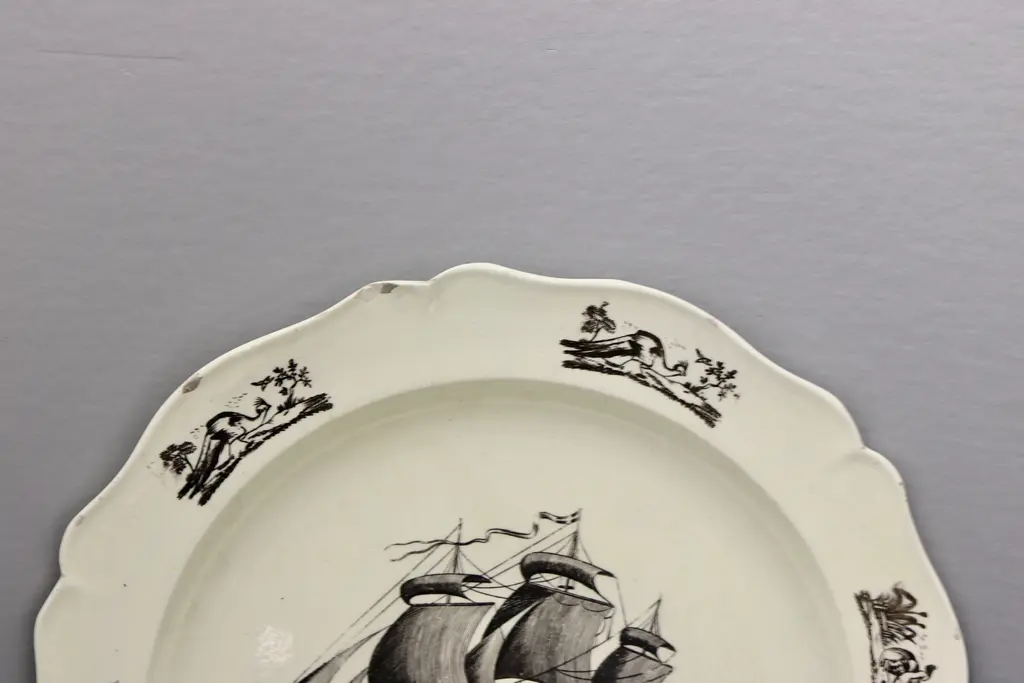 Antique creamware scalloped plate with a ship transfer motif, circa 1780. No maker's mark. Small edge chips, crazing.