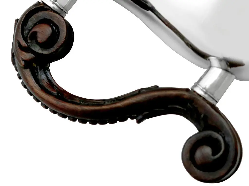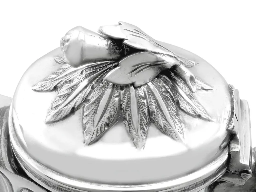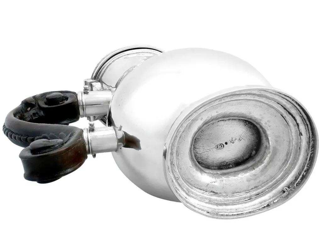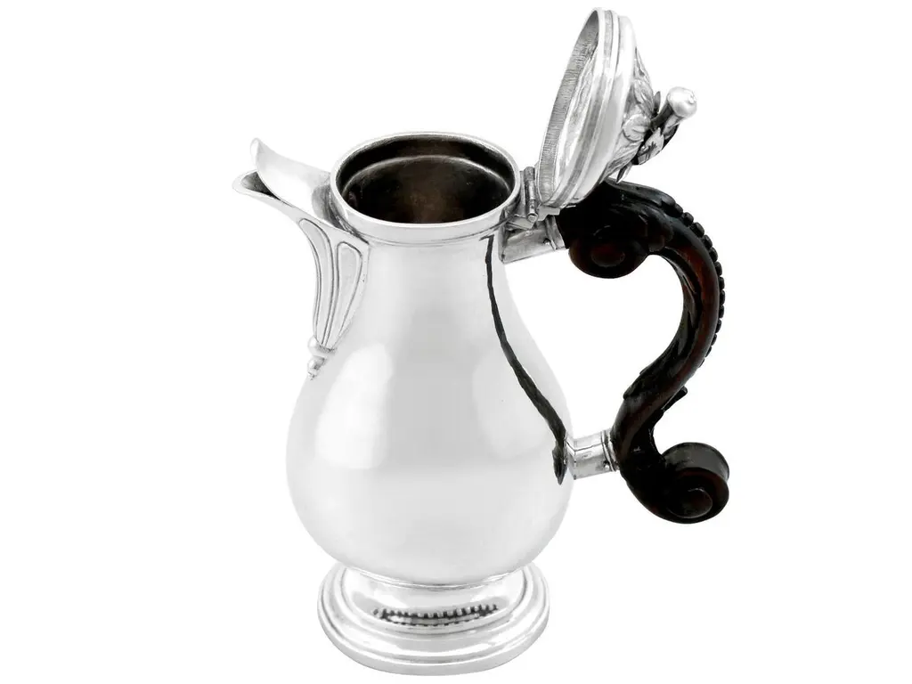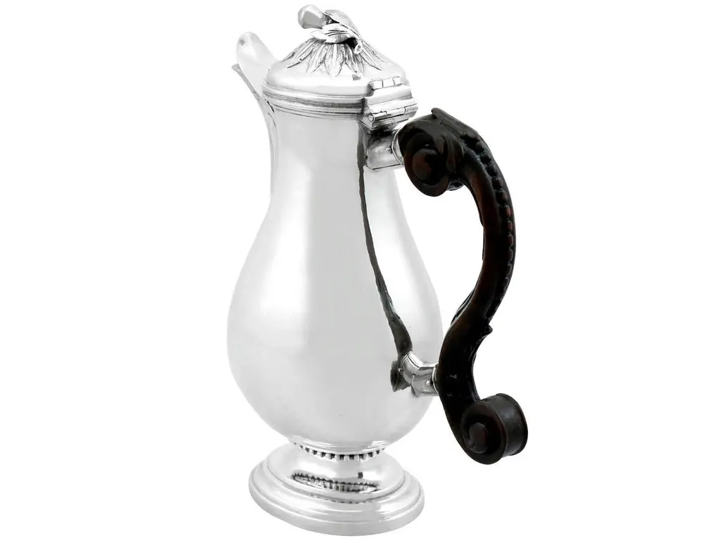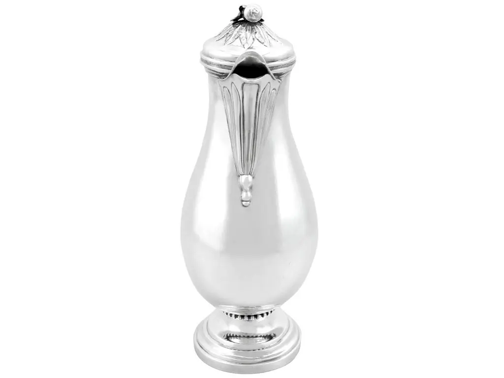An exceptional, fine and impressive antique Swiss silver coffee jug; an addition to our 18th century silver teaware collectionThis exceptional antique Swiss silver coffee jug has an oval baluster form onto an oval pedestal foot.The surface of this 18th century coffee jug is plain and unembellished, with an applied moulded border to the upper rim.This antique silver coffee jug retains the original hinged domed cover ornamented with chased foliate decoration, surmounted with the original and impressive cast silver floral and foliate decorated finial.This exceptional Swiss silver coffee jug retains the original carved hardwood scrolling handle, secured to plain cylindrical silver sockets.This exceptional example of antique silverware has an impressive cast spout, ornamented with a lobed fluted decoration above a vase drop motif.The upper portion of the pedestal is encircled with applied bead decoration, in junction with the body.ConditionThis antique 18th century coffee jug is an exceptional gauge of silver, exceptional quality and in exceptional condition.The 18th century Swiss hallmarks struck to the underside of the coffee jug are clear in keeping with age.Reflections in photographs may detract from the true representation of this example antique teaware.DimensionsLength from back of handle to tip of lip 15.3cm/6'Width 7.8cm/3.1'Height 20.3cm/8'Weight13.7 troy ounces/425gDate: Circa 1760Origin: Lucerne, Switzerland