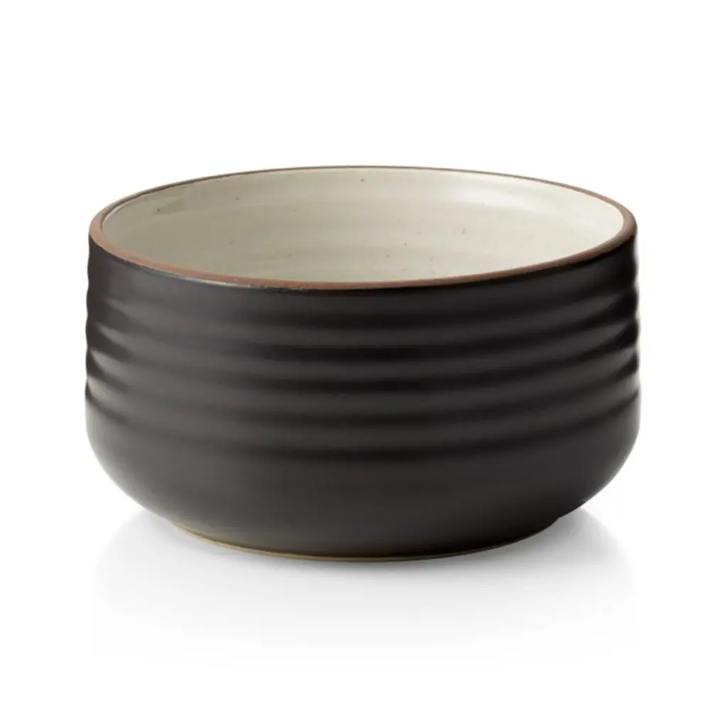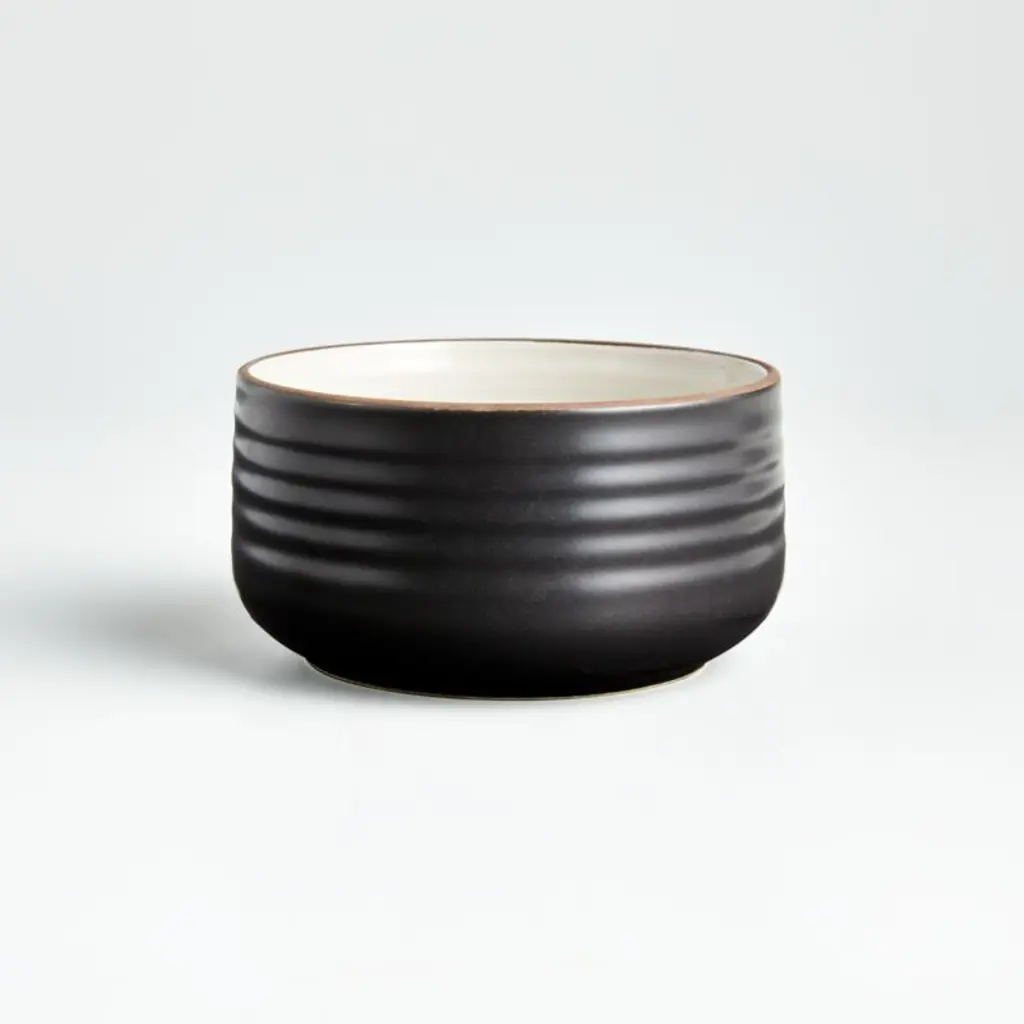 Modern and restrained in form, expressive and rustic in glaze. The artisan's hand is authentically reproduced in this stoneware pattern designed exclusively for Crate & Barrel by ceramic artist and designer Kathy Erteman at her 18th Street studio in New York City. The collection's straight-sided cereal bowl has a contemporary matte black exterior that contrasts with the rustic beauty of a shiny, speckled white glazed interior ringed with the subtly raised spiral associated with hand-thrown pieces. Raised clay rims feature a sandy glaze that evokes the feel of exposed terracotta. To capture the artisan look of this dinnerware, Erteman modeled prototypes to true scale by hand with her original glazes as reference for production. In the words of the designer, "When making tableware, I consider design and the rigors of daily use. The spirit of my hand in these pieces is modest, to harmonize with and act as a support to the prepared ingredients." This set of eight bowls serves cereal, salads, ice cream and more.