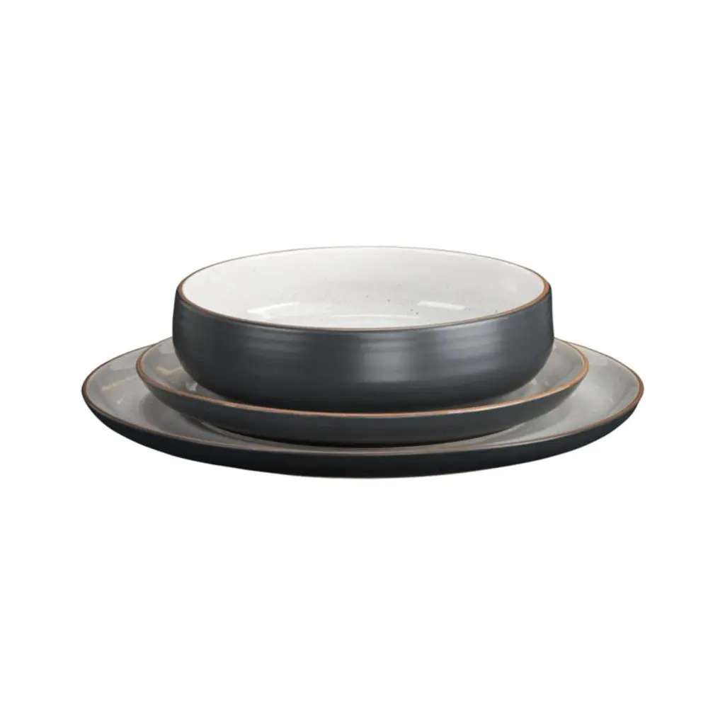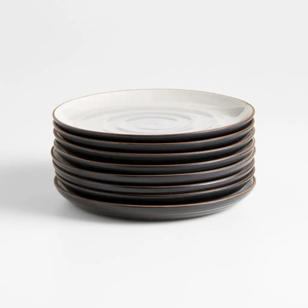 Modern and restrained in form, expressive and rustic in glaze. The artisan's hand is authentically reproduced in this stoneware pattern designed exclusively for Crate and Barrel by ceramic artist and designer Kathy Erteman at her 18th Street studio in New York City. A contemporary matte black exterior contrasts the rustic beauty of a shiny, speckled white glazed interior ringed with the subtly raised spiral associated with hand-thrown pieces. A raised clay rim features a sandy glaze that evokes the feel of exposed terra cotta. To capture the artisan look of this dinnerware, Erteman modeled prototypes to true scale by hand with her original glazes as reference for production. In the words of the designer, "When making tableware, I consider design and the rigors of daily use. The spirit of my hand in these pieces is modest, to harmonize with and act as a support to the prepared ingredients."