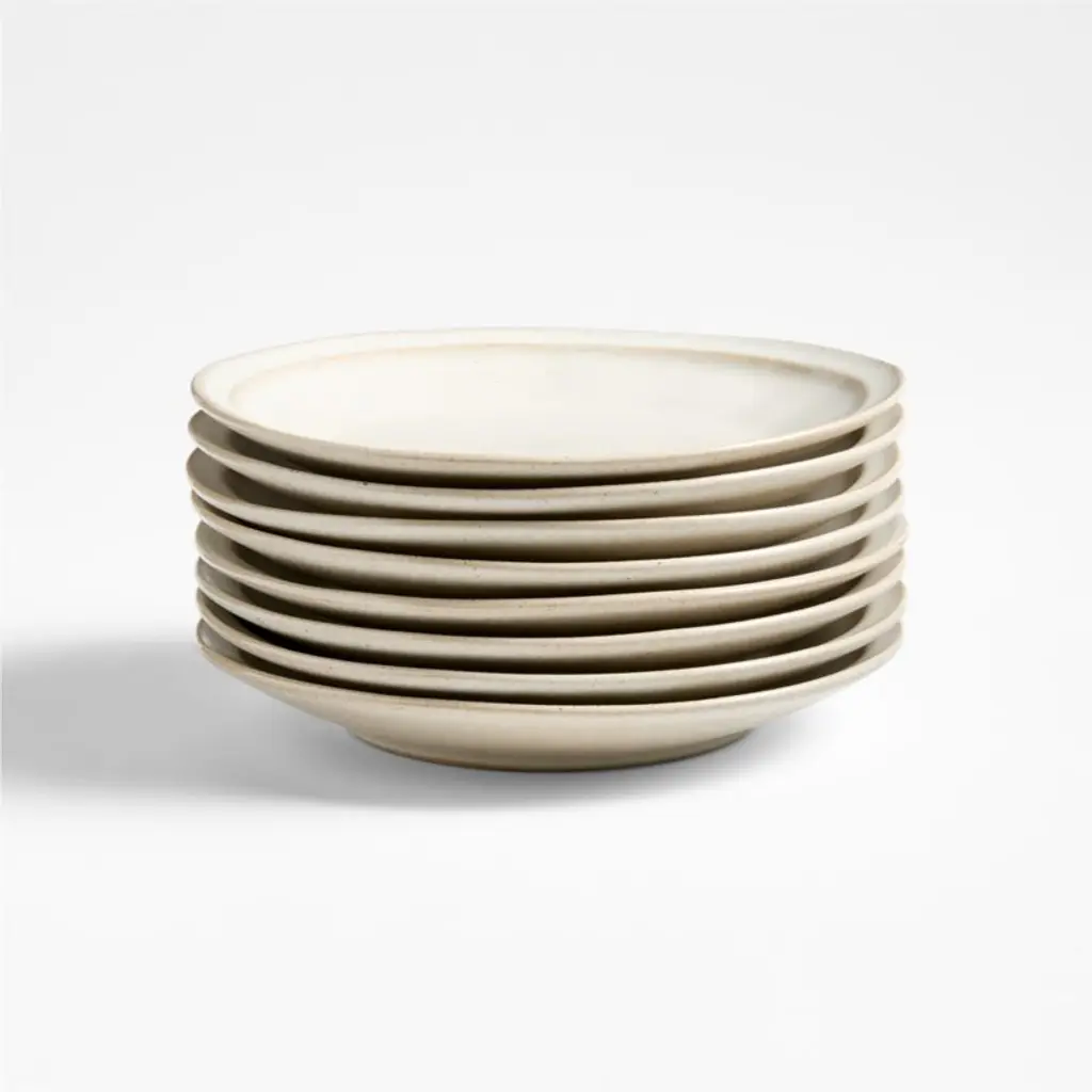 Modern and restrained in form, expressive and rustic in glaze. The artisan's hand is authentically reproduced in this stoneware pattern designed exclusively for Crate & Barrel by ceramic artist and designer Kathy Erteman at her 18th Street studio in New York City. The collection's salad plates have a contemporary matte black exterior that contrasts with the rustic beauty of a shiny, speckled white glazed interior ringed with the subtly raised spiral associated with hand-thrown pieces. Raised clay rims feature a sandy glaze that evokes the feel of exposed terracotta. To capture the artisan look of this dinnerware, Erteman modeled prototypes to true scale by hand with her original glazes as reference for production. In the words of the designer, "When making tableware, I consider design and the rigors of daily use. The spirit of my hand in these pieces is modest, to harmonize with and act as a support to the prepared ingredients." This set of eight salad plates serves pastries, salads, desserts and more.