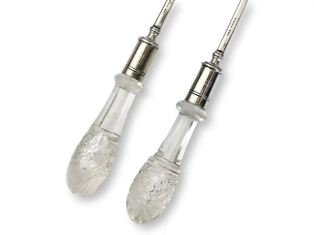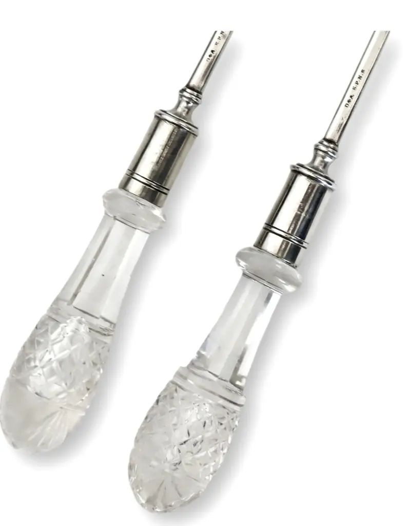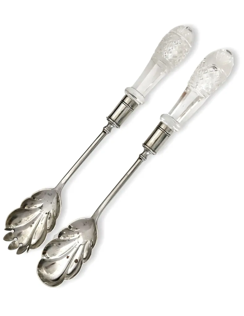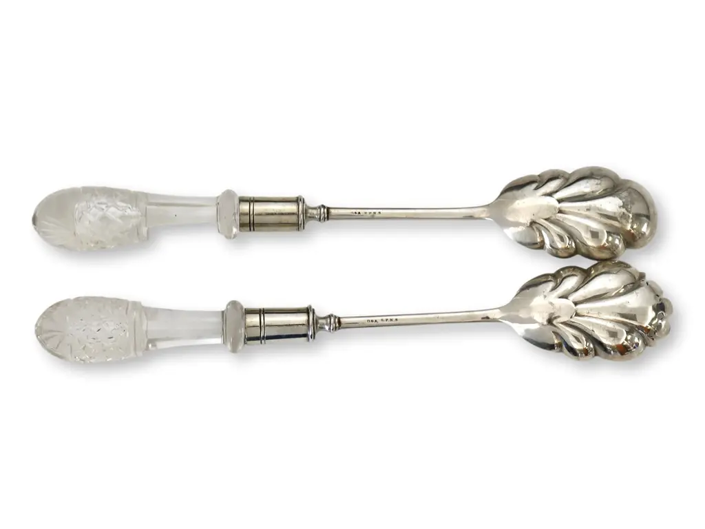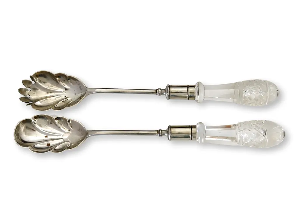 Heavy English crystal-handle salad servers made by Daniel Arter, Birmingham England (factory closed in 1930s). Perfect for serving salads or other culinary delights, these servers combine functionality with a touch of sophistication. Whether for everyday use or special occasions, they add a hint of vintage charm to your table setting. Marked on handles, EPNS (electroplated nickel silver) and maker's mark.