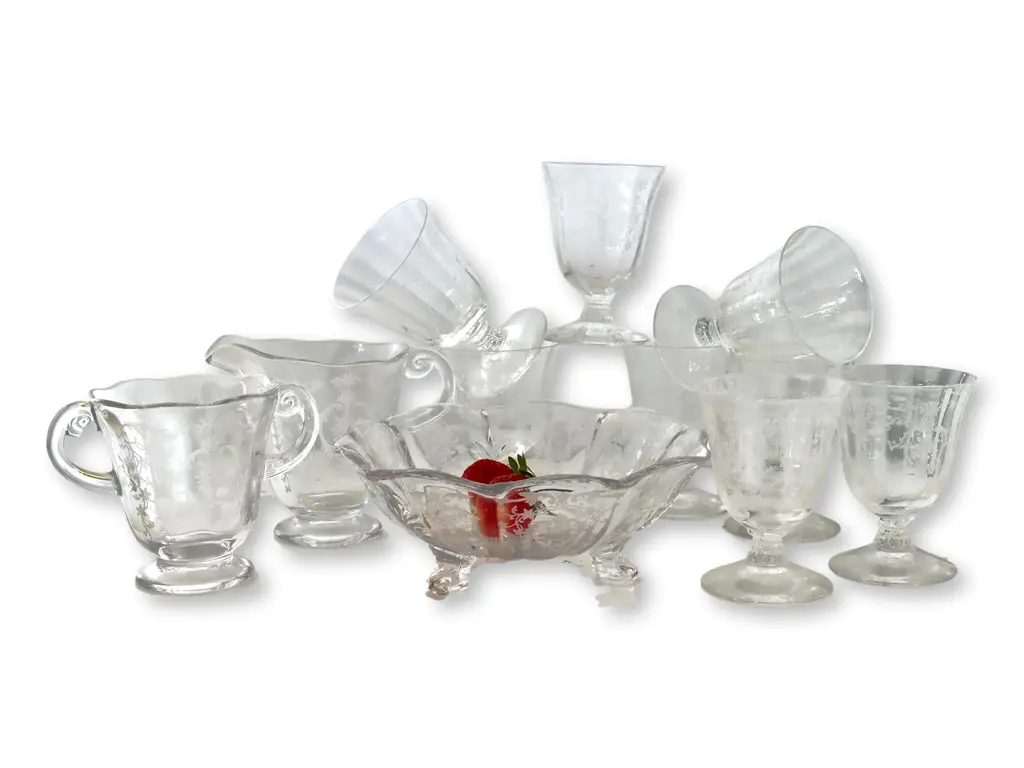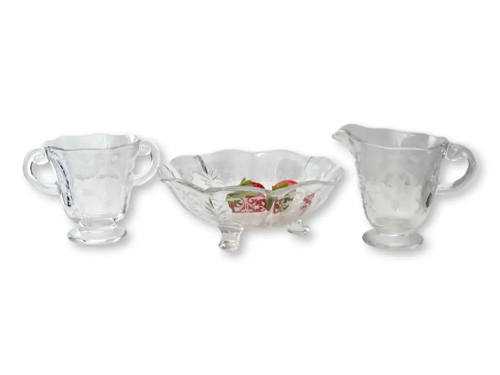 Eleven piece pattern glass strawberry & cream serving set. Includes eight cups, cream pitcher and sugar bowl. Dimensions: cups, 2.75"Dia x 3.75"H; pitcher, 5"L x 3.25"W x 4"H; sugar bowl, 5"L x 3.5"W x 3.75"H; bowl, 6.75"Dia x 2.5"H. No maker's mark.