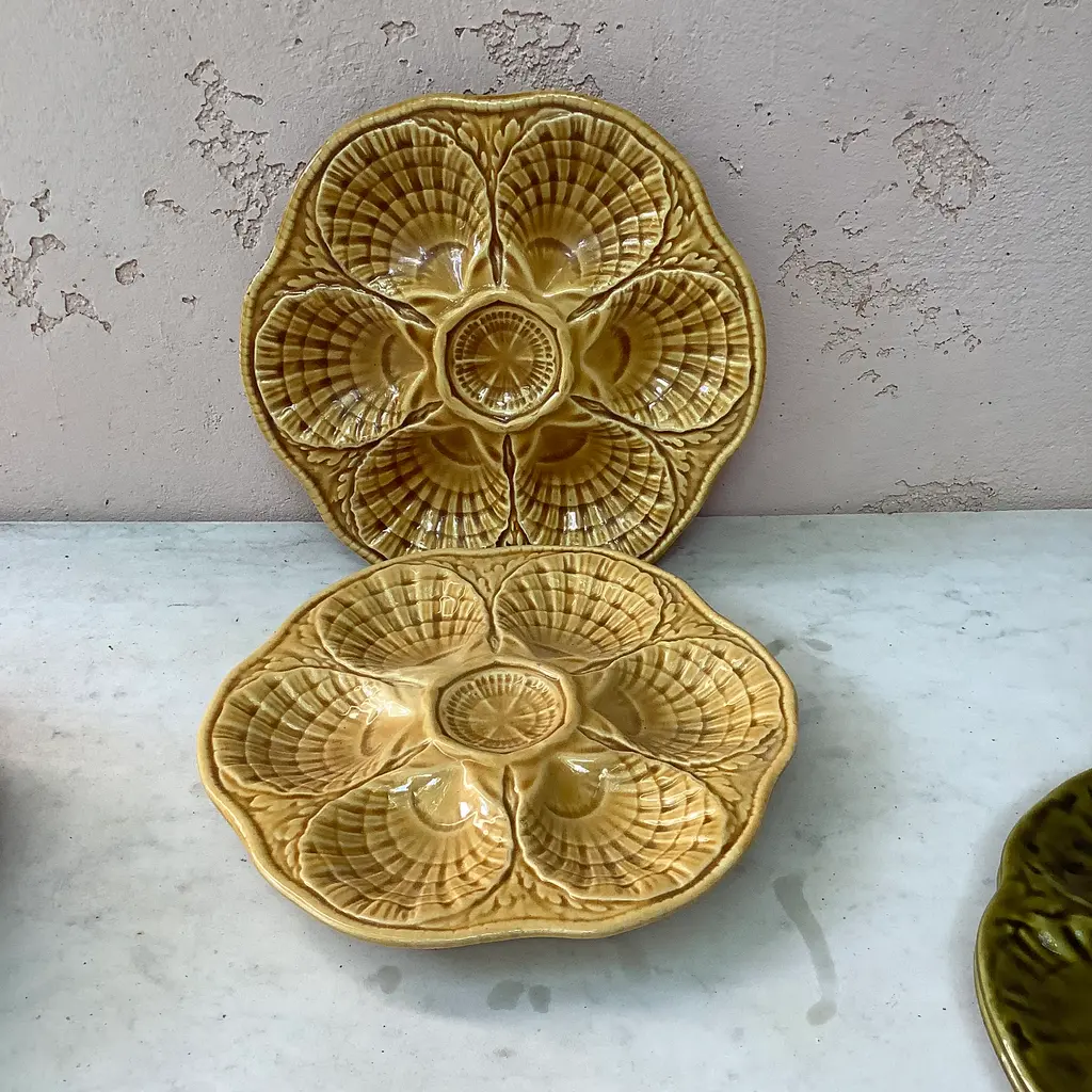 Majolica oyster plate signed Sarreguemines, circa 1930. Yellow mustard color. 6 plates are available.