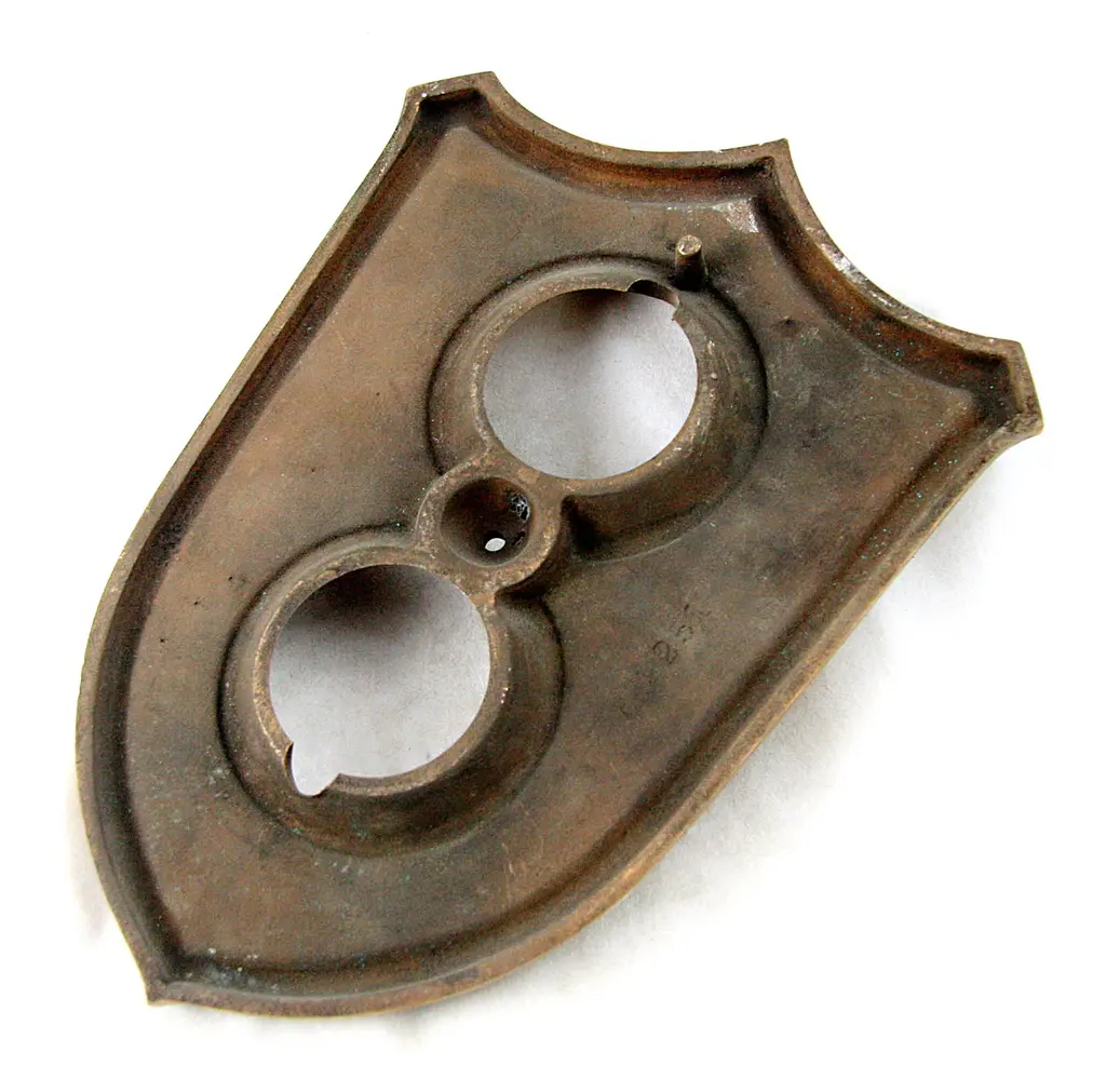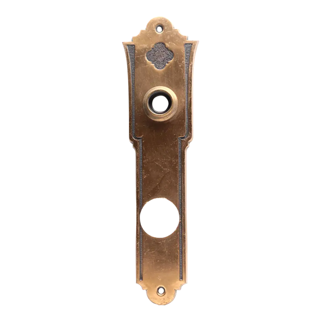 Art Deco style elevator indicator plates made of brass in an antique finish. Finishes vary. Good condition with surface wear from prior use. Priced each. The manufacturer and exact date of creation are unknown. The dimensions are 9.5 in. H x 6.25 in. W x 0.5 in. D.