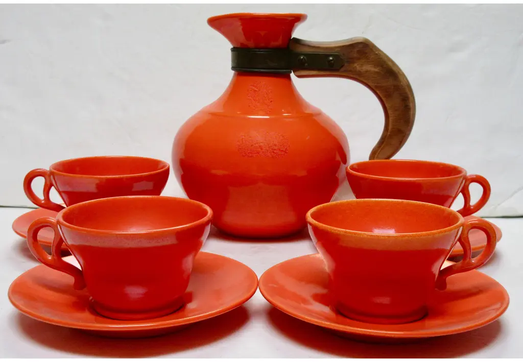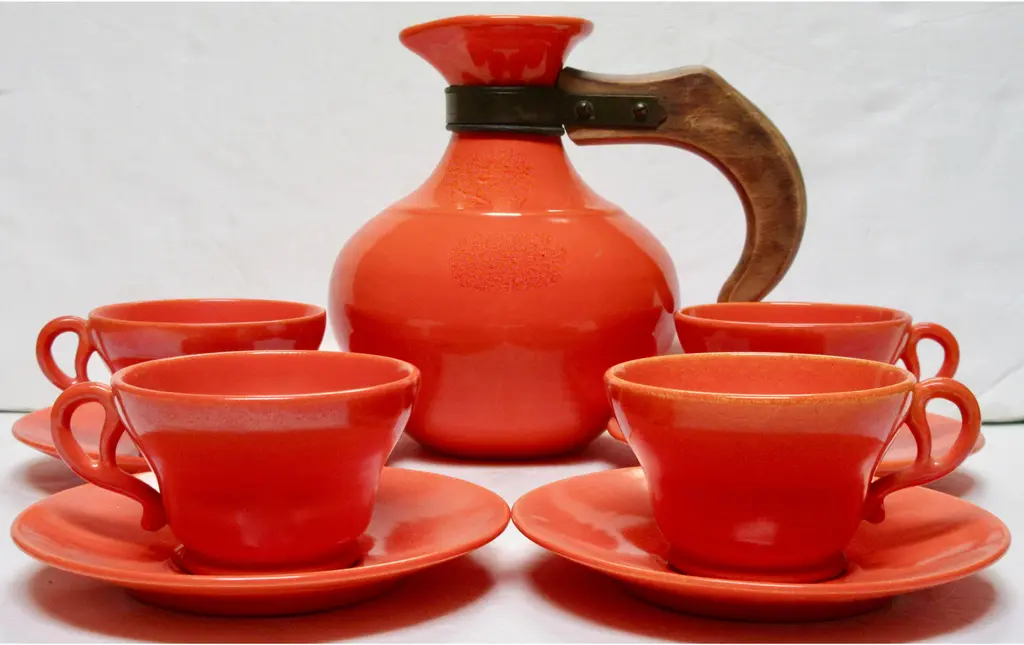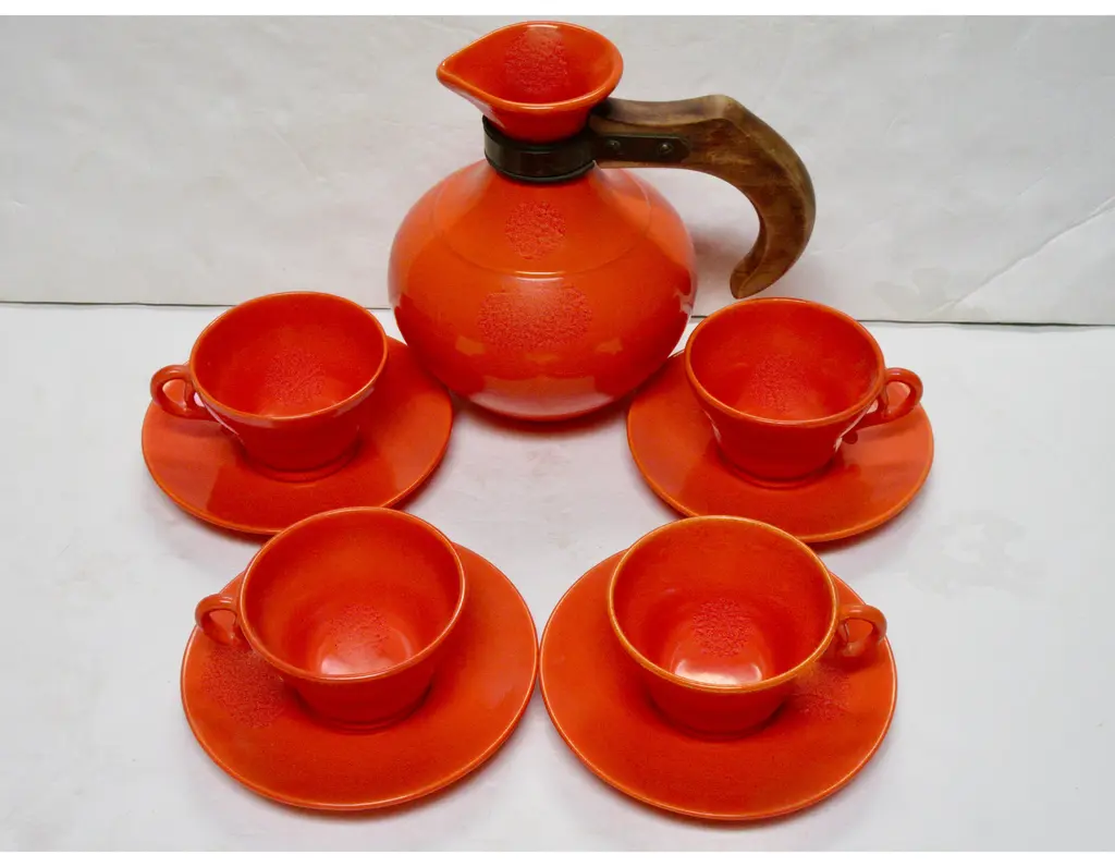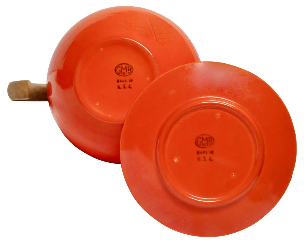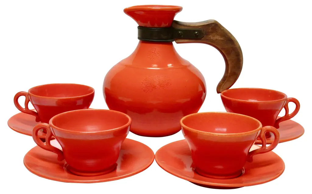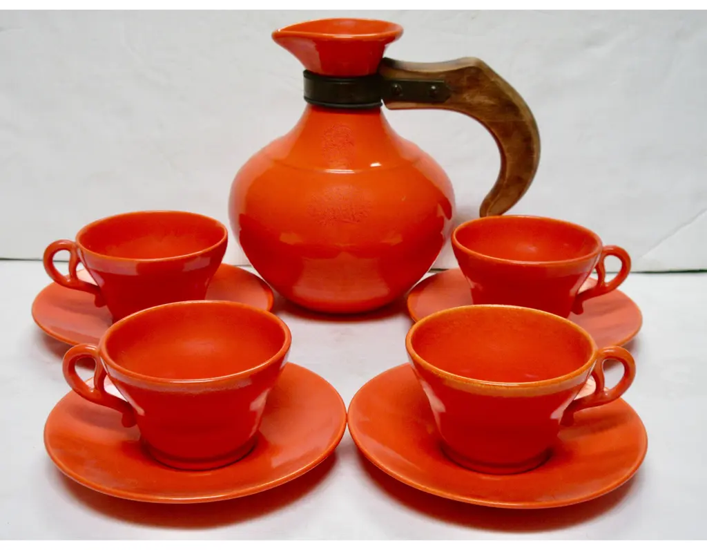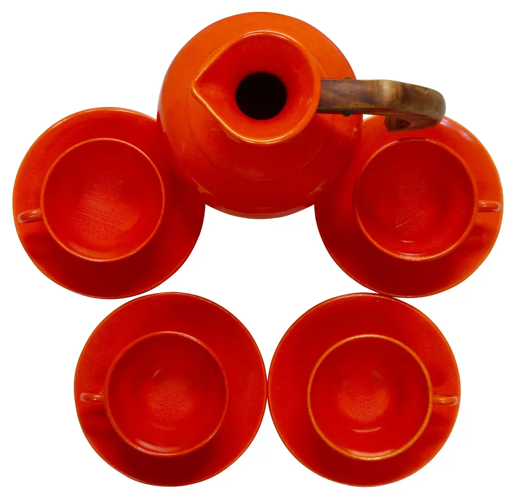 Iconic 1930s Gladding McBean California pottery coffee set includes four cups and saucers and a wood-handled carafe in flame orange glaze. Flame orange pieces were more costly than any other Gladding McBean colors and sold for a premium. Details include unique pretzel handles. Carafe and saucers marked "GMcB" and "Made in U.S.A.," marks used by Gladding McBean beginning in 1934. Carafe: 8"L x 5.5"W x 7.5"H; cups: 3.5"D x 2.25"H; saucers, 5.75"D x .75"H.