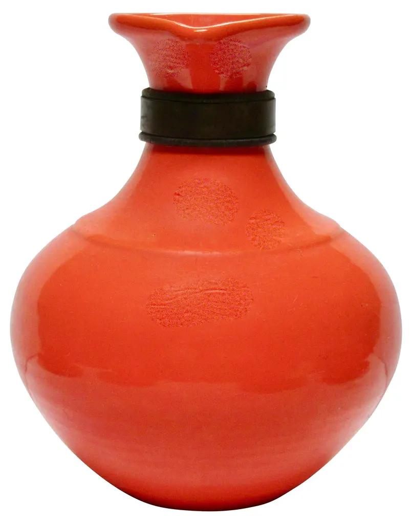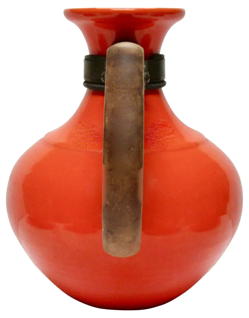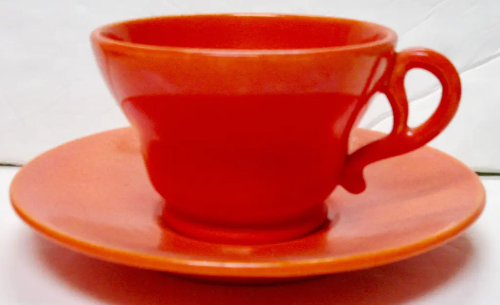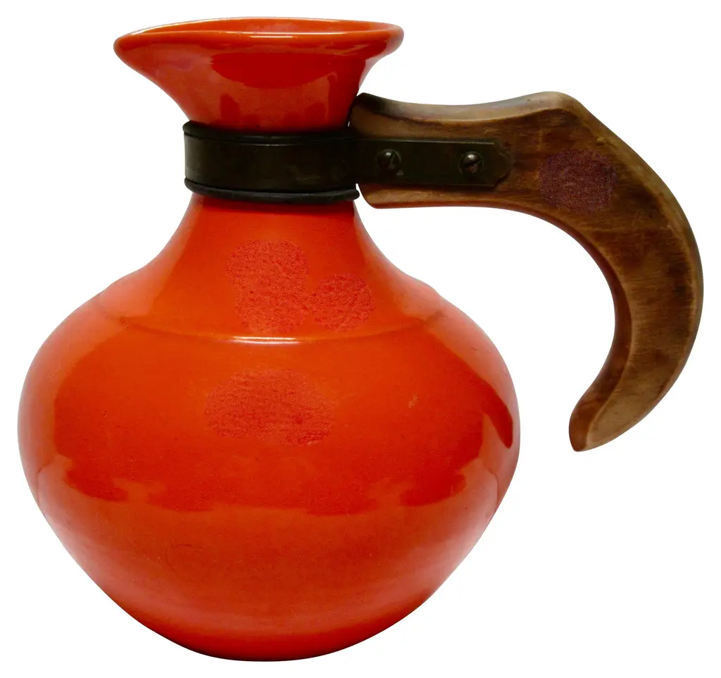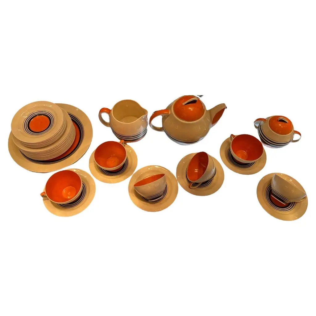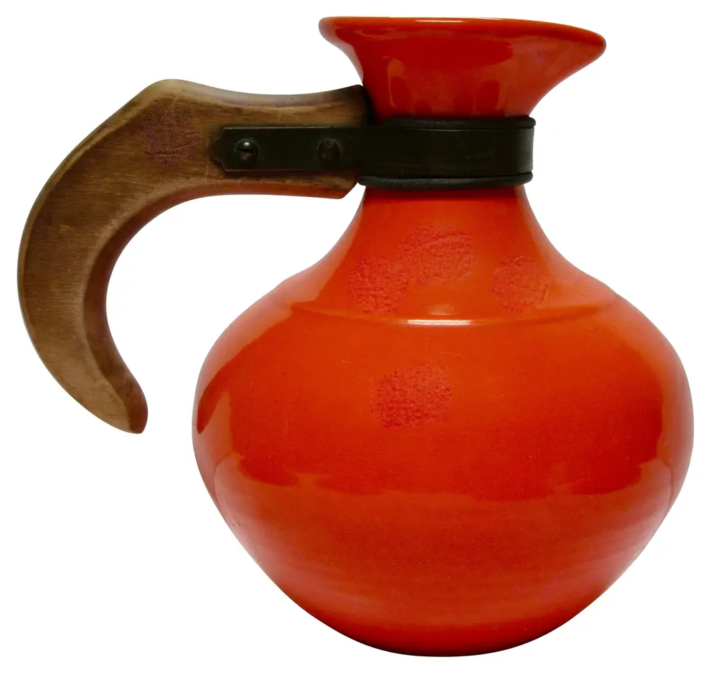 Iconic 1930s Gladding McBean California pottery coffee set includes four cups and saucers and a wood-handled carafe in flame orange glaze. Flame orange pieces were more costly than any other Gladding McBean colors and sold for a premium. Details include unique pretzel handles. Carafe and saucers marked "GMcB" and "Made in U.S.A.," marks used by Gladding McBean beginning in 1934. Carafe: 8"L x 5.5"W x 7.5"H; cups: 3.5"D x 2.25"H; saucers, 5.75"D x .75"H.