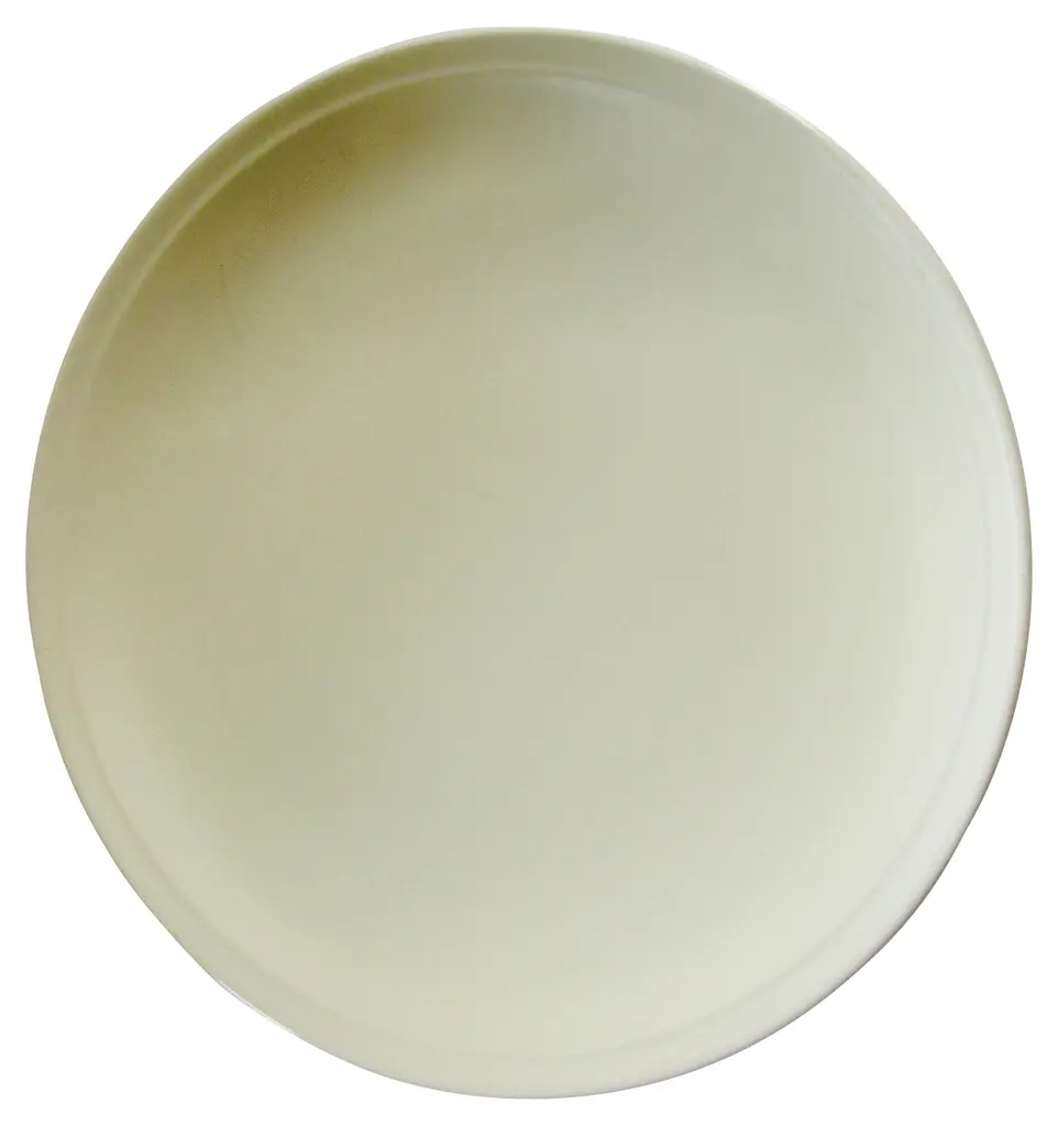 1930s Gladding McBean California pottery platter with rare banded rims and a rich ivory glaze. Marked "GMcB Made in U.S.A." in a mark used by Gladding McBean beginning in 1934. Utensil marks.