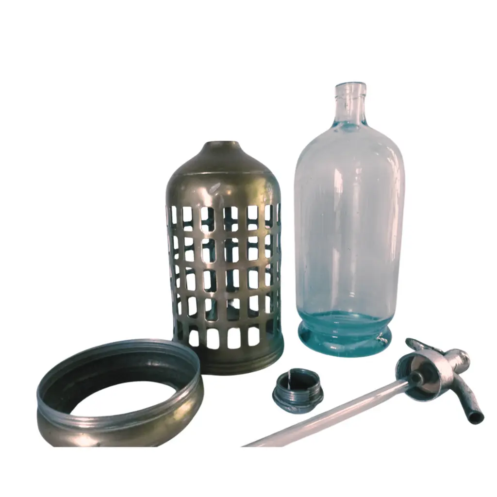 This 1930s French seltzer bottle, encased in an elegant silver-plate cage, is a beautiful representation of functional design from a bygone era. Perfect for adding a vintage touch to your home bar or as a unique decorative piece. Please note, the disassembled photo is for reference and does not represent this specific bottle. Fully marked with Paris insignias.