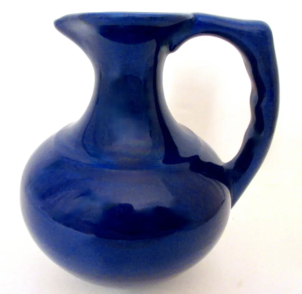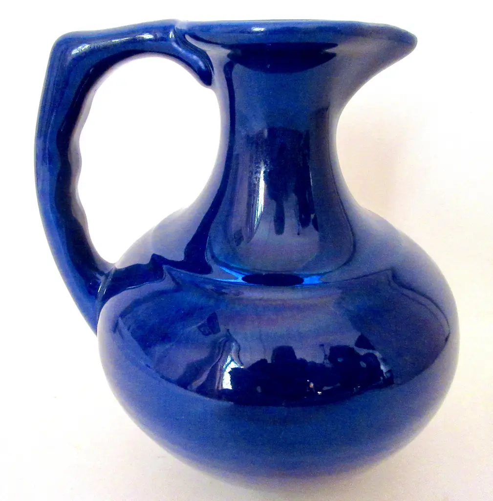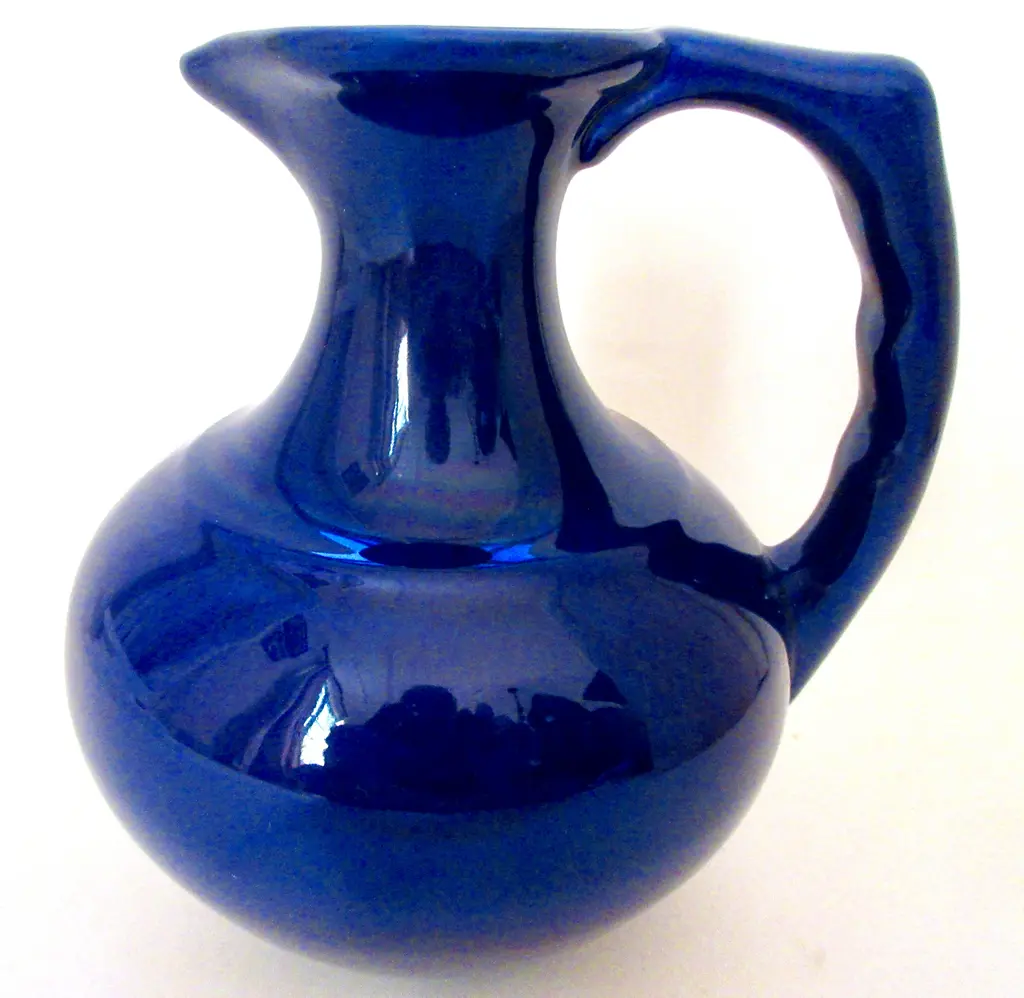 1930s Gladding McBean California Pottery carafe in the company's glossy Mexican blue glaze. Marked "GMcB" within an oval company mark used beginning in 1934.