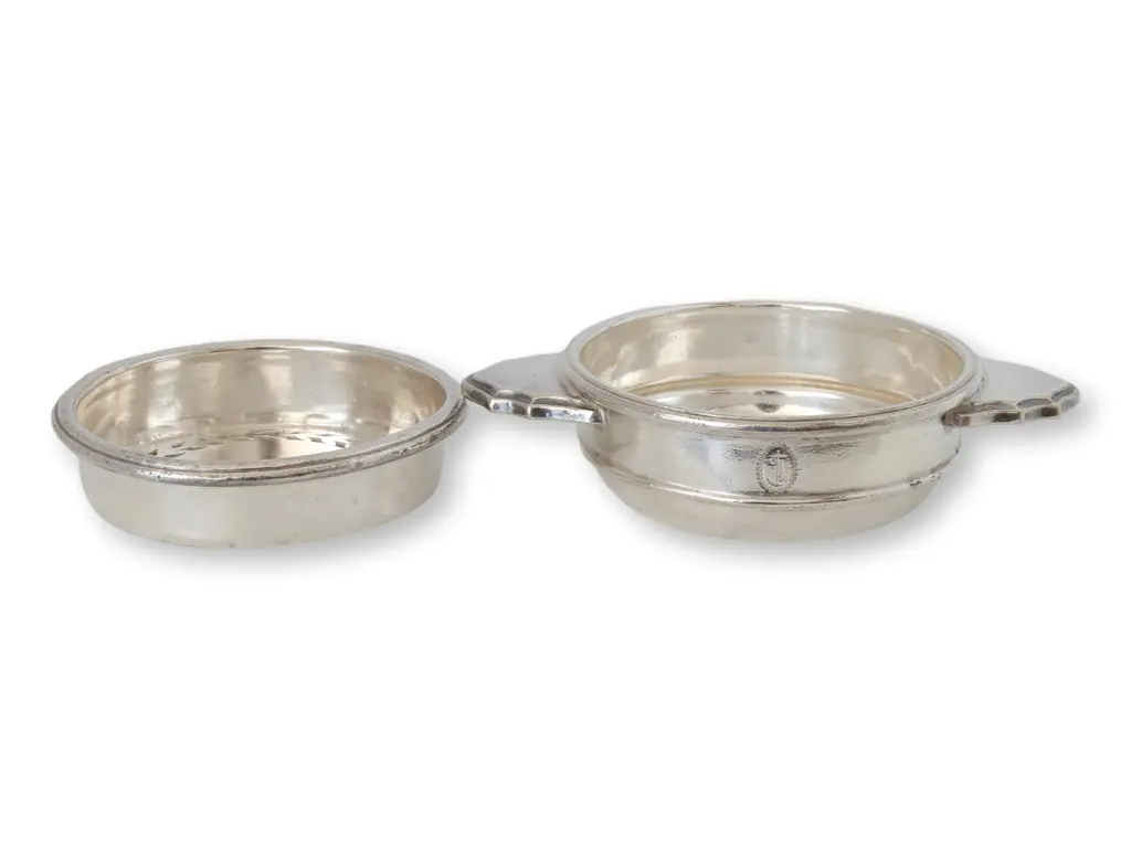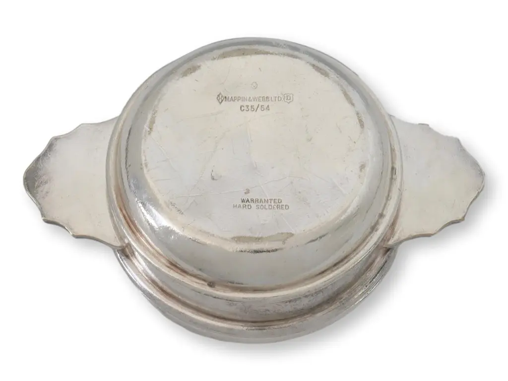 This midcentury chilled butter dish, crafted by renowned silversmiths Mappin & Webb, exemplifies the elegance of Art Deco design and fine dining. Made circa 1940s for the P&O SS line, it features a sleek, streamlined form with scalloped handles and a removable insert. The bottom holds crushed ice, helping to keep the butter cold during service. Marked on bottom.