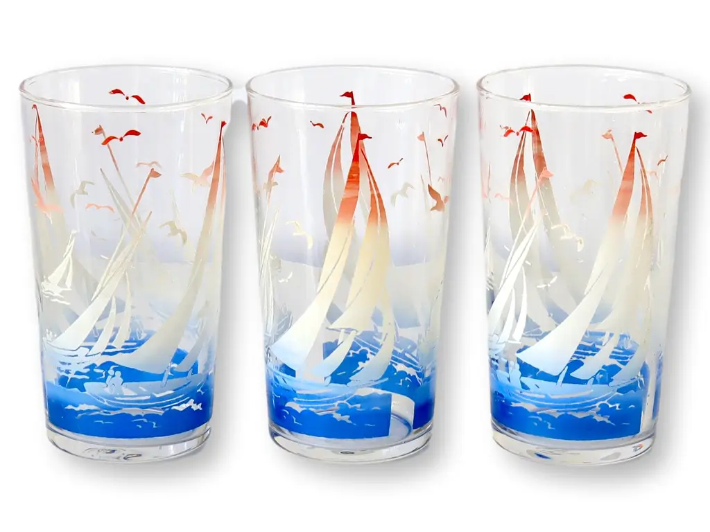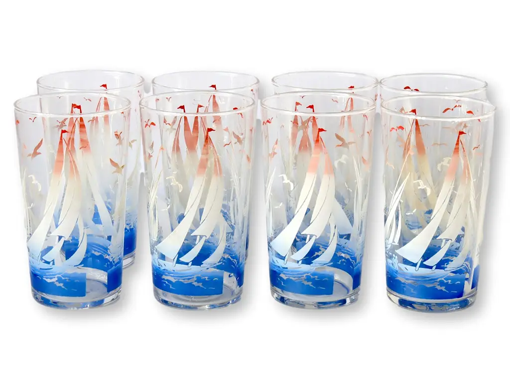 Dive into a midcentury aesthetic with our set of 8 beautifully crafted sailboat juice glasses. Each glass, boasting a unique, retro sailboat design, encapsulates the charm of the yesteryears. Perfect for your morning juice or evening cocktails, these glasses offer both practicality and style. Makers mark on underside.