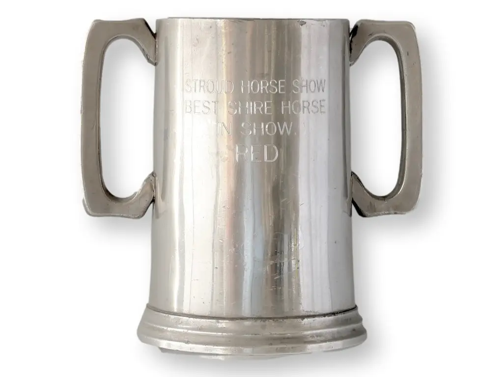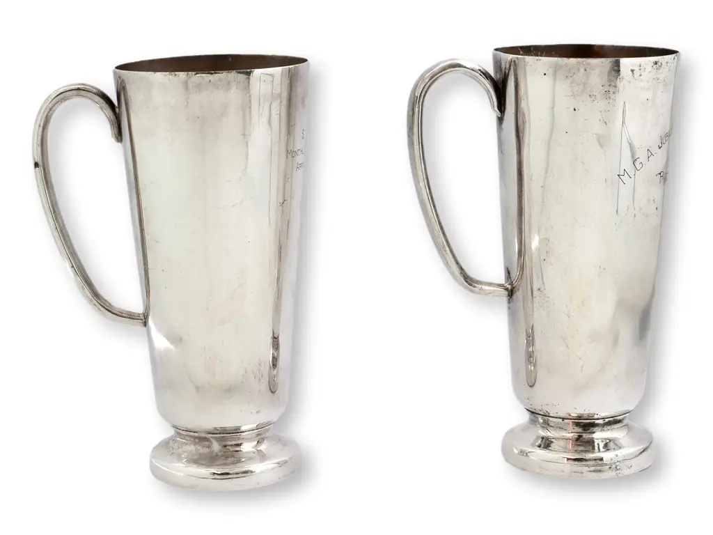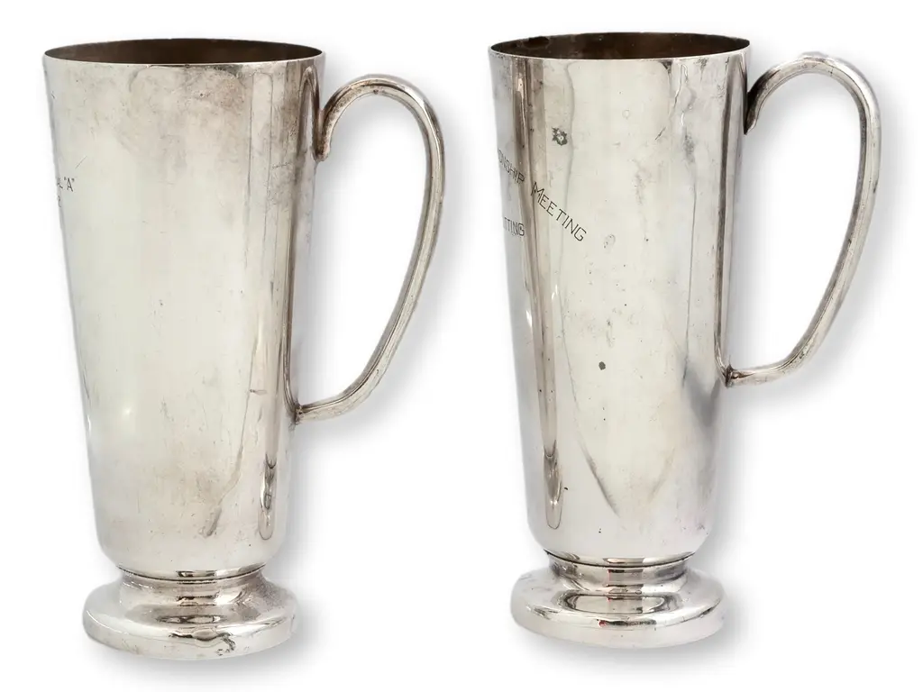 Pair of English silverplate golf trophies dated 1952, awarded for “Pitching & Putting” and “Monthly Medal” at S.G.C. (likely a private golf club). Both cups are tall pint-sized and tapered with stepped footed bases and elegant hand-engraved inscriptions. A charming example of postwar British sporting tradition, with timeless appeal for golf lovers and collectors alike. Beautiful left with patina, but can be polished to a brilliant shine. Marked on underside.