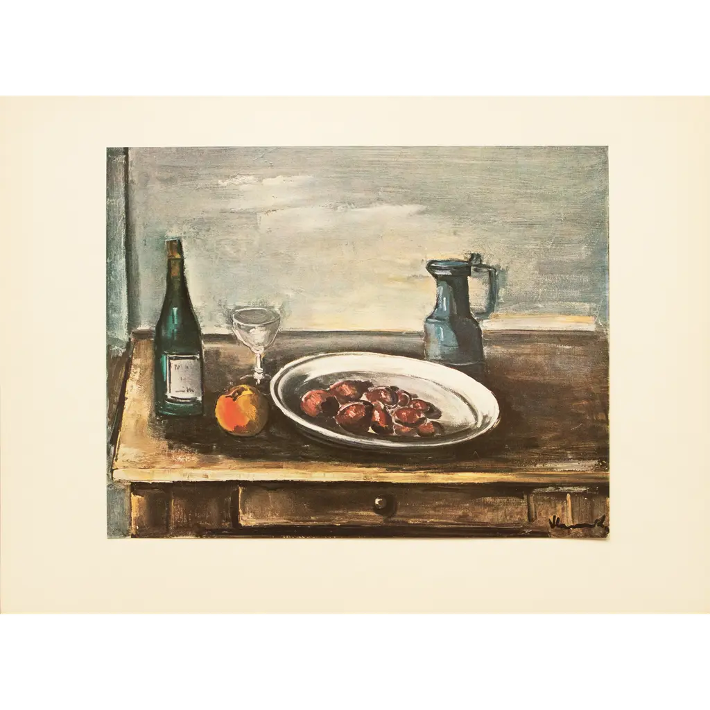 Title: Still life with a whisky bottle Artist: Maurice de Vlaminck Country: France Medium: Lithograph – 27 Marks: Signed in plate not numbered Paper Size: 12.50 x 9.50 inch Printed: 1958 by Mourlot Provenance: Vlaminck’s book Limited to 2000 Condition: Very Good Certificate of Authenticity Is Included Maurice de Vlaminck (1876–1958) was a French painter known for his intense use of color. He is considered one of the principal figures in the Fauvism movement, along with André Derain and Henri Matisse.