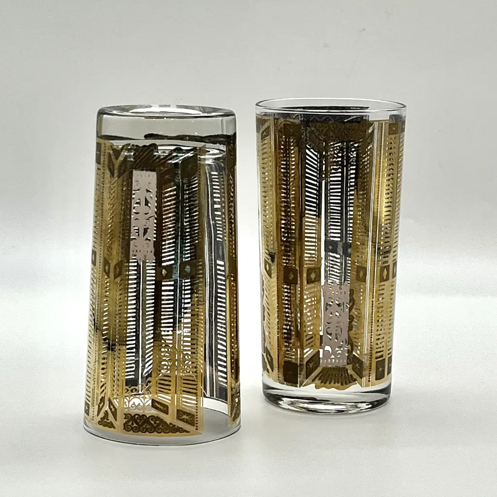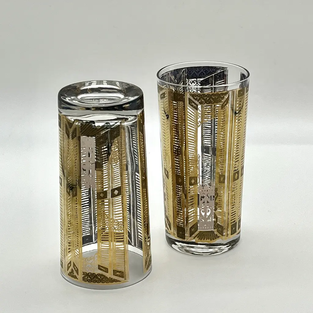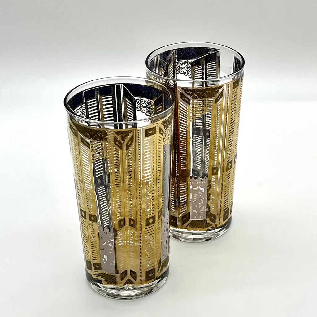 Rare pair of c. 1960s high ball cocktail glasses or tumblers attr. to Culver Glass. 22K gold overlay pattern featuring slatted piazza doors, opened and closed. The open doors appear to look into an exterior scene with scrolled gates. Interior of glass shows beautiful gray-blue base of 22K gold overlay. A unique and beautiful mid-20th century cocktail set for two. 5.5"H x 2.75"Dia. each. Excellent, pristine vintage condition.