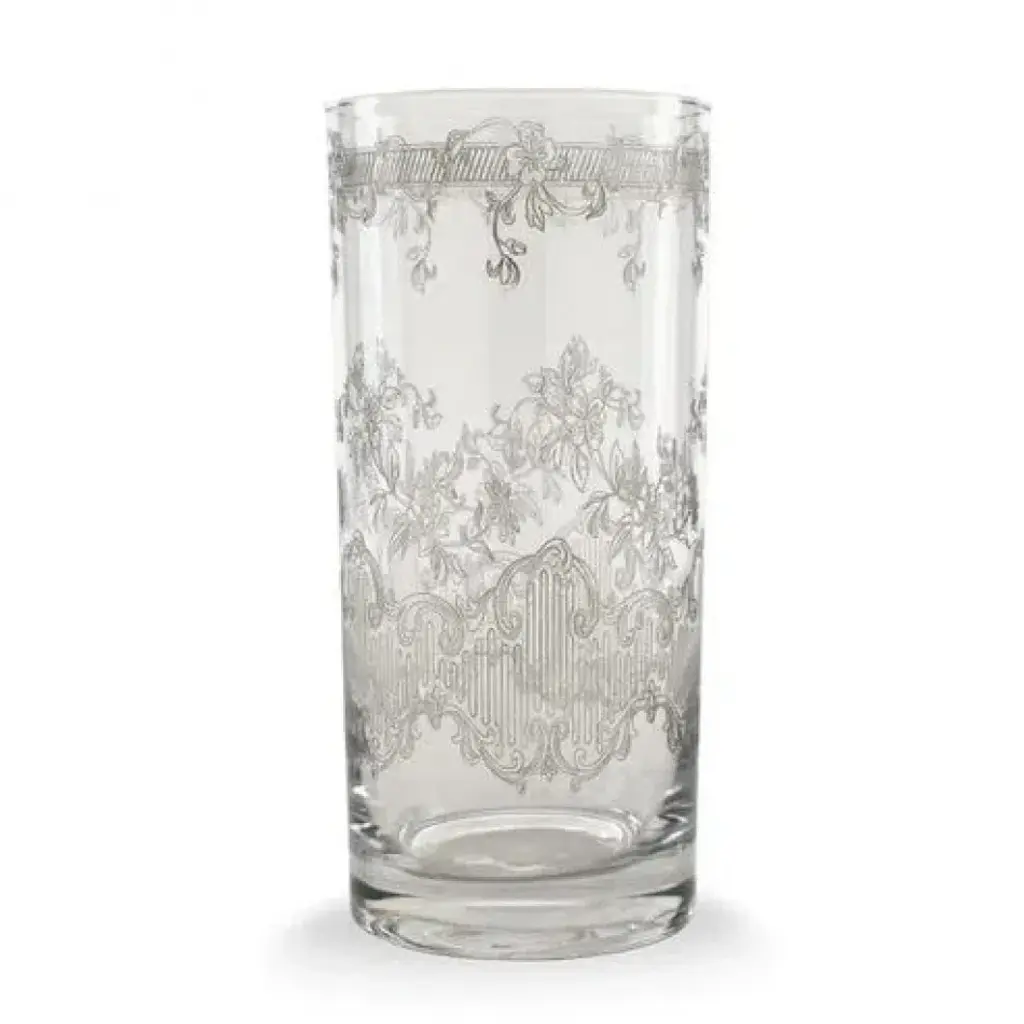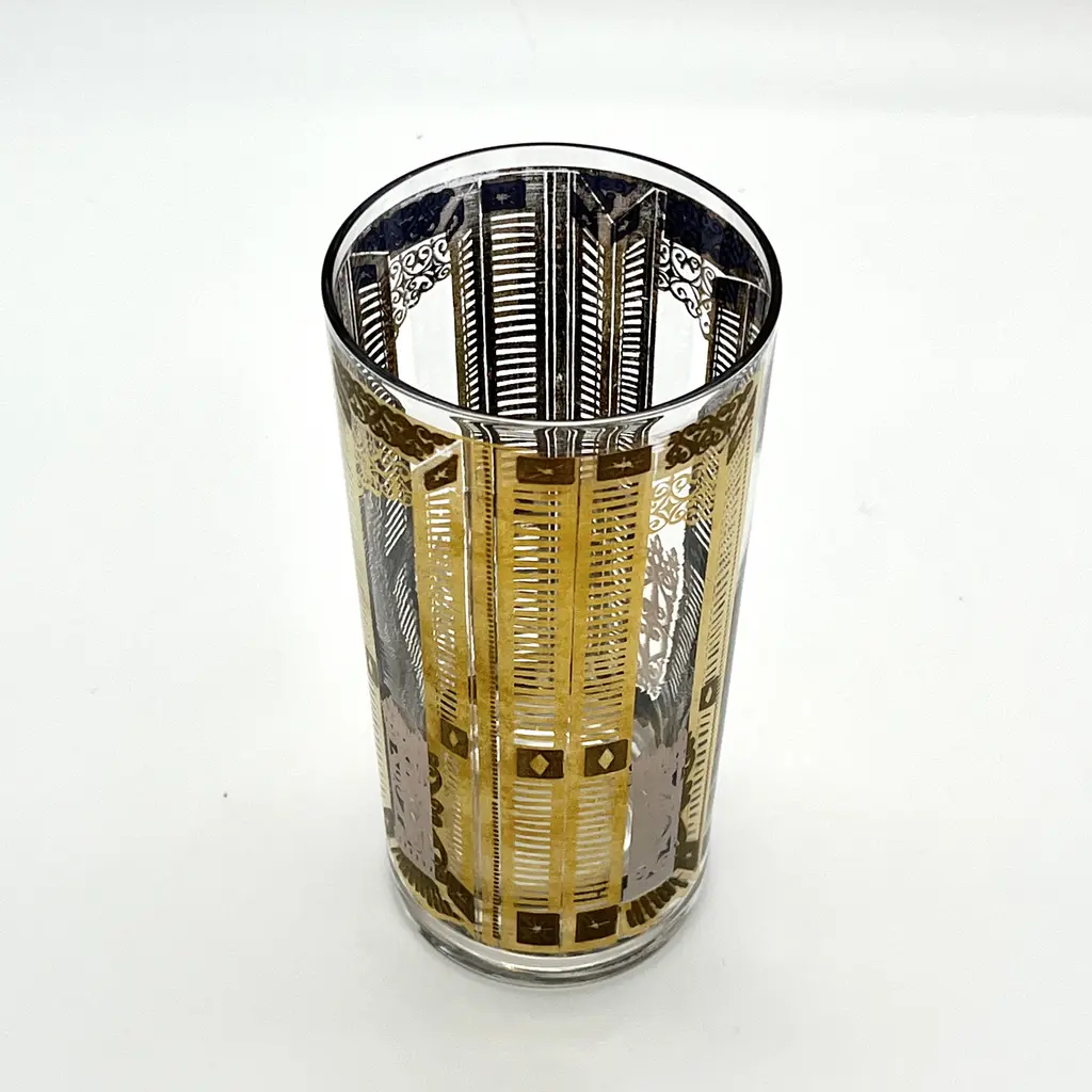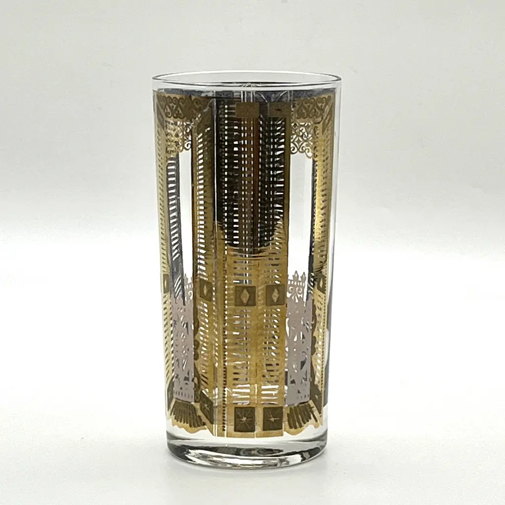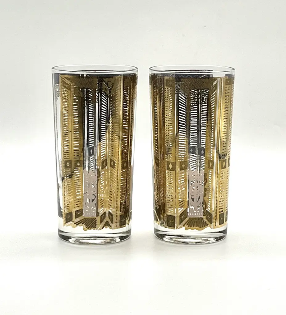 Rare pair of c. 1960s high ball cocktail glasses or tumblers attr. to Culver Glass. 22K gold overlay pattern featuring slatted piazza doors, opened and closed. The open doors appear to look into an exterior scene with scrolled gates. Interior of glass shows beautiful gray-blue base of 22K gold overlay. A unique and beautiful mid-20th century cocktail set for two. 5.5"H x 2.75"Dia. each. Excellent, pristine vintage condition.