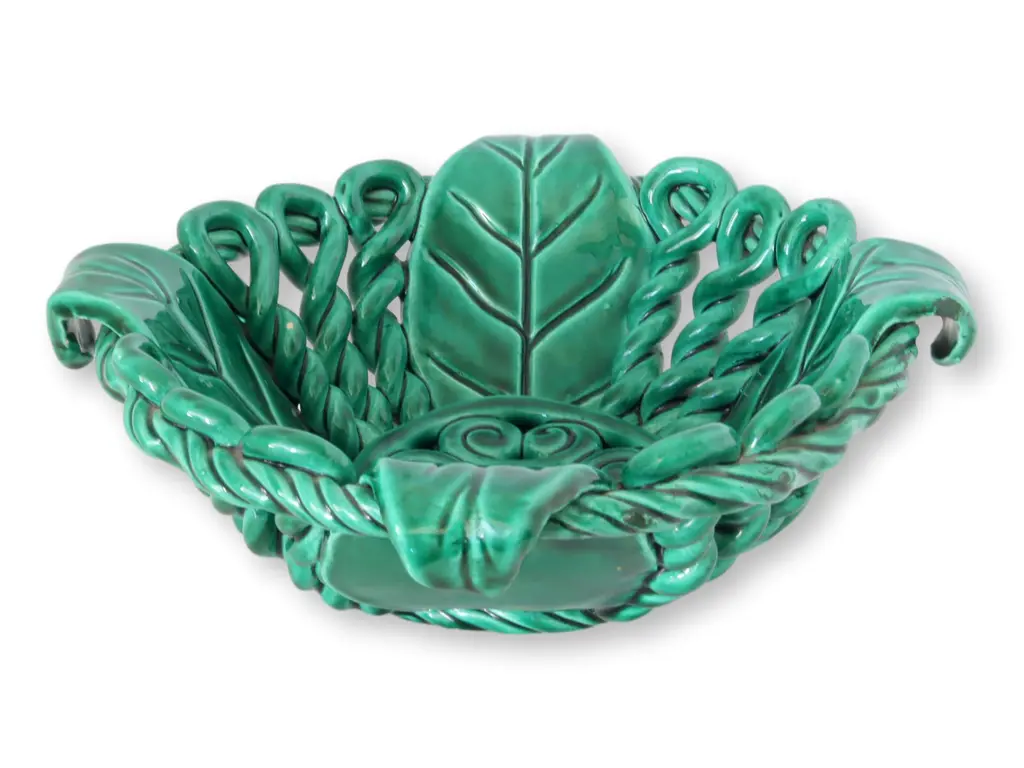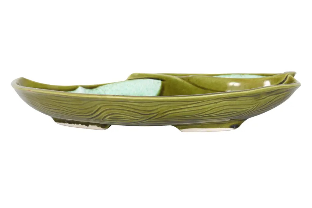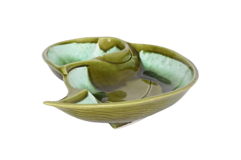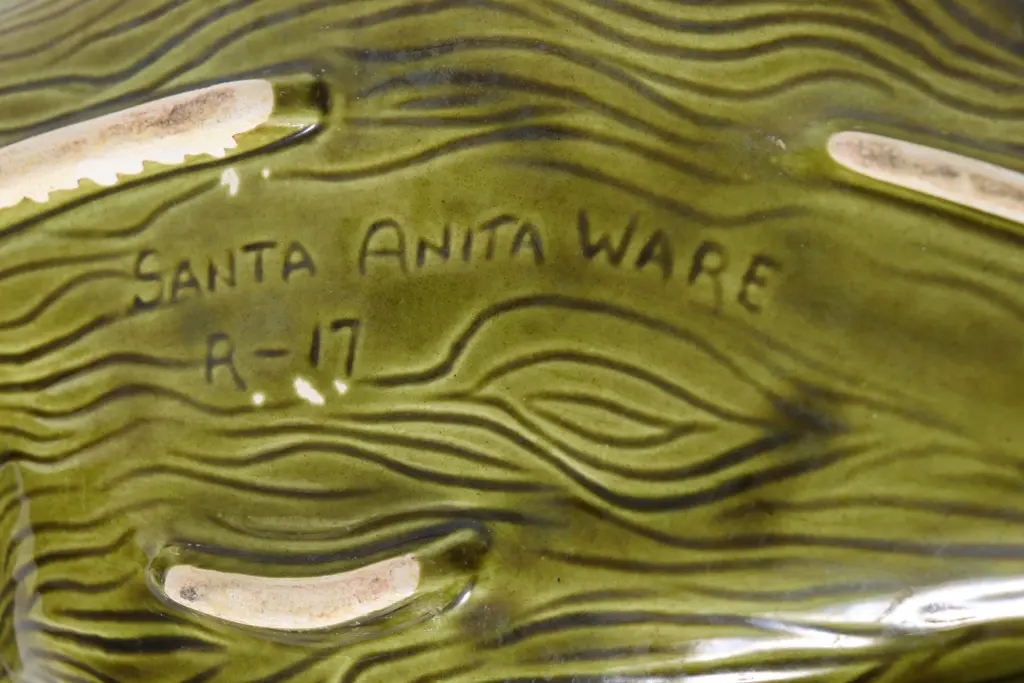 A mid century modern ceramic serving dish circa 1960, drip glazed in vibrant green hues and shaped like two adjacent leaves. Signed underneath �������Santa Anita Ware R-17��.