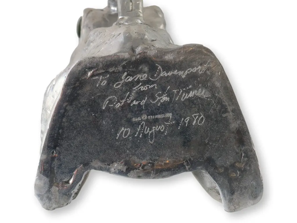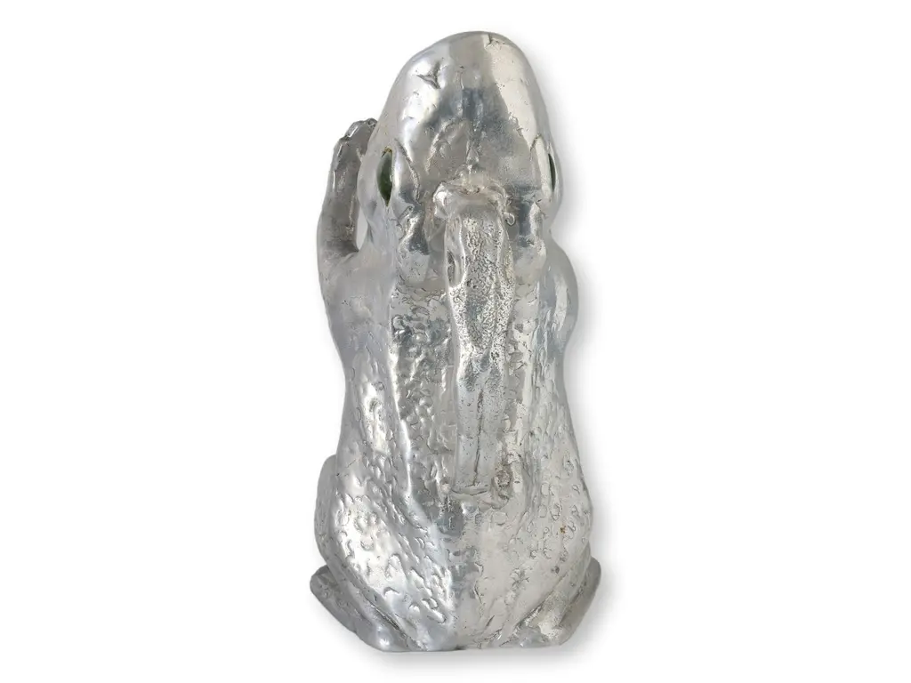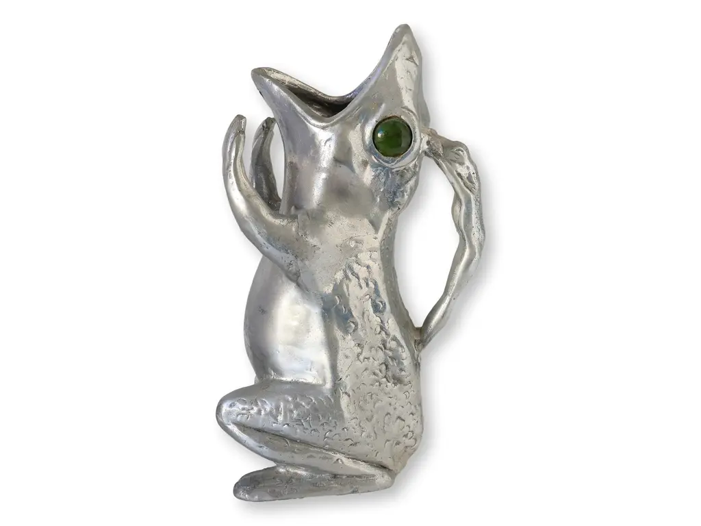 A whimsical and highly collectible piece from Arthur Court’s nature-inspired designs. This charming figural pitcher takes the form of a crouching frog, mouth open wide for pouring, with textured details mimicking amphibian skin and striking green glass eyes. Crafted from signature cast aluminum, it is both sculptural and functional. A fantastic conversation piece for entertaining or display. Dated 1979, Signed on the base in dedication in 1980.