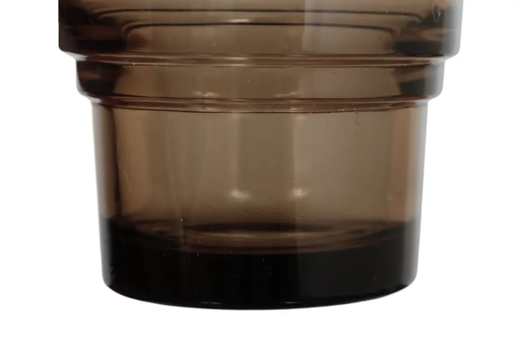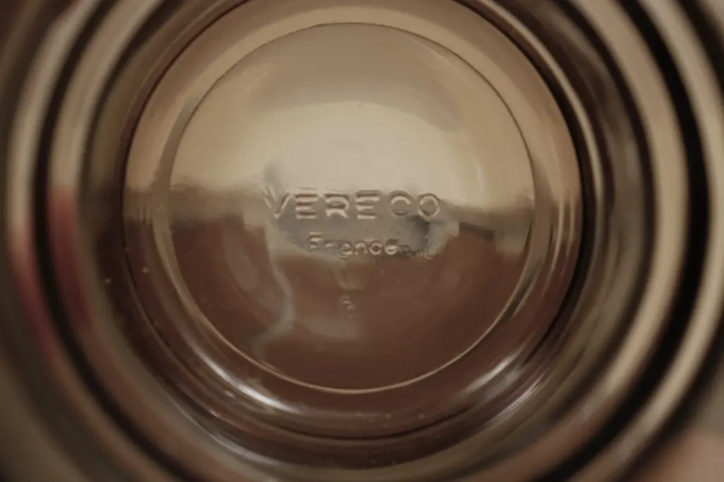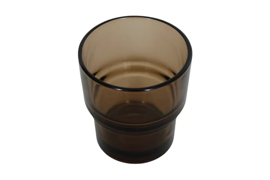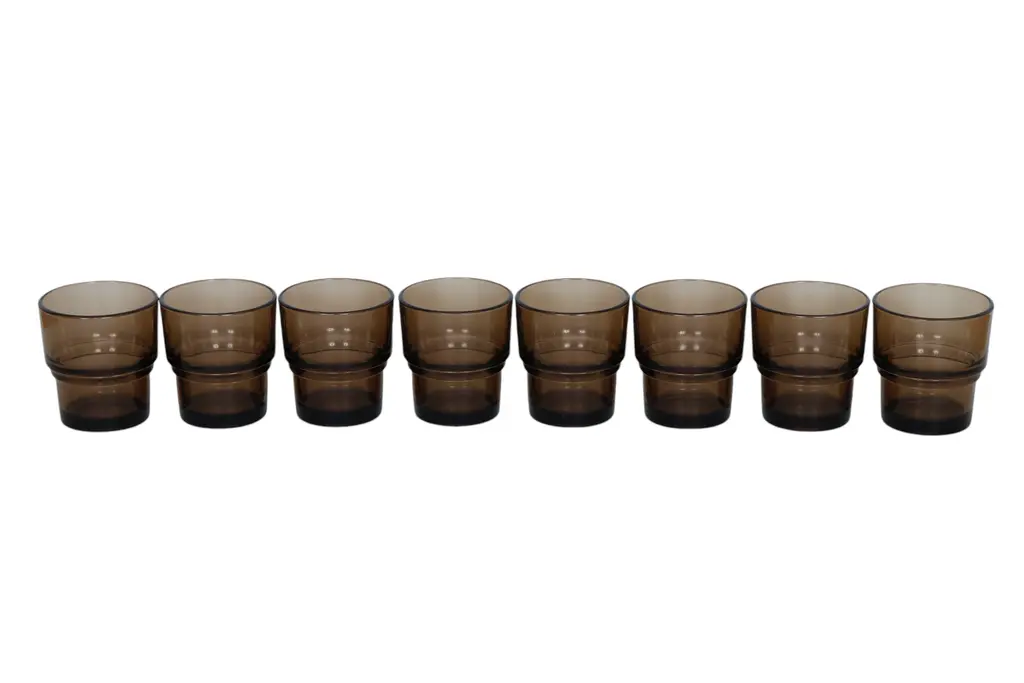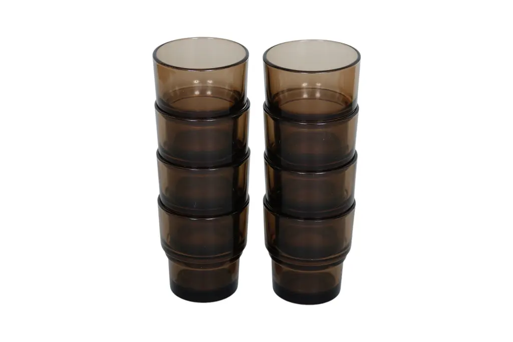 A set of eight French drinking glasses from the 1970’s, made by Vereco. Smoked glass is stepped halfway down making them easily stacked. Marked ‘Vereco France’ underneath.
