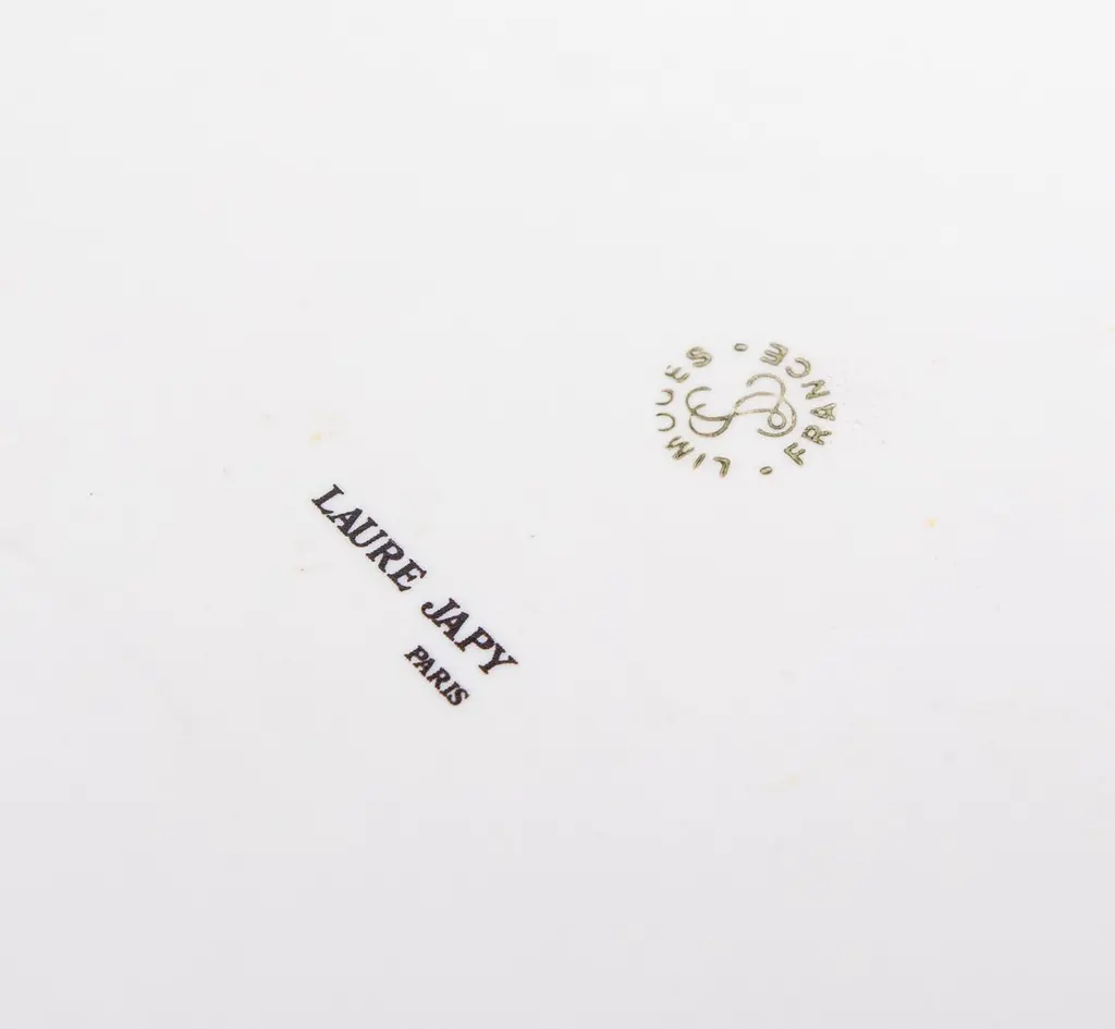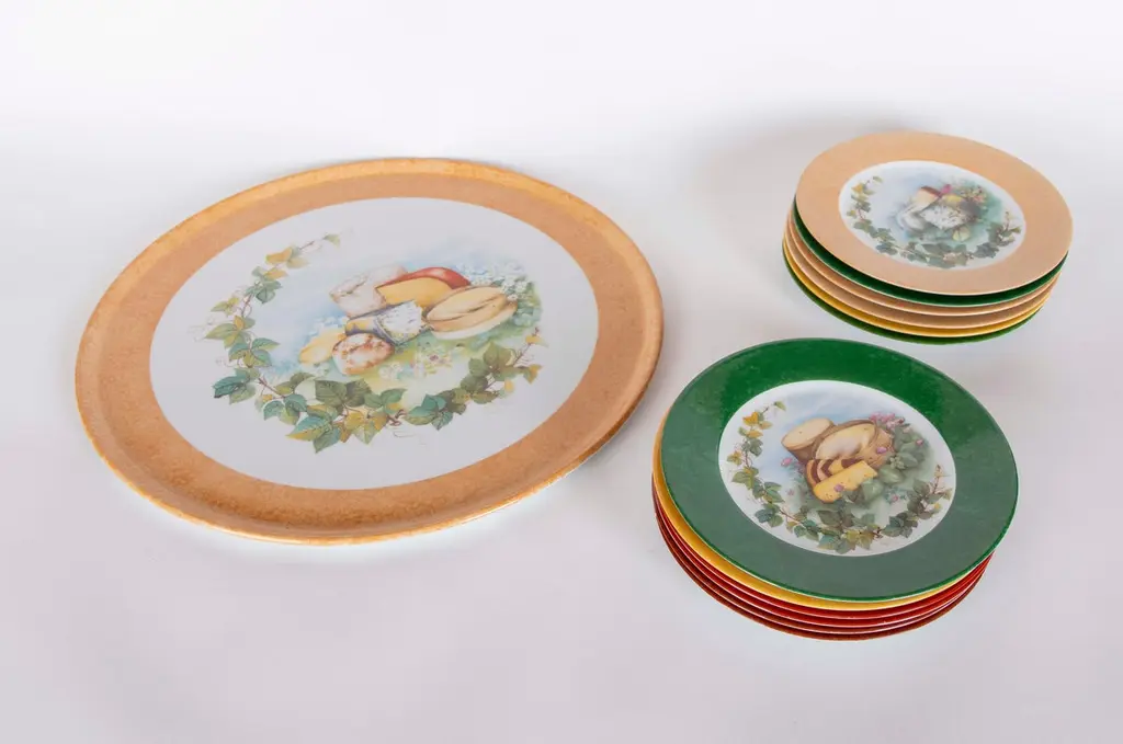 Set of Laure Japy limoges ceramic plates decorated with illustrations of cheese and fruit in a natural setting, surrounded by leaves and flowers. The set includes a large plate with rim in warm tones and several small plates with rims in vibrant colors such as green, yellow and red, creating an attractive visual contrast.Ideal for serving appetizers or as decorative pieces on rustic or country style tables, this set combines functionality with an artistic design inspired by nature. Perfect for cooking and themed decor lovers.Dimensions large plate: 37x2cmSmall plate dimensions: 18x2cm