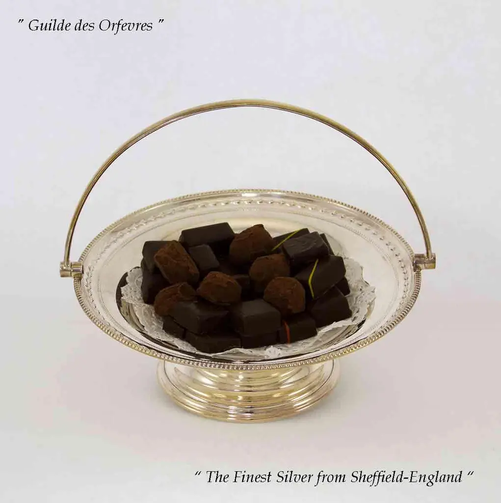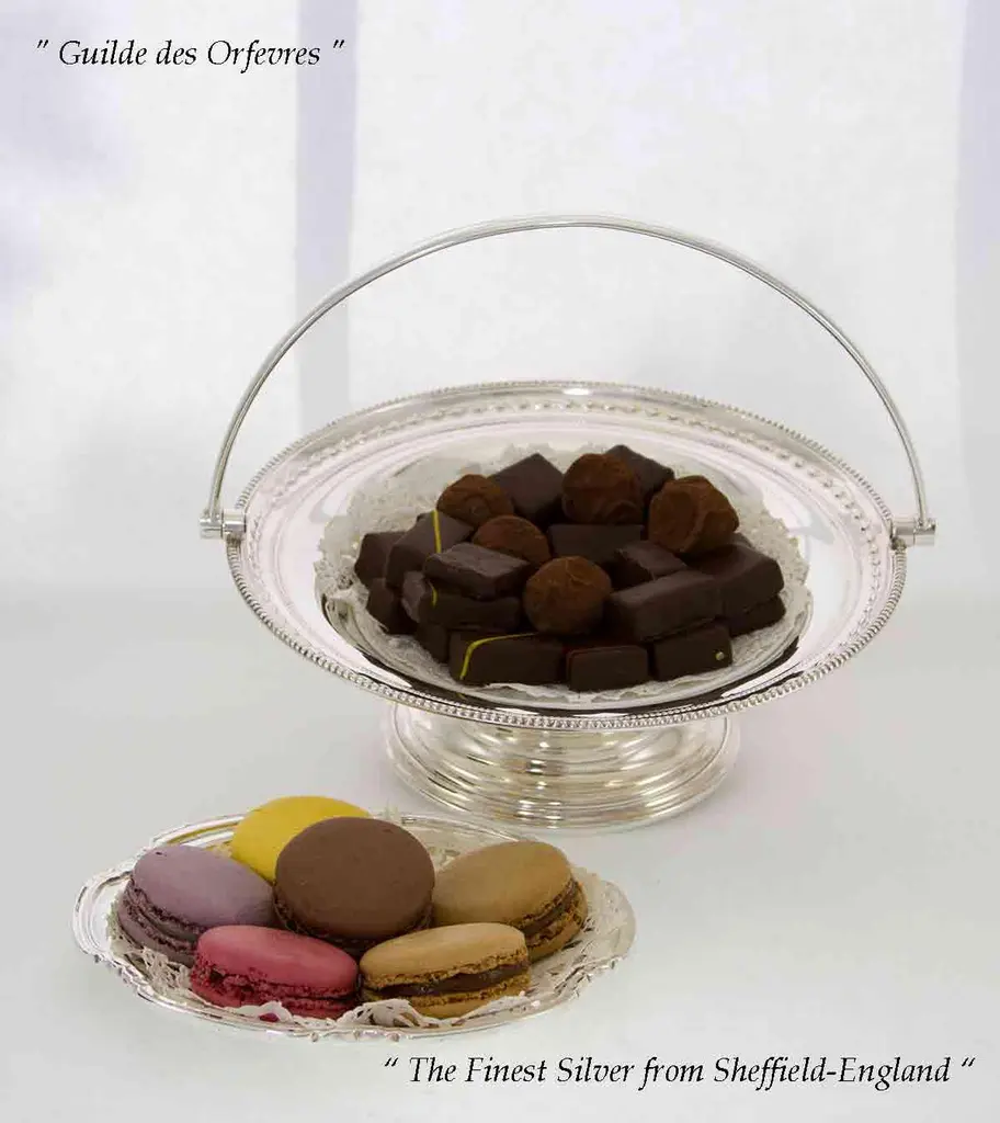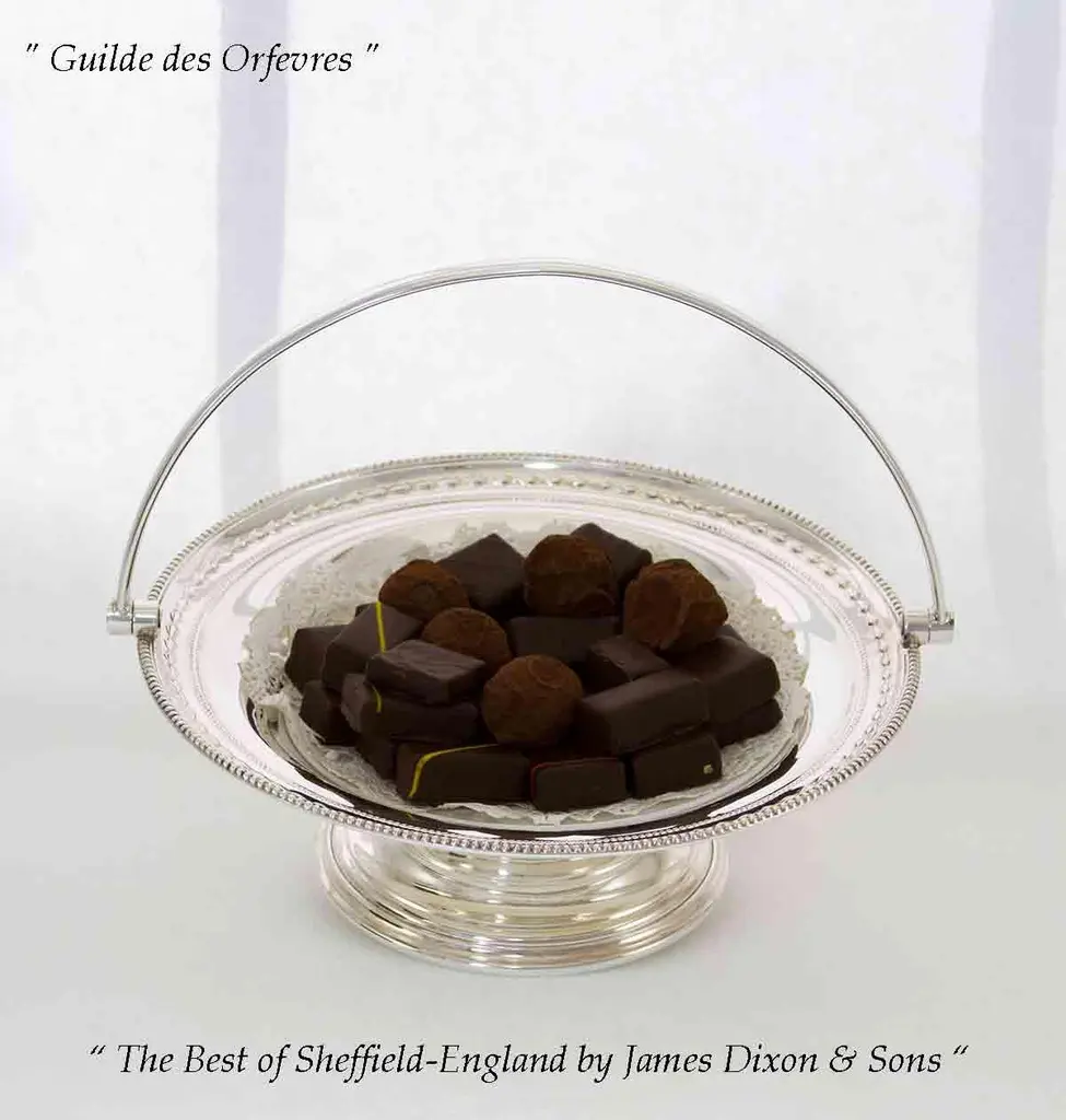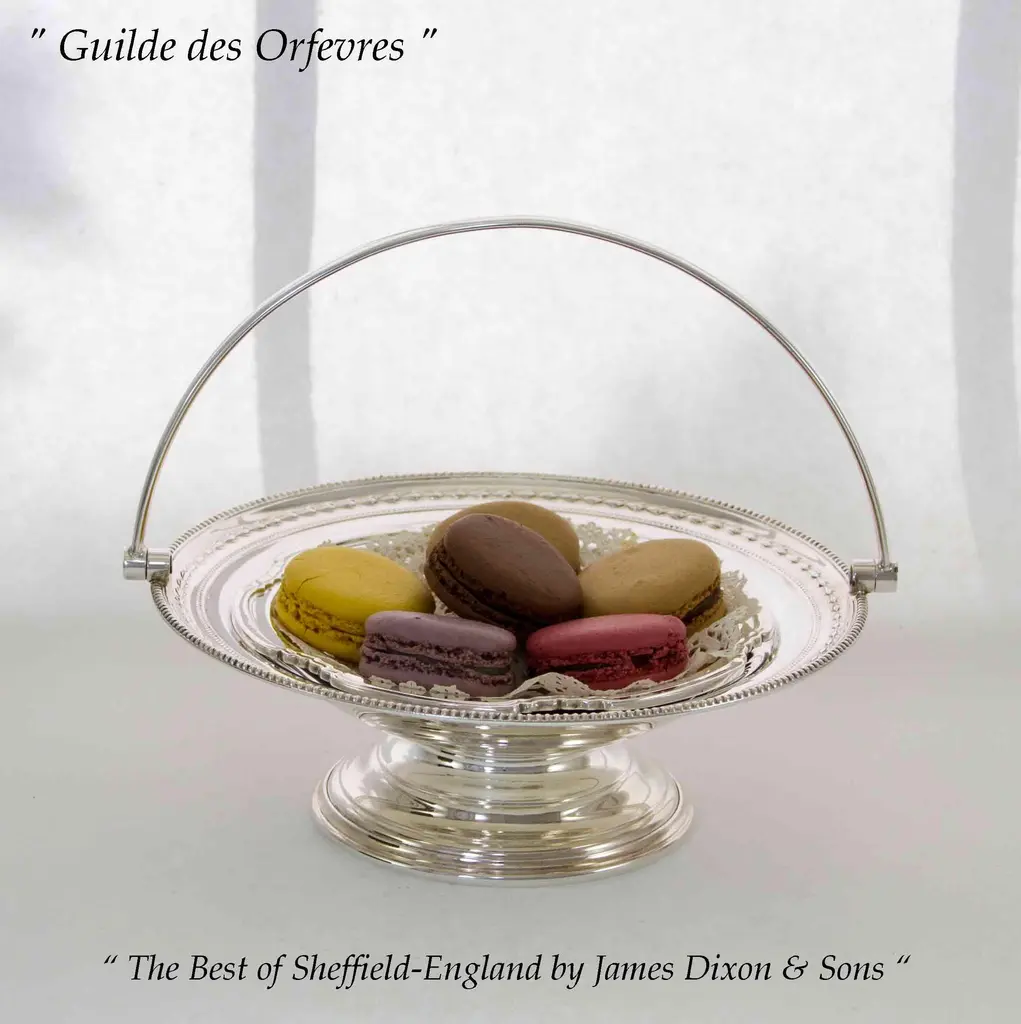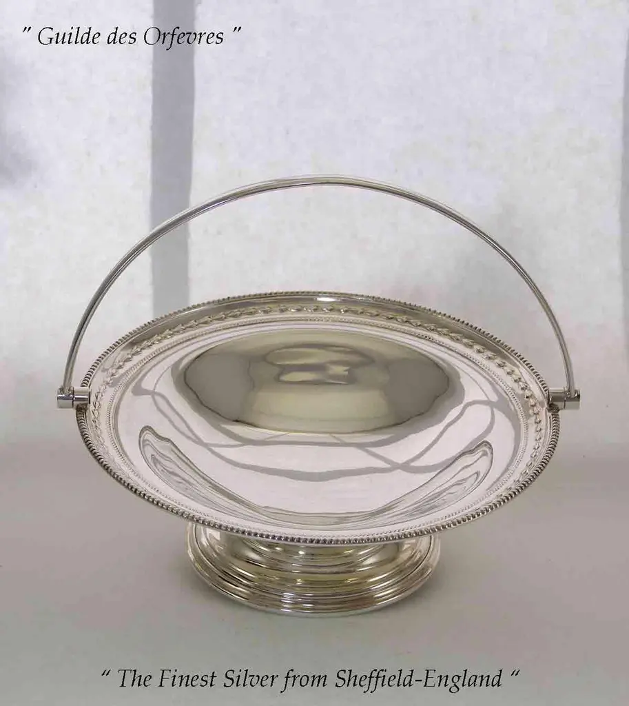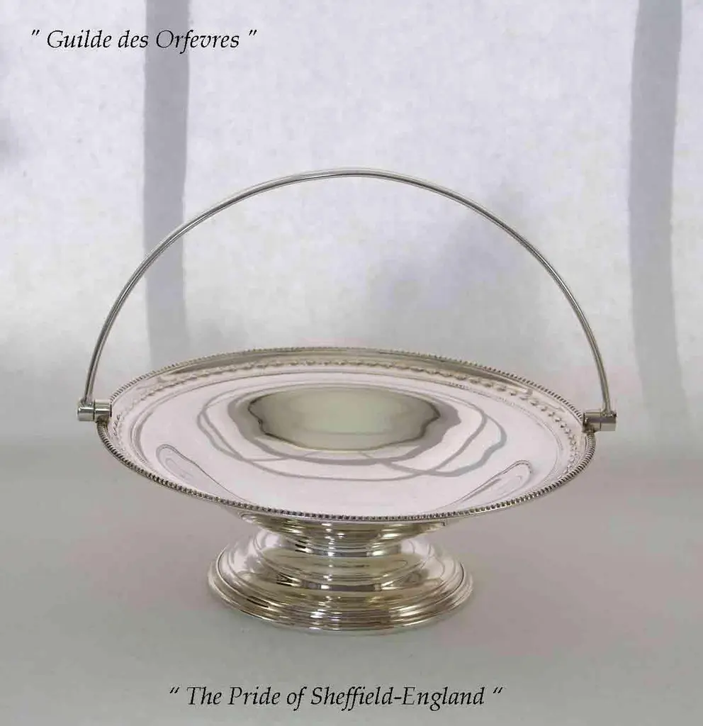 Reference # JD 3330/8 Photo 255 Description: Silver Cake Basket with Swinging Handle, Husk & Bead Pattern : Husk & Bead - Size : 8 in. A Silver Cake Basket with Swinging Handle, Husk & Bead Rim on Circular Foot. Sheffield Plate is The Finest Silver Plated Ever Made, will be Enjoyed & Treasured from Generation to Generation. “ Electro Plated on E.P.N.S. , a quality silver plated on Nickel Silver Made in England, by James Dixon & Sons in Sheffield 1970’s- Marked : James Dixon, A 1 Retail Price : $ 400.00 Quantity Available : 3 A quality silver plated required by the Consumer Protection Agency in the U.K. A heavy silver deposit Crafted to last for a lifetime everyday use N.B. James Dixon & Sons, a distinguished silver company in Sheffield , England; supplier of finest stores in the U.K such as, Mappin & Webb, Garrard's etc... and abroad. Condition : New, Factory Original Packaging.