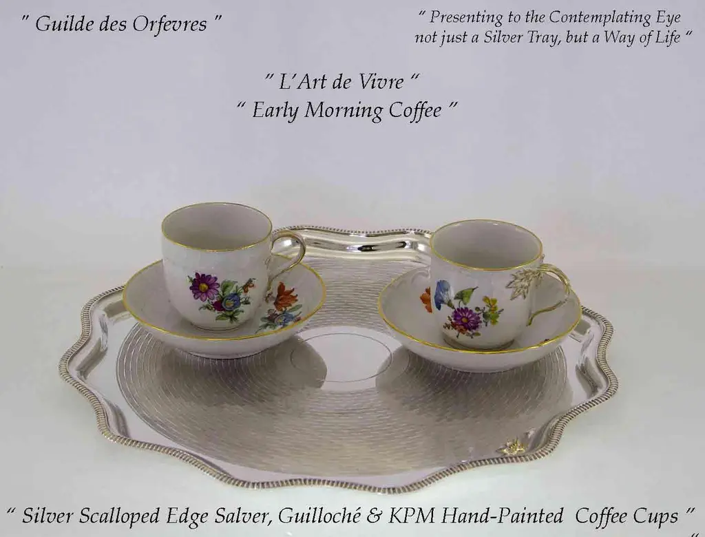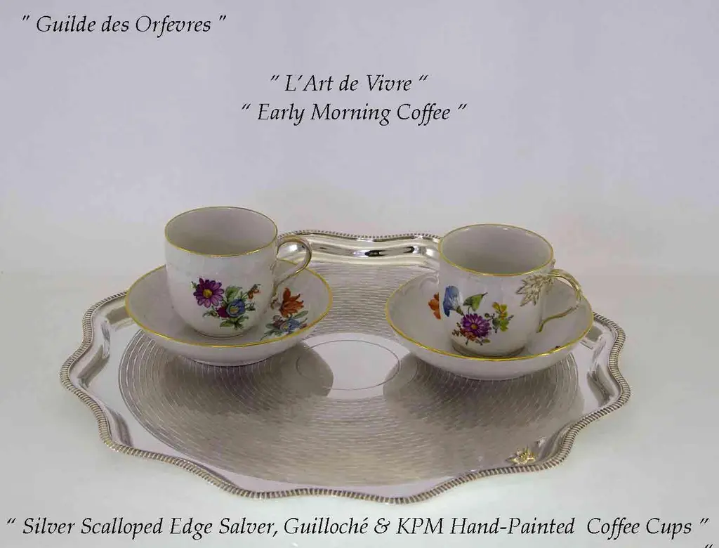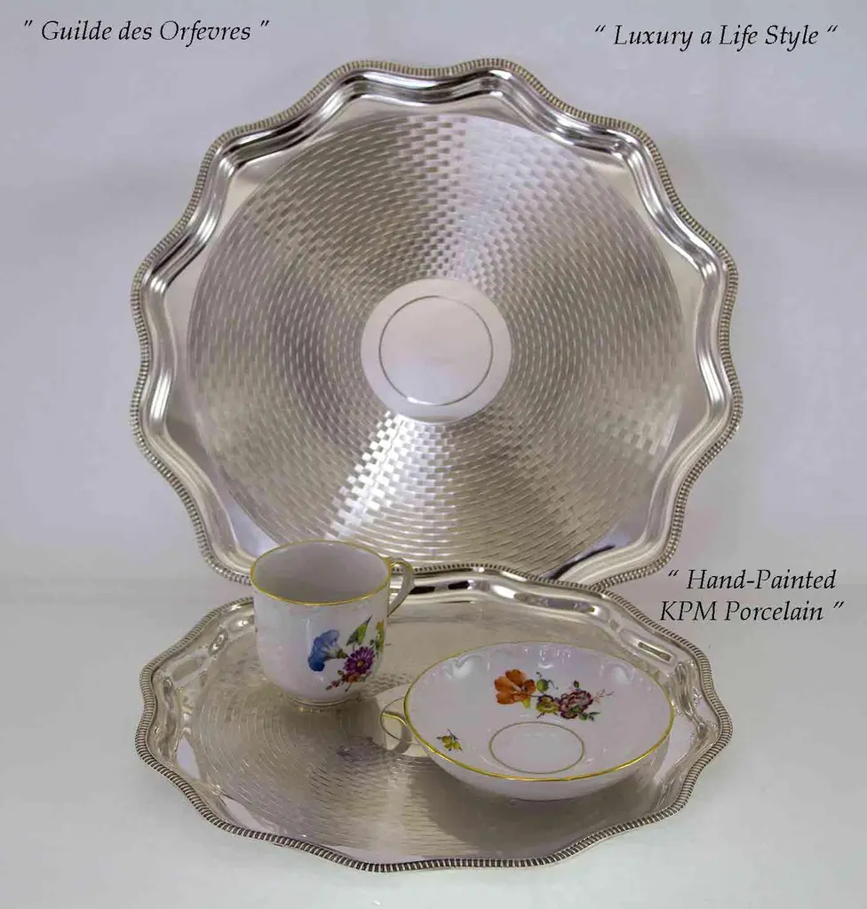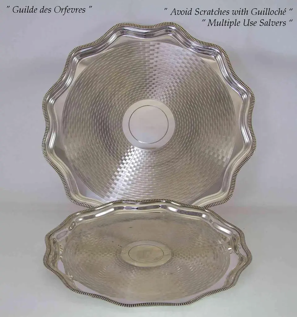 Reference # FC 12410/12-14 ET Photo 393 Description: Set of Two (2 Silver Scalloped Edge Salvers , Gadroon Mount, Engine Turned/Guilloché 12 &14 in. Pattern : Gadroon, Engine Turned/Guilloché - Size : 12 &14 in. . Electro Plated on E.P.N.S. , a quality silver plated on Nickel Silver Made in England, by Frank Cobb & Co. Marked : Frank Cobb A 1 Sheffield- England Retail Price : $ 1,200.00 Wholesale : $ 690.00 Silver is Eternal, the Silver Glow & Patina is agreeable to the Eye. Quality Silver & Sterling Silver are Heirloom, will be Enjoyed & Treasured from Generation to Generation. A 1 is a quality silver plated required by the Consumer Protection Agency in the U.K. A heavy silver deposit Crafted to last for a lifetime everyday use. N.B. Frank Cobb, a distinguished silver company in Sheffield , England; supplier of finest stores in the U.K such as, Mappin & Webb, Garrard's etc... and abroad. The Story Behind These Magnificent & Exceptional Sheffield Plate Items is Fascinating : Purchased directly from the Silver Manufactures in London, Sheffield & Birmingham-England in 1970's. They are in the original factory packaging, were at a storage in Greenwich, CT for almost forty (40) years. They surfaced to the market when most of the manufacturers are now defunct!? “ They Are Not Available Anywhere Else Condition : New in the original Factory packing of 1970’s