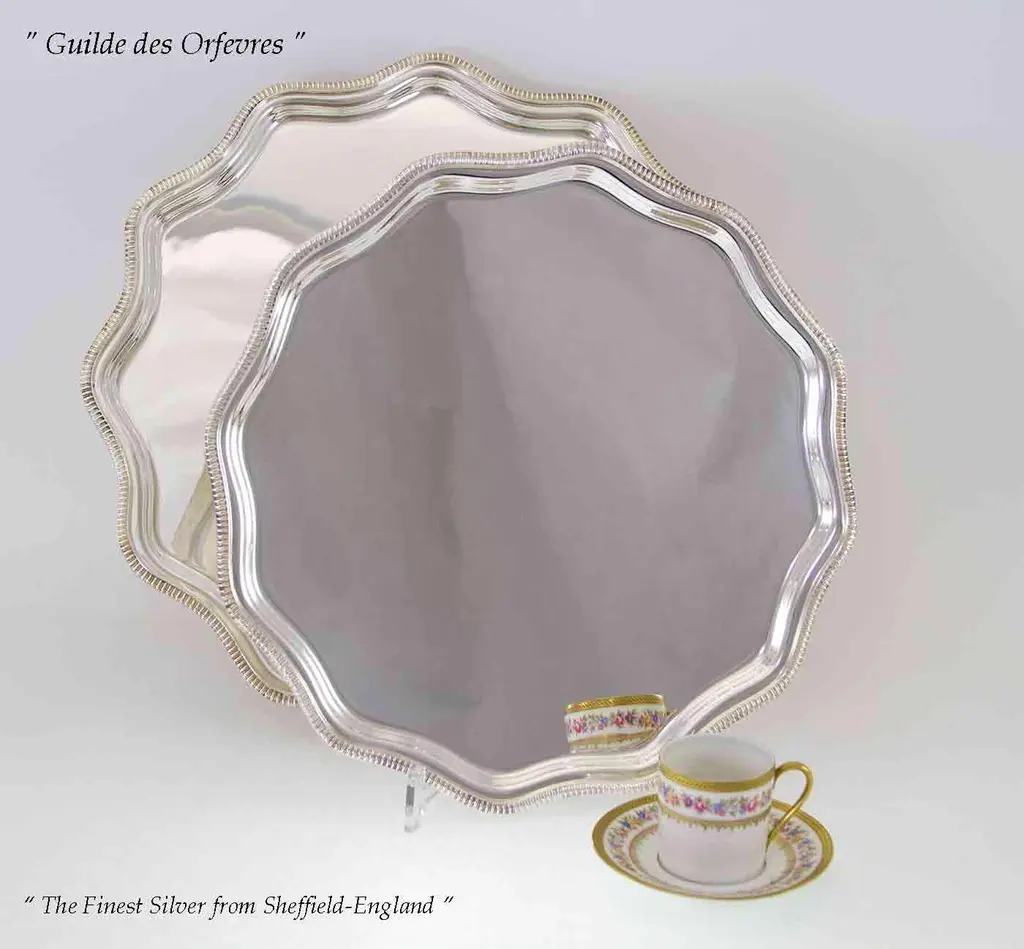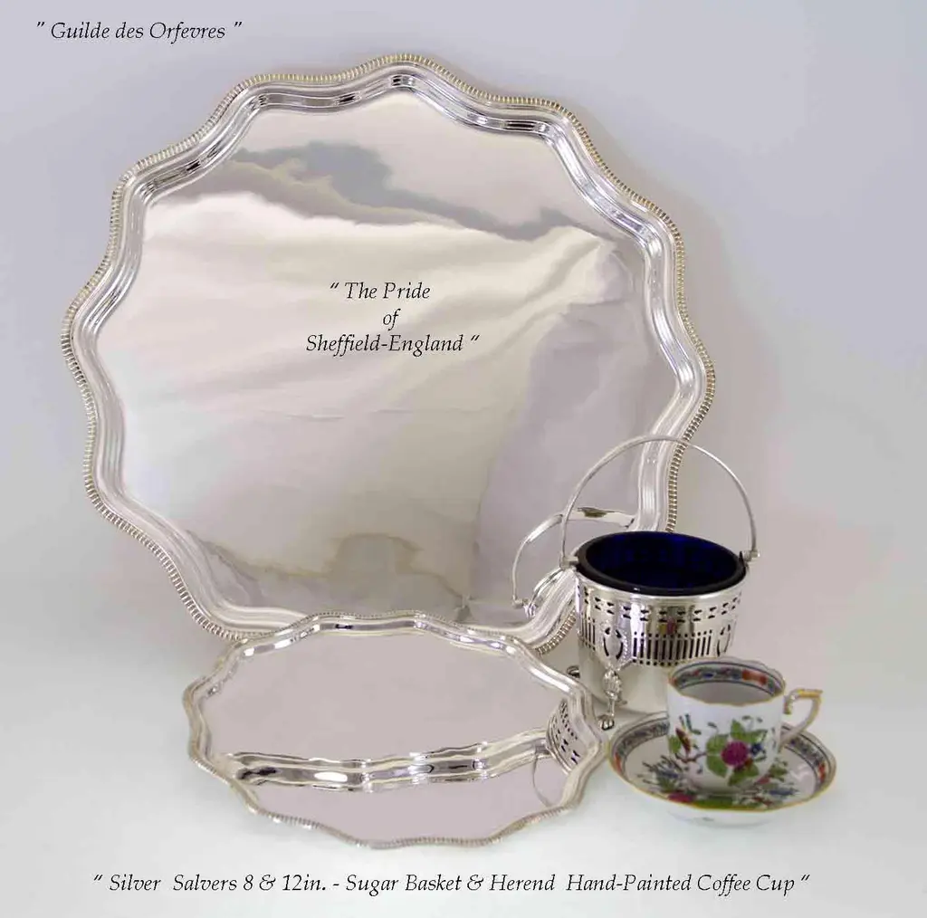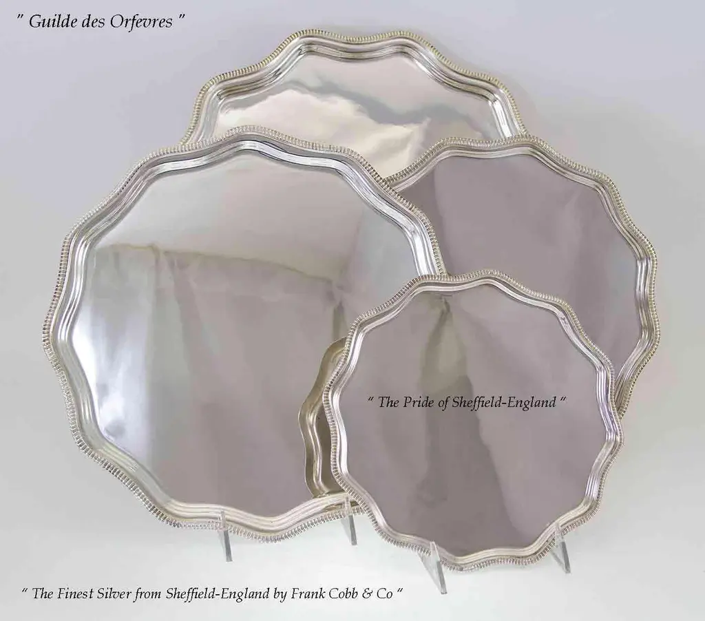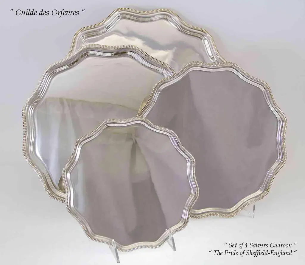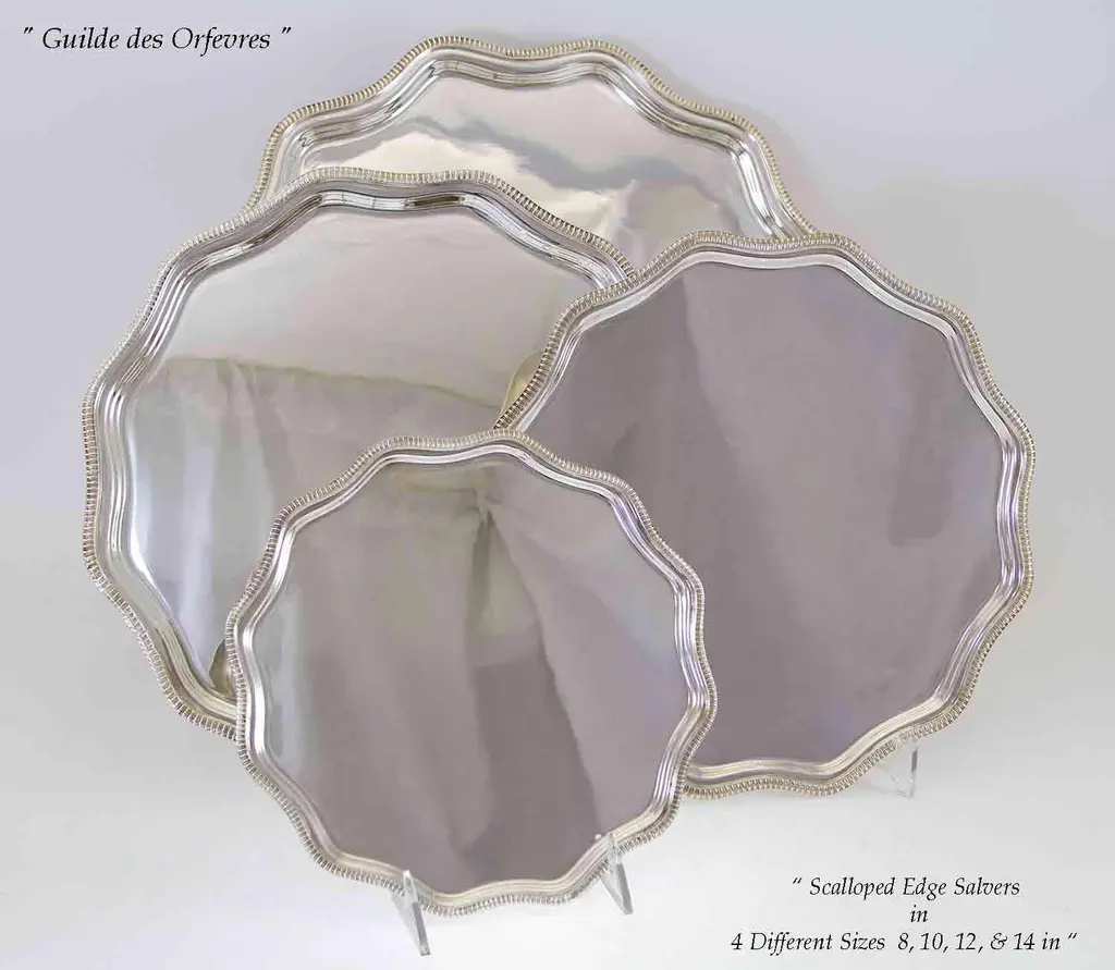 Reference # FC 12417. “ New not Used, The Finest Quality Ever Made " Photo 404 Description: Set of 4 Silver Scallopped Edge Salver , Gadroon Mount Pattern : Shaped Gadroon Size : 8-10-12 & 14 in. Electro Plated on E.P.N.S. , a quality silver plated on Nickel Silver Made in England, by Frank Cobb & Co. Marked : Frank Cobb A 1 Sheffield- England Retail Price : $ 1,900.00 Wholesale : $ 1,105.00 Quantity Available : 4 Silver is Eternal, the Silver Glow & Patina is agreeable to the Eye. Quality Silver & Sterling Silver are Heirloom, will be Enjoyed & Treasured from Generation to Generation. A 1 is a quality silver plated required by the Consumer Protection Agency in the U.K. A heavy silver deposit Crafted to last for a lifetime everyday use. N.B. Frank Cobb, a distinguished silver company in Sheffield , England; supplier of finest stores in the U.K such as, Mappin & Webb, Garrard's etc... and abroad. The Story Behind These Magnificent & Exceptional Sheffield Plate Items is Fascinating : Purchased directly from the Silver Manufactures in London, Sheffield & Birmingham-England in 1970's. They are in the original factory packaging, were at a storage in Greenwich, CT for almost forty (40) years. They surfaced to the market when most of the manufacturers are now defunct!? “ They Are Not Available Anywhere Else. Condition : New in the original Factory packing of 1970’s