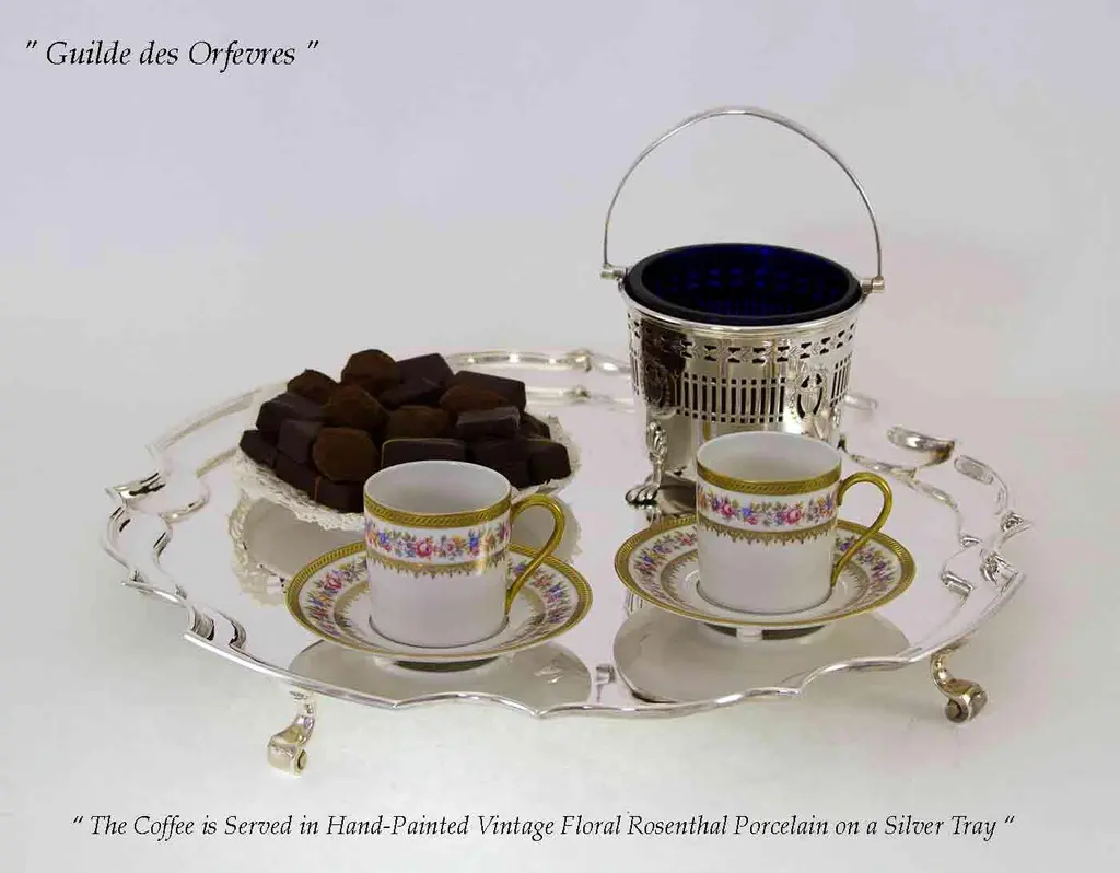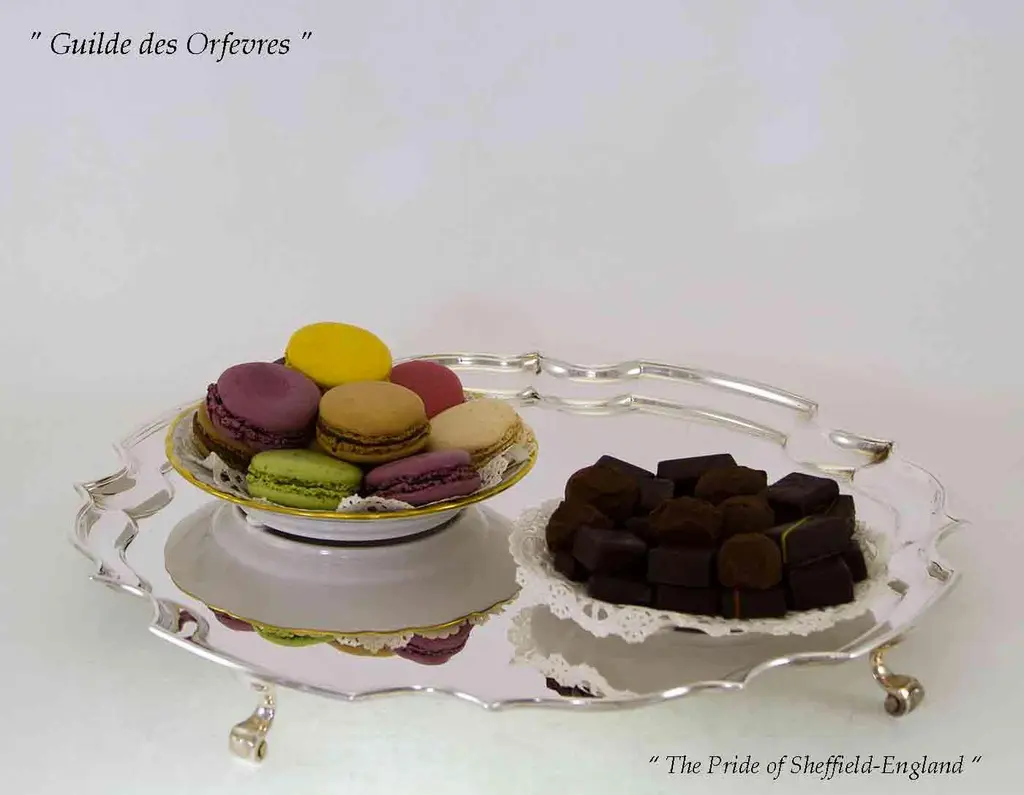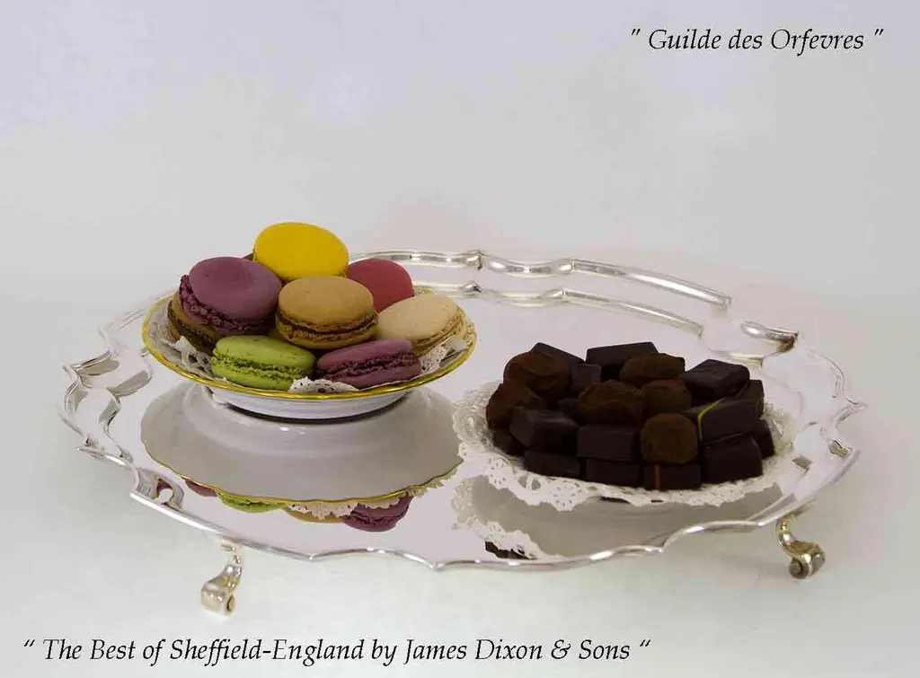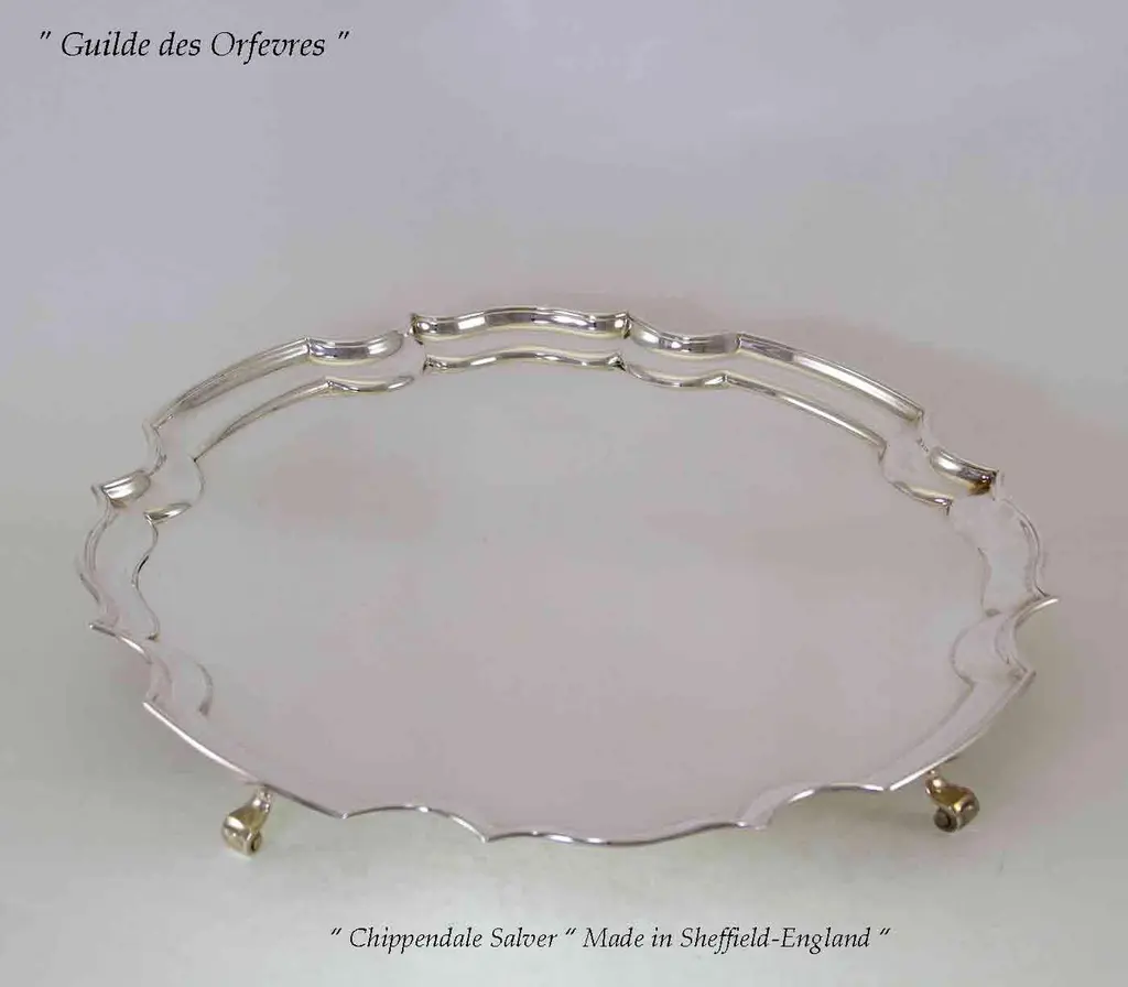 Reference # JD 6945-1 - WH or IF 1697 “ New not Used, The Finest Quality Ever Made " Photo 405 Description: Silver Chippendale Salver with Feet Pattern : Chippendale - Size : 14 in. Electro Plated on E.P.N.S. , a quality silver plated on Nickel Silver - Made in England, by James Dixon & Sons Marked : James Dixon, or I. Freeman & Sons Retail Price :$ 520.00 Wholesale : $ 290.00 - Quantity Available : 3 + 1 A 1 is a quality silver plated required by the Consumer Protection Agency in the U.K. A heavy silver deposit Crafted to last for a lifetime everyday use. N.B. James Dixon & Sons, a distinguished silver company in Sheffield , England; supplier of finest stores in the U.K such as, Mappin & Webb, Garrard's etc... and abroad. Condition : New in the original Factory packing of 1970’s