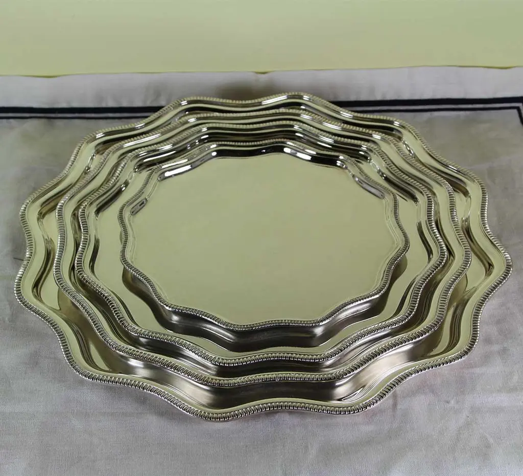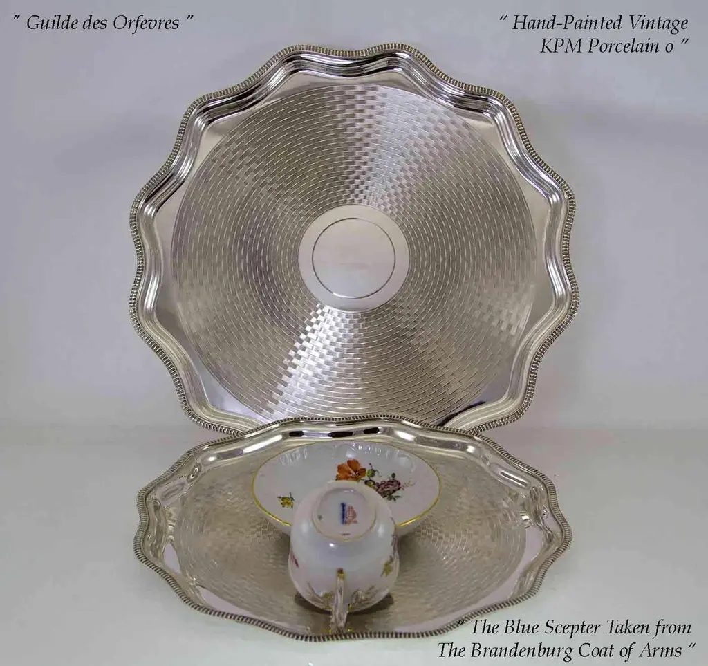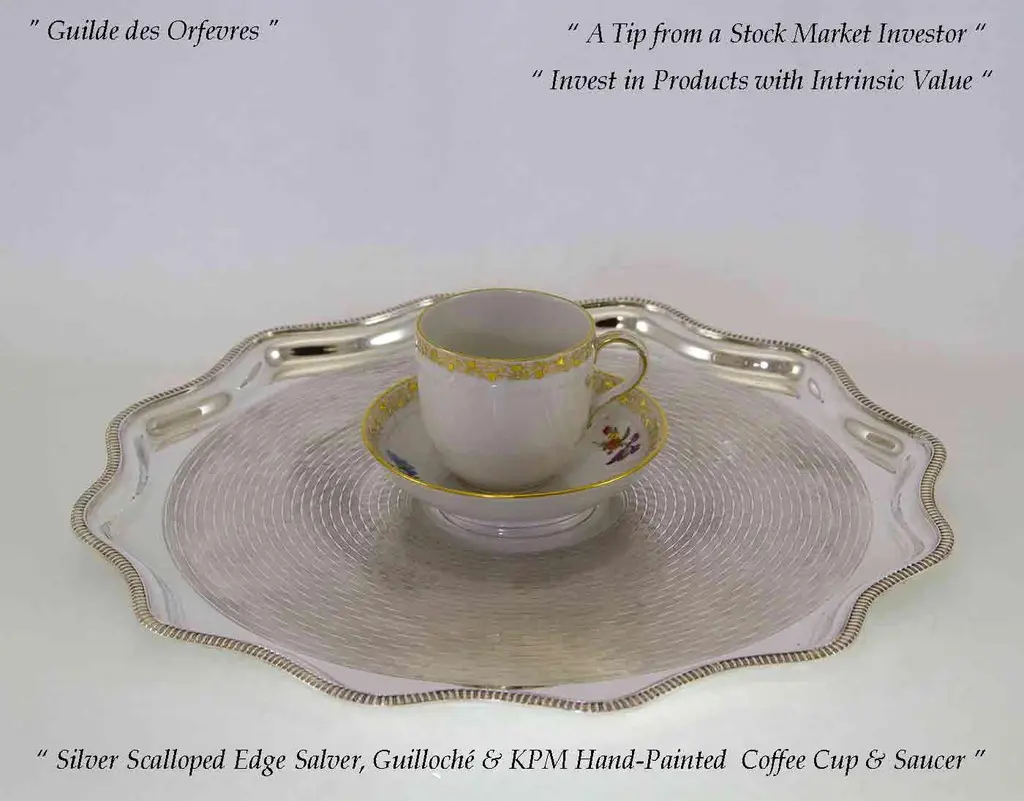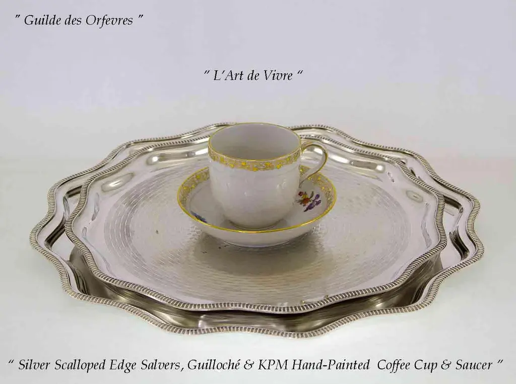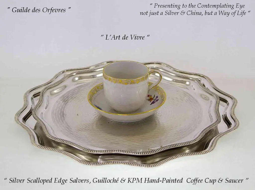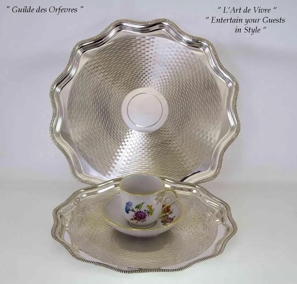 Reference # FC 12410/14 ET Photo 392 Description: Silver Scalloped Edge Salver , Gadroon Mount, Engine Turned/Guilloché 14 in. Pattern : Gadroon, Engine Turned/Guilloché - Size : 14 in. Electro Plated on E.P.N.S. , a quality silver plated on Nickel Silver Made in England, by Frank Cobb & Co. Marked : Frank Cobb A 1 Sheffield- England Retail Price : $ 680.00 Wholesale : $ 395.00 Silver is Eternal, the Silver Glow & Patina is agreeable to the Eye. Quality Silver & Sterling Silver are Heirloom, will be Enjoyed & Treasured from Generation to Generation. A 1 is a quality silver plated required by the Consumer Protection Agency in the U.K. A heavy silver deposit Crafted to last for a lifetime everyday use N.B. Frank Cobb, a distinguished silver company in Sheffield , England; supplier of finest stores in the U.K such as, Mappin & Webb, Garrard's etc... and abroad. The Story Behind These Magnificent & Exceptional Sheffield Plate Items is Fascinating : Purchased directly from the Silver Manufactures in London, Sheffield & Birmingham-England in 1970's. They are in the original factory packaging, were at a storage in Greenwich, CT for almost forty (40) years. They surfaced to the market when most of the manufacturers are now defunct!? “ They Are Not Available Anywhere Else Condition : New in the original Factory packing of 1970’s