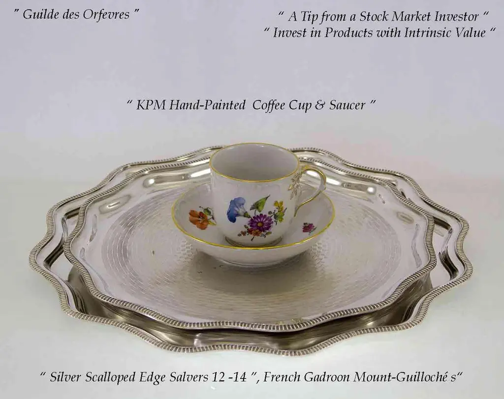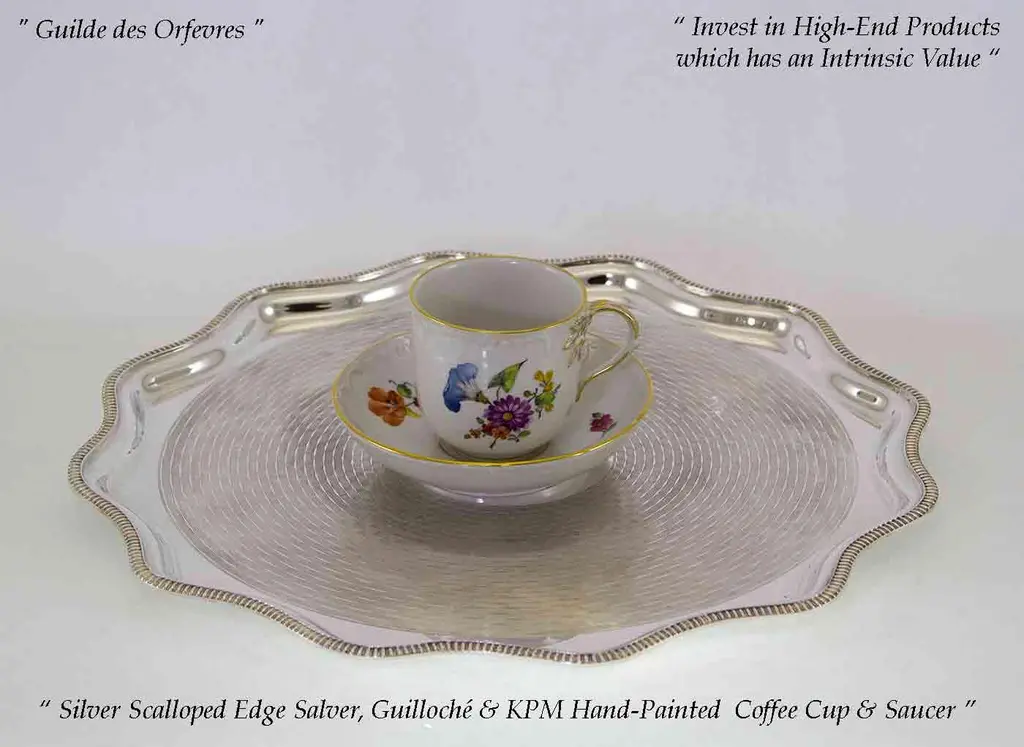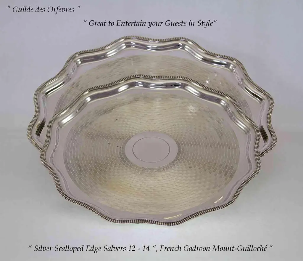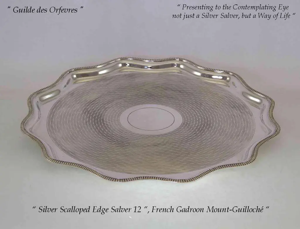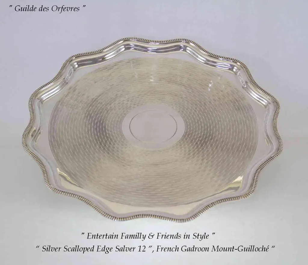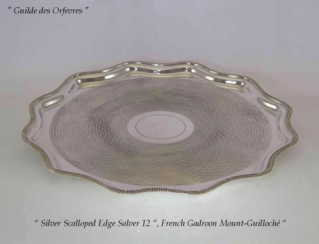 Reference # FC 12410/12 ET Photo 391 Description: Silver Scalloped Edge Salver , Gadroon Mount, Engine Turned/Guilloché 12 in. Pattern : Gadroon, Engine Turned/Guilloché - Size : 12 in. Electro Plated on E.P.N.S. , a quality silver plated on Nickel Silver. Made in England, by Frank Cobb & Co. Marked : Frank Cobb A 1 Sheffield- England Retail Price : $ 520.00 Wholesale : $ 295.00 Quantity Available : 12 A 1 is a quality silver plated required by the Consumer Protection Agency in the U.K. A heavy silver deposit Crafted to last for a lifetime everyday use. N.B. Frank Cobb, a distinguished silver company in Sheffield , England; supplier of finest stores in the U.K such as, Mappin & Webb, Garrard's etc... and abroad. Condition : New in the original Factory packing of 1970’s