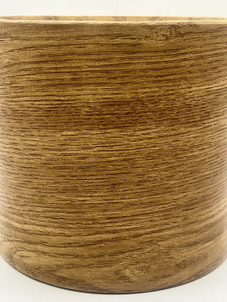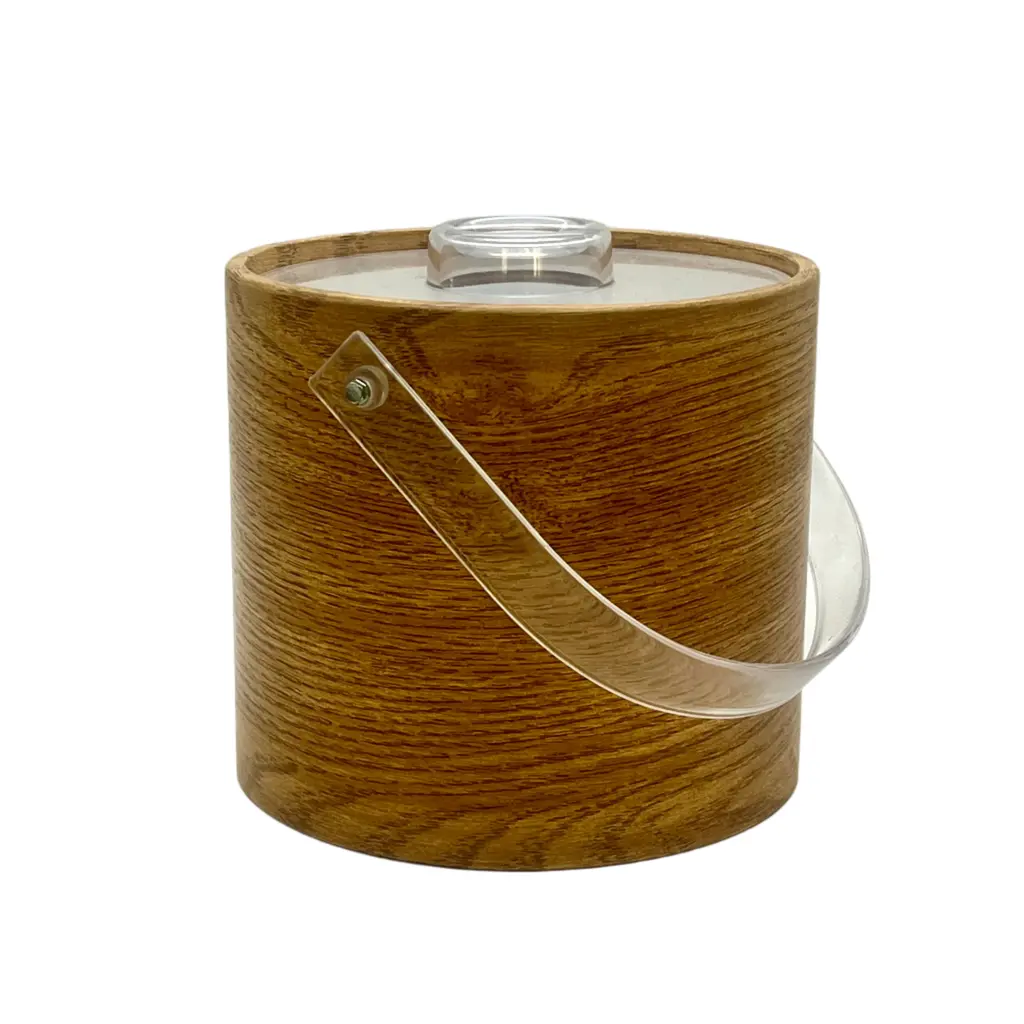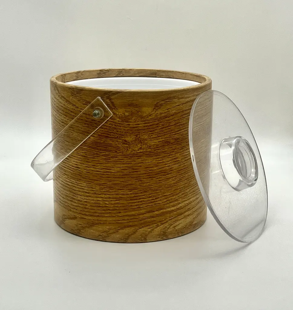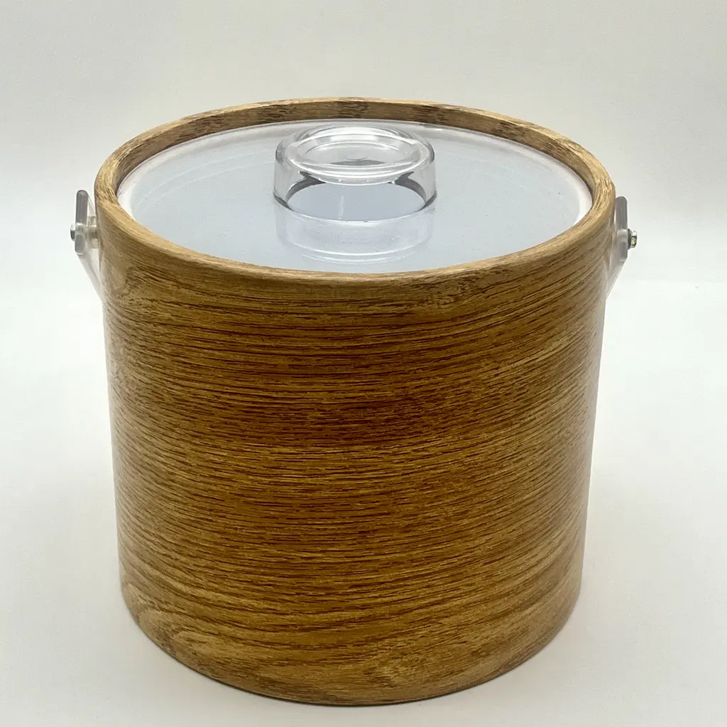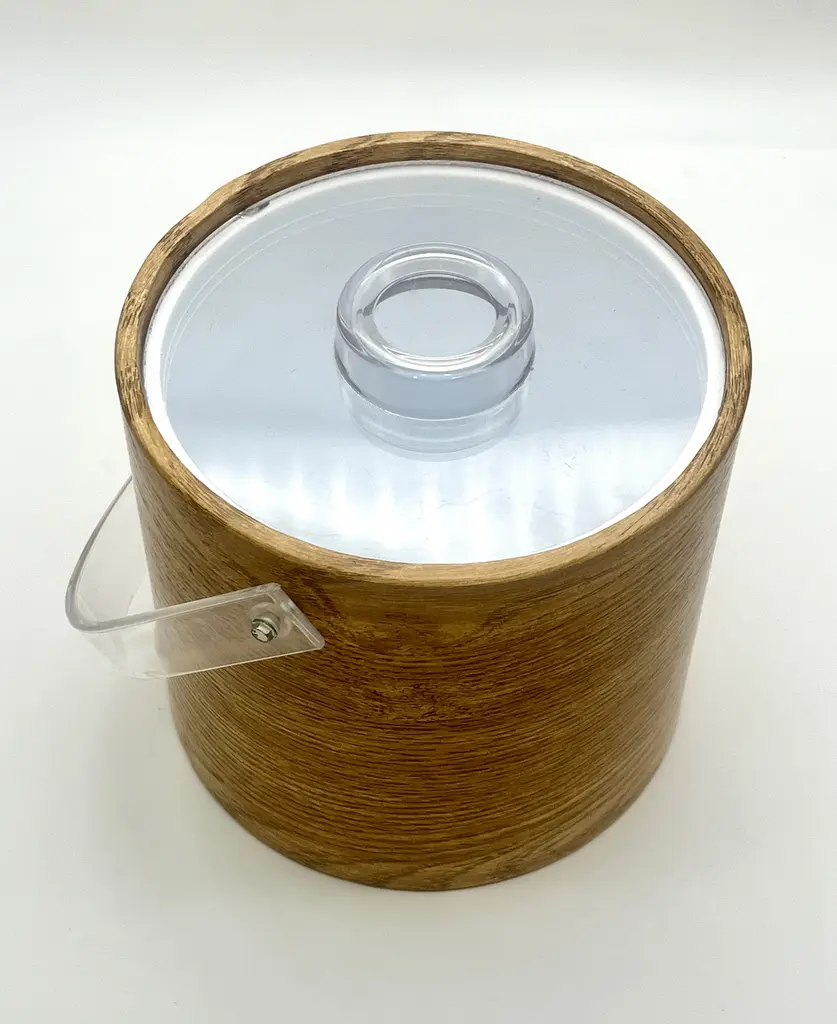 Postmodern style c. 1980s faux-wood laminate ice bucket with a clear Lucite lid and handle. Chrome ice tongs included.