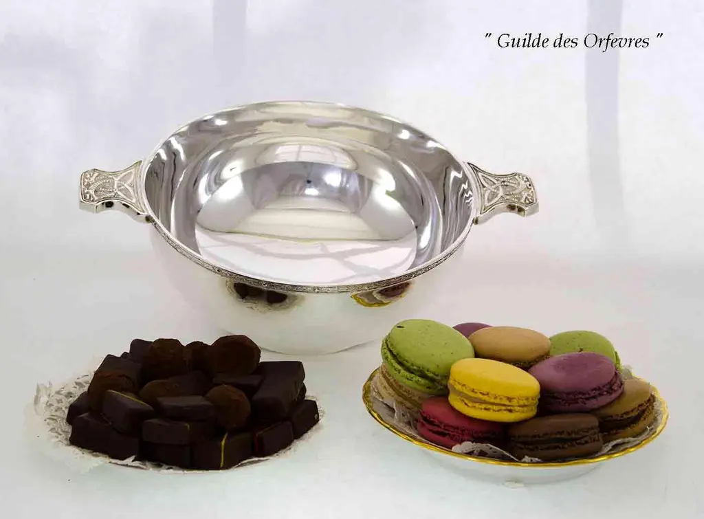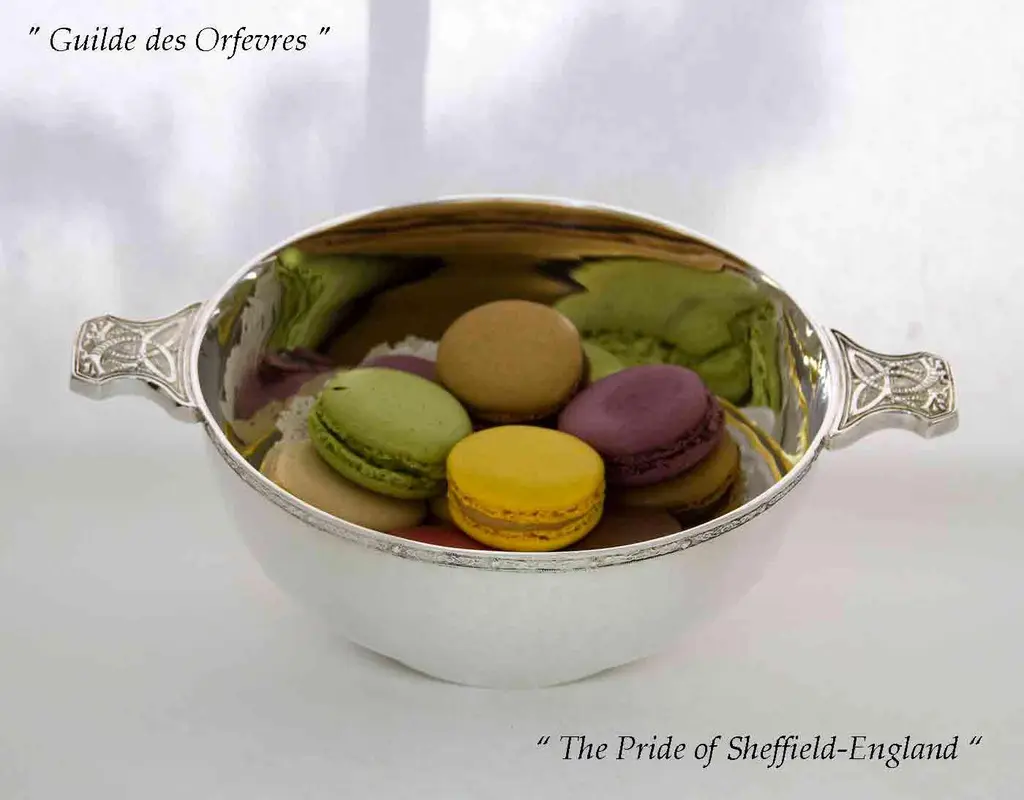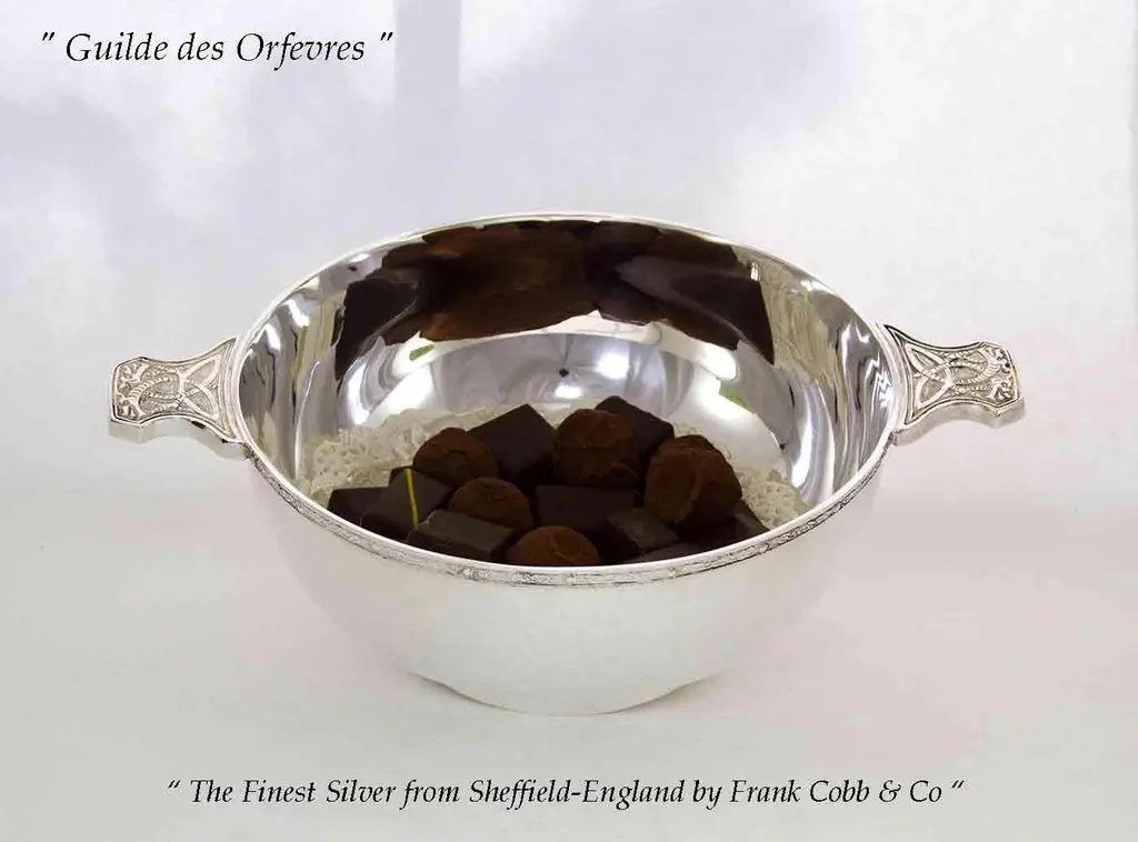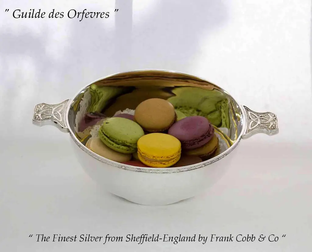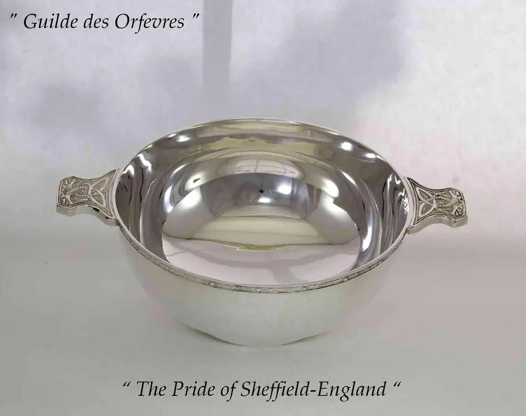 "We Take Pride in Offering Exclusive Products, New not Used" "The Finest Silver Quality Ever Made in Sheffield-England“ Ref # FC 14200 Description: Silver Quaich Bowl with Celtic Applied Border Pattern : Celtic - Size : 7 in. Quaich is a Scottish word, for a shallow bowl with two handles. Electro Plated on E.P.N.S. , a quality silver plated on Nickel Silver Made in England, by Frank Cobb in Sheffield 1970’s Marked : Frank Cobb, A 1 Retail Price : $ 560.00 Wholesale : $ 280.00 Quantity Available : 13 N.B. Frank Cobb, a distinguished silver company in Sheffield , England; supplier of finest stores in the U.K such as, Mappin & Webb, Garrard's etc... and abroad. Silver is Eternal, the Silver Glow & Patina is agreeable to the Eye. Quality Silver & Sterling Silver are Heirloom, will be Enjoyed & Treasured from Generation to Generation. “. ABOUT US We at Guilde des Orfèvres, Ltd. had a Showroom in 225 Fifth Avenue in New York; we introduced the finest European products to the US market. We supplied the Finest Stores Nationwide, such as: Tiffany, Bergdorf Goodman, Scully & Scully, Bernardaud, in New York; Betteridge Jewelers, in Greenwich; Connecticut; Schreve, Crump & Low, in Boston; Mary Mahoney, In Palm Beach, Florida; Geary’s, in Beverly Hills and Gump’s, in San Francisco, California. The Story Behind These Magnificent & Exceptional Sheffield Plate Items is Fascinating : Purchased directly from the Silver Manufactures in London, Sheffield & Birmingham-England in 1970's. They are in the original factory packaging, were at a storage in Greenwich, CT for almost forty (40) years. They surfaced to the market when most of the manufacturers are now defunct!? “ They Are Not Available Anywhere Else “ Condition : New - Factory Original Packaging.