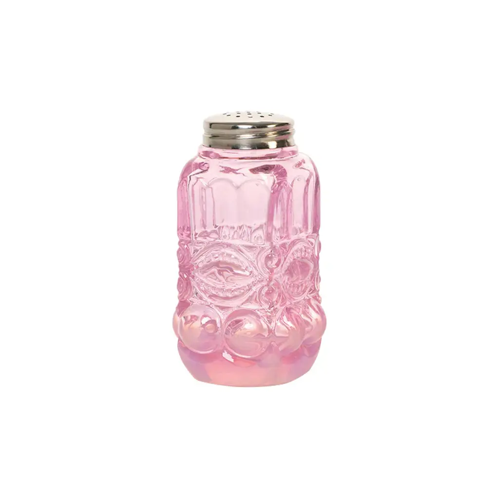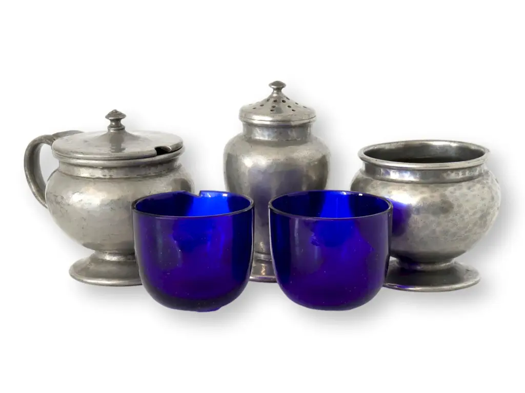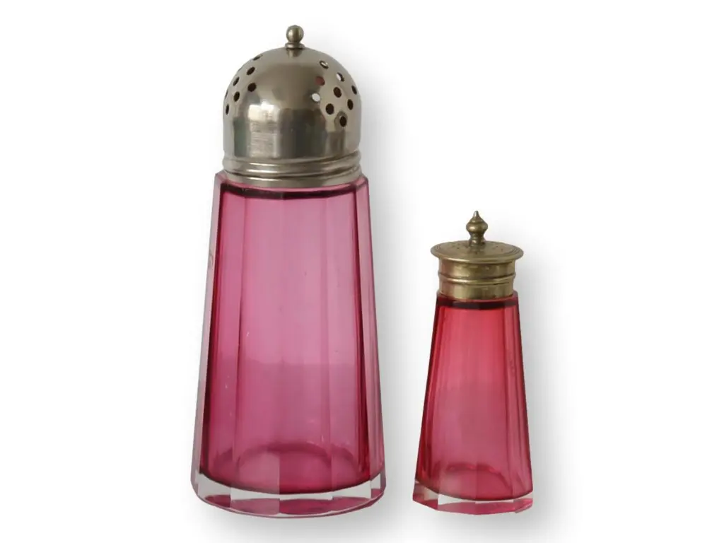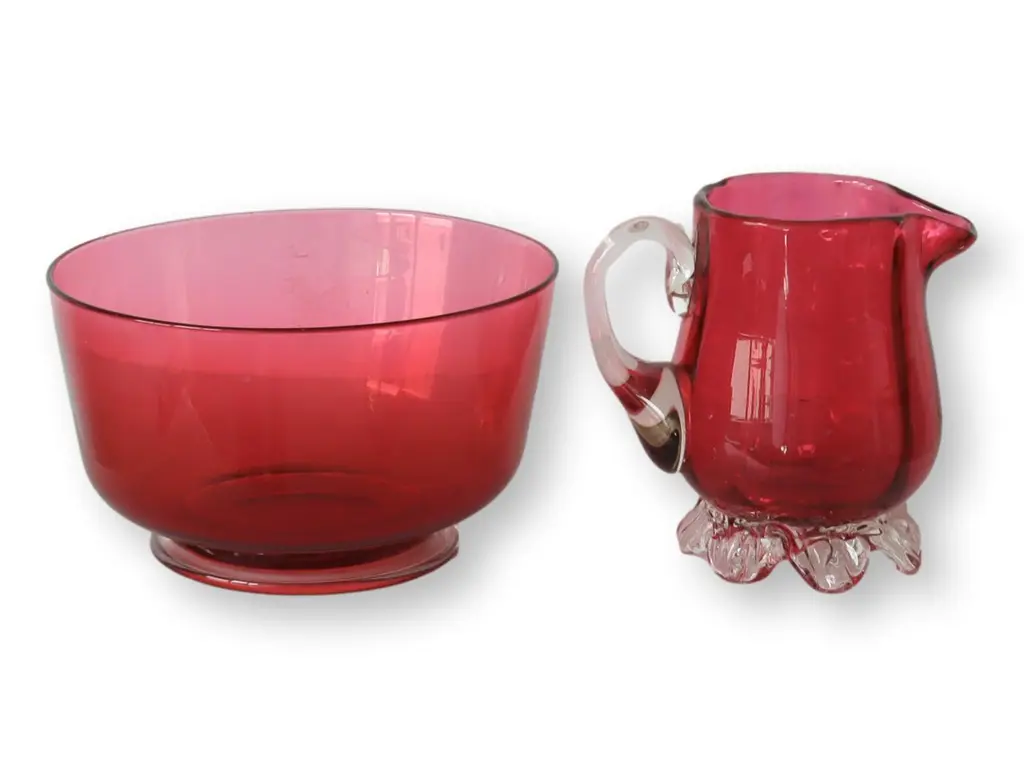 Enhance your afternoon tea experience with the grace and beauty of 19th century English Victorian cranberry glass. A mix of hand blown, and cut glass, this luxurious set includes a caster/powdered sugar shaker, small shaker, creamer, and a berry serving bowl. Delight in the elegance of this exquisite set as you savor the pleasures of a classic afternoon tea. Dimensions: lg shaker, 2.5"Dia x 5.75"H; sm shaker, 1.5"Dia x 3.5"H; creamer, 4"L x 2.5"W x 3.5"H; bowl, 5"Dia x 2.75"H. Unsigned.