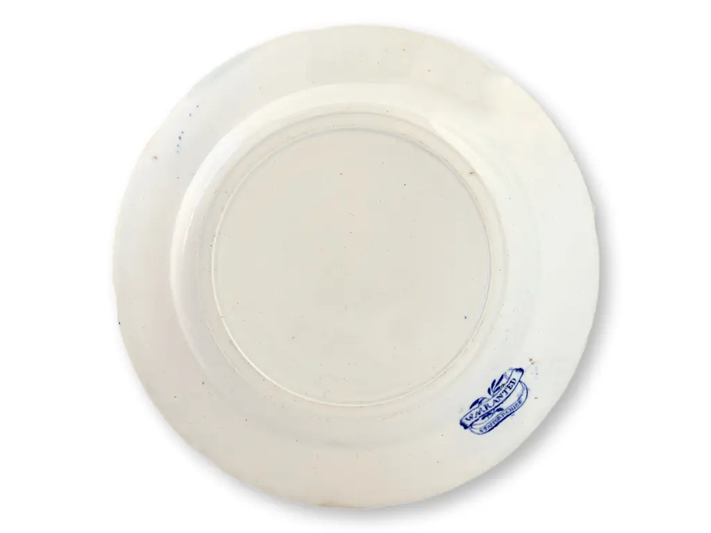 Set of 10 English blue and white Willow dinner plates, circa 1850. Made of earthenware with rich cobalt transfer decoration and scalloped rims. Marked �������������Warranted Staffordshire,�� a mid-19th-century export stamp used by several English potteries (like Adams, Clews, or Riley). A timeless Willow chinoiserie pattern with romantic folklore and striking detail��ideal for display or service. Overall condition is good, only a few edge flaws on two plates, light wear to glaze on edges- no cracks/hairlines