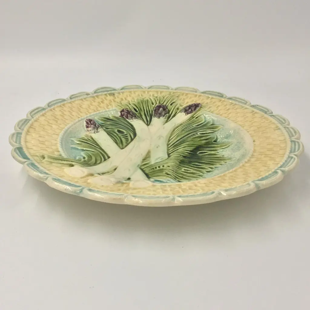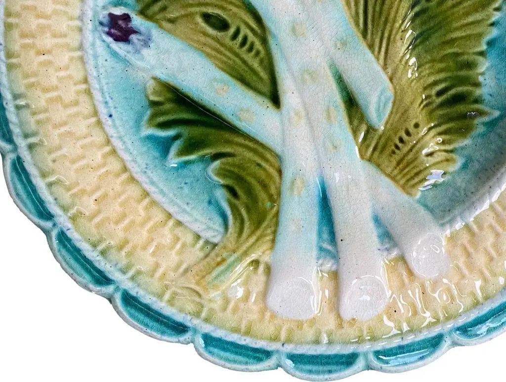 This 19th century Majolica asparagus hand painted plate was made in France. This Majolica dish is in the style of the Salins-les-Bains Craft.