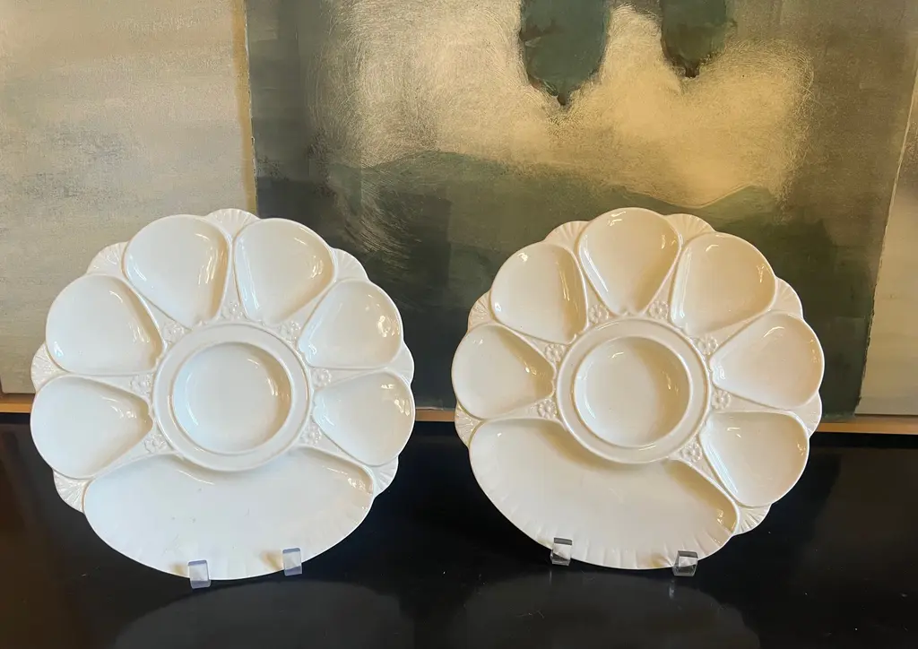 Oyster plate made by Minton in the 19th century. Includes six wells, a center sauce well as well as a space for crackers.