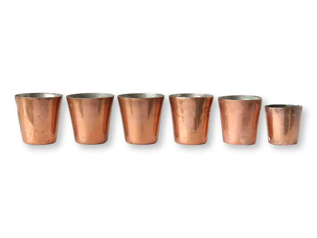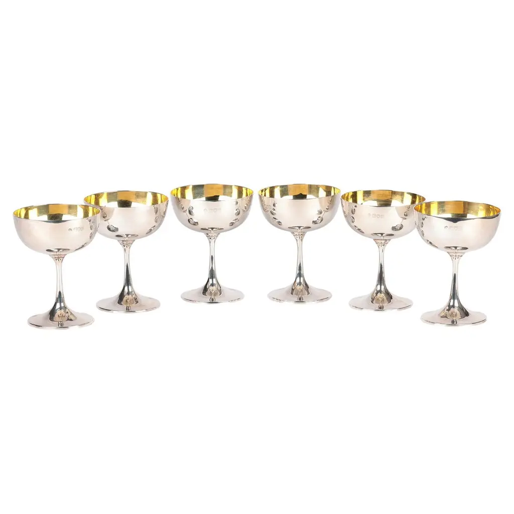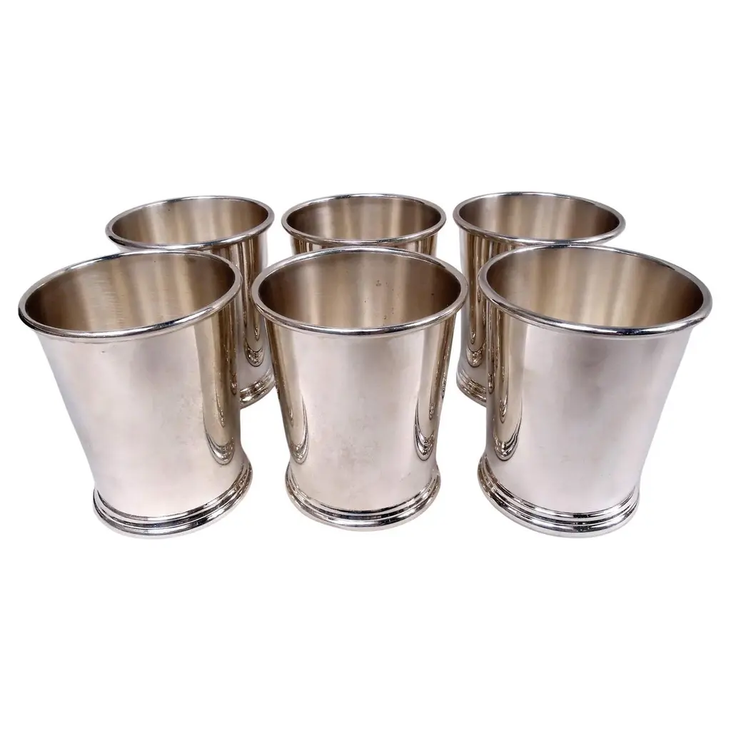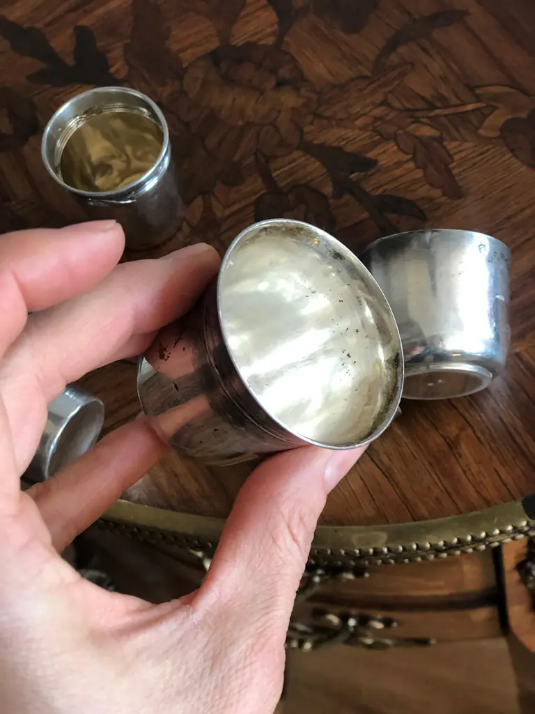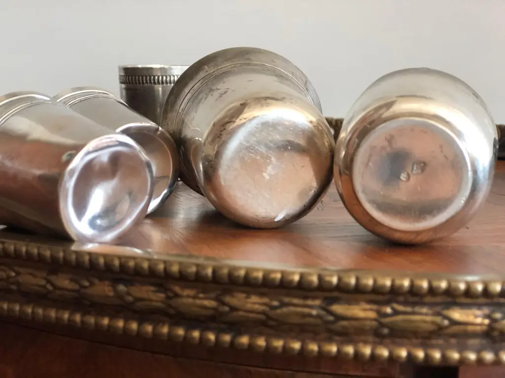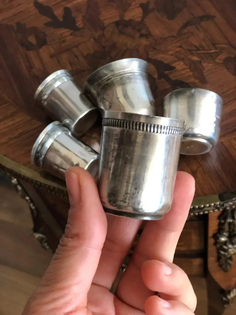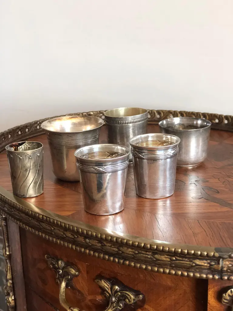 Six small silver round cups with different elegant decoration.There are small shocks on few of them.Could be sold separately. The price is per item.France, circa 1890.