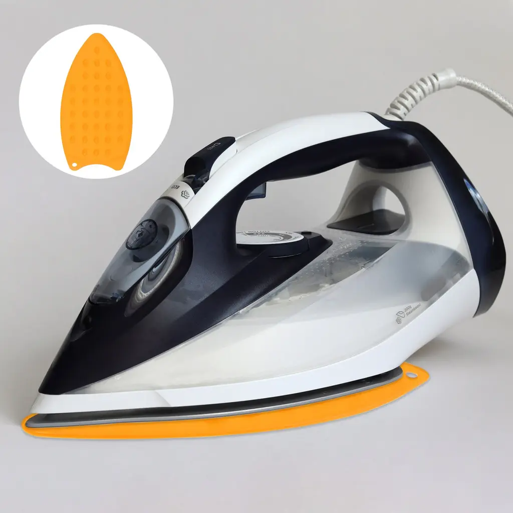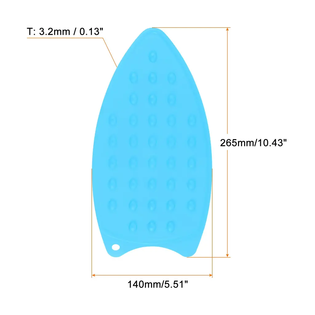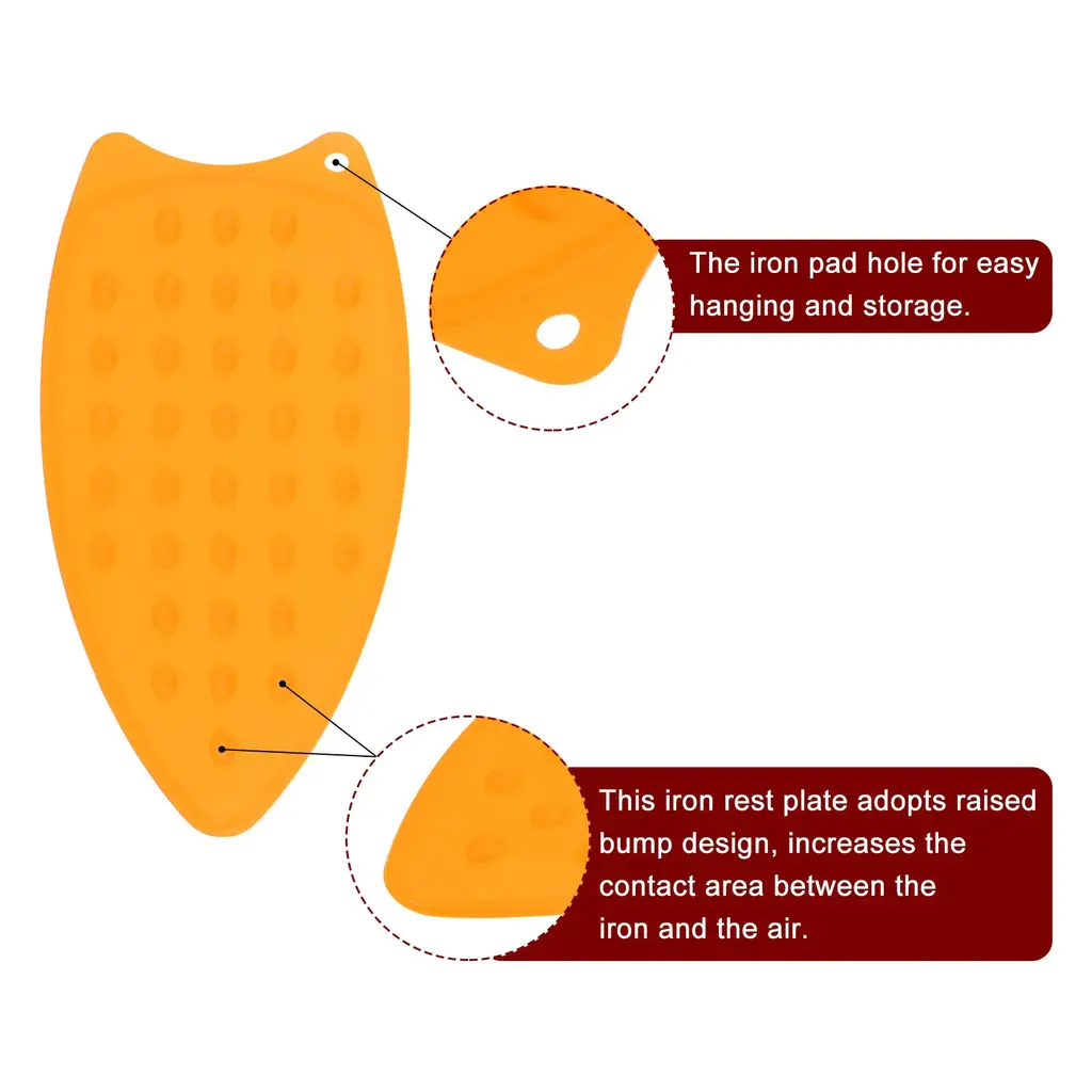 Protect your furniture and table tops from heat damage with this durable and high-quality silicone iron rest pad. Made with soft and thick silicone, this reusable pad is designed to withstand high temperatures up to 220C for short periods of time. Its raised bump design allows for faster cooling of the iron without compromising support. The pad's thick rubber material provides friction, ensuring that it stays securely in place while you iron. Conveniently hang and store the pad using the holes at the end. Keep your ironing area safe and scratch-free with this handy iron rest pad.Features: