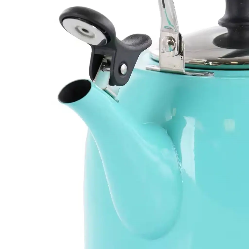 Specification:Description: Keep hot water ready and within reach when cooking. The 2.2 Quart Aqua Blue Green Teal Turquoise/Silver Stainless Steel Whistling Teapot Kettle prepares hot water as needed for soups and stocks or coffee and tea. Made from stainless steel, the tea kettle offers everyday durability and quick heat distribution to serve hot water on time. The glossy enamel finish elevates this classic kitchen essential as a statement stovetop centerpiece that looks good in any kitchen. The flip-up spout emits a soft whistle when the water has come to a rolling boil and is ready to serve. For easy and safe pouring, the sturdy handle provides a comfortable grip. To clean the interior, fold down the handle to reach the trickiest corners of the tea kettle. Safe to use on all stovetops, this whistling tea kettle will signal the start of midday coffee breaks or quiet tea times in the most stylish fashion. Hand wash only. Enjoy beautifully crafted kitchen and tabletop pieces that blend style and function.
