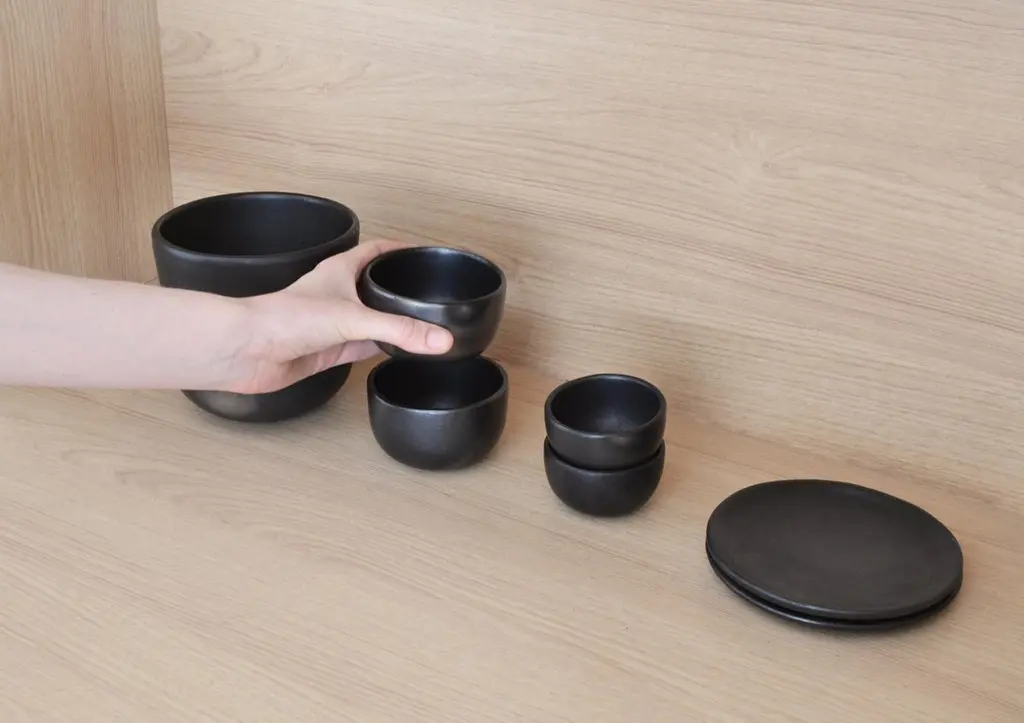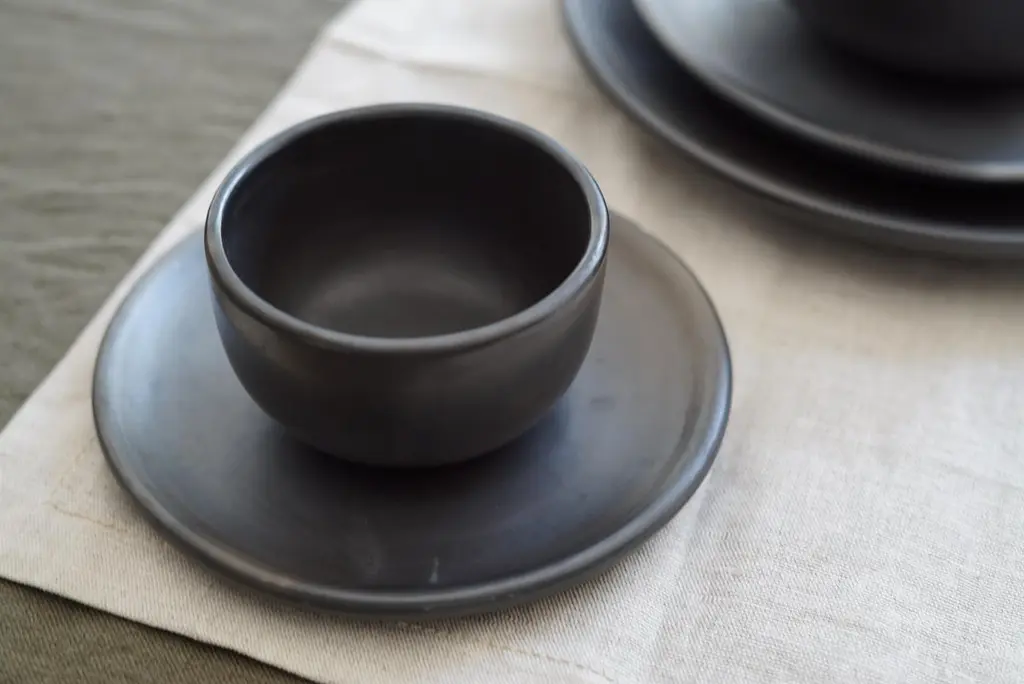 Oaxacan black clay 20cm plates handmade tableware burnished barro negro Oaxaca. Set of 2 pieces.The soft and rich colour makes this side plate a stylish partner to bread, butter or more spectacular starters.Handmade in Oaxaca, a state rich in pre-hispanic pottery tradition, the Barro Negro (black clay) style has a tactile finish with a subtle shine. The workshop takes the natural clay and cleans it by filtering it for 20 days. The clay is then smoked to create the black colour and burnished rather than glazed, by polishing the surface with a quartz crystal until it has a glossy finish with a warm glow. The pieces are then fired in underground pits or kilns, using a wood fire.