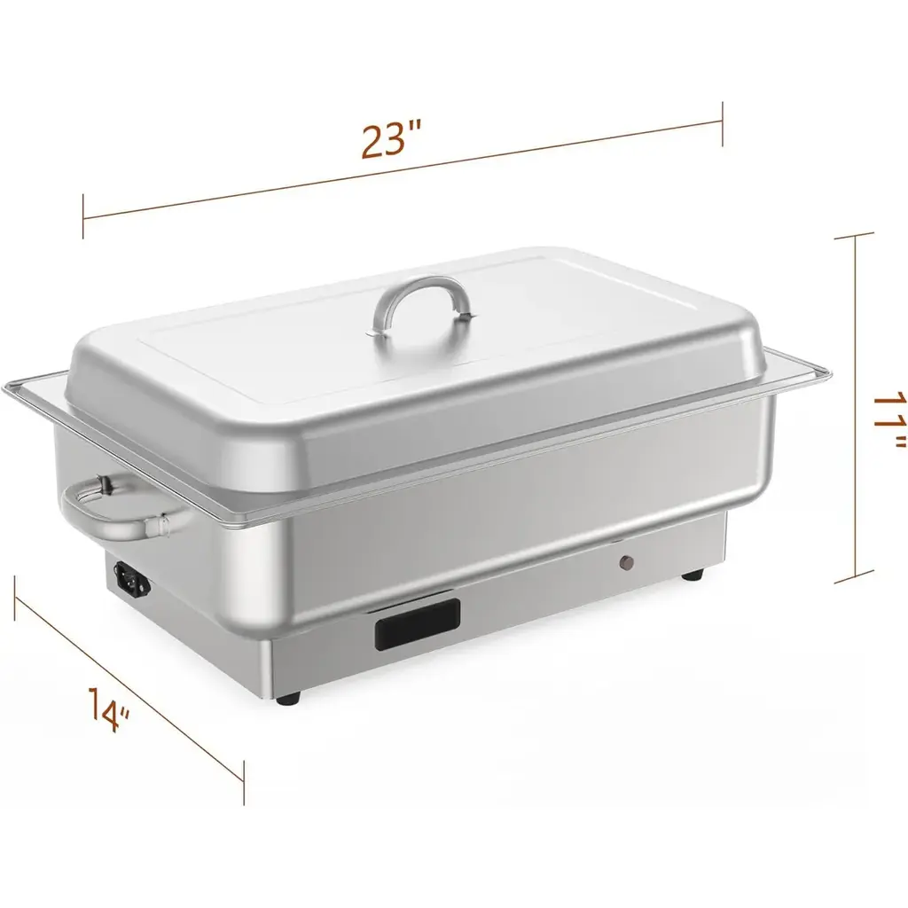 【Upgrade Stainless Steel & Easy to Clean】Made of food grade stainless steel all the items are tested to ensure safety and longevity,the food pan features with NSF certification.And it is convenient for you to clean every corner of both the inner with dish washing liquid and dried with a soft towel.The food pan, water pan and cover are dishwasher safe.【Adjustable Temperature Control】The electric buffet servers and warmers have a digital control panel and temperature display, so you can easily read and adjust the temperature. Great for keeping food at the perfect serving temperature. The stainless steel chafing dish can adjust the temperature from 86°F and 200°F(30°C and 93°C) to keep food warm.【High Efficiency & Energy Saving】This electric chafing dishes for buffet has a built-in electric heating plate with low power consumption, with 600W high heating power, making it an ideal choice for buffet heaters. The buffet servers and warmers use hot water to heat food, locking in the original flavor.【Complete Package Include】This electric chafing dish set contains 2 x Main Body, 4 x Half-Size Food Pan, 2 x Water Pan, 2 x Stainless Steel Lids,2 x Power Cord and 2 x User Manuals.【Versatile Applications】With a generous 9 QT capacity, this electric chafing dish buffet set is designed for continuous use over long periods, making it an ideal choice for catering, banquets, restaurants, buffets, or home use. Elevate your dining experience with this versatile electric food warmer.