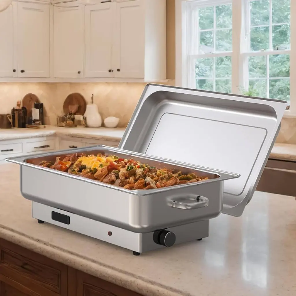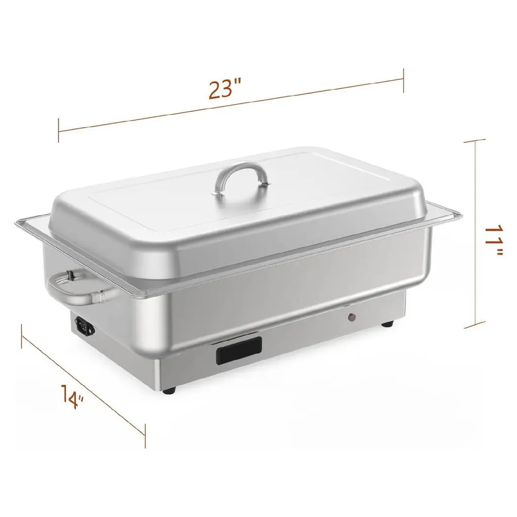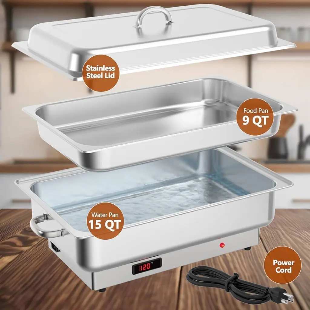 【Upgrade Stainless Steel & Easy to Clean】Made of food grade stainless steel all the items are tested to ensure safety and longevity,the food pan features with NSF certification.And it is convenient for you to clean every corner of both the inner with dish washing liquid and dried with a soft towel.The food pan, water pan and cover are dishwasher safe.【Adjustable Temperature Control】The electric buffet servers and warmers have a digital control panel and temperature display, so you can easily read and adjust the temperature. Great for keeping food at the perfect serving temperature. The stainless steel chafing dish can adjust the temperature from 86°F and 200°F(30°C and 93°C) to keep food warm.【High Efficiency & Energy Saving】This electric chafing dishes for buffet has a built-in electric heating plate with low power consumption, with 600W high heating power, making it an ideal choice for buffet heaters. The buffet servers and warmers use hot water to heat food, locking in the original flavor.【Versatile Applications】With a generous capacity, this electric chafing dish buffet set is designed for continuous use over long periods, making it an ideal choice for catering, banquets, restaurants, buffets, or home use. Elevate your dining experience with this versatile electric food warmer.