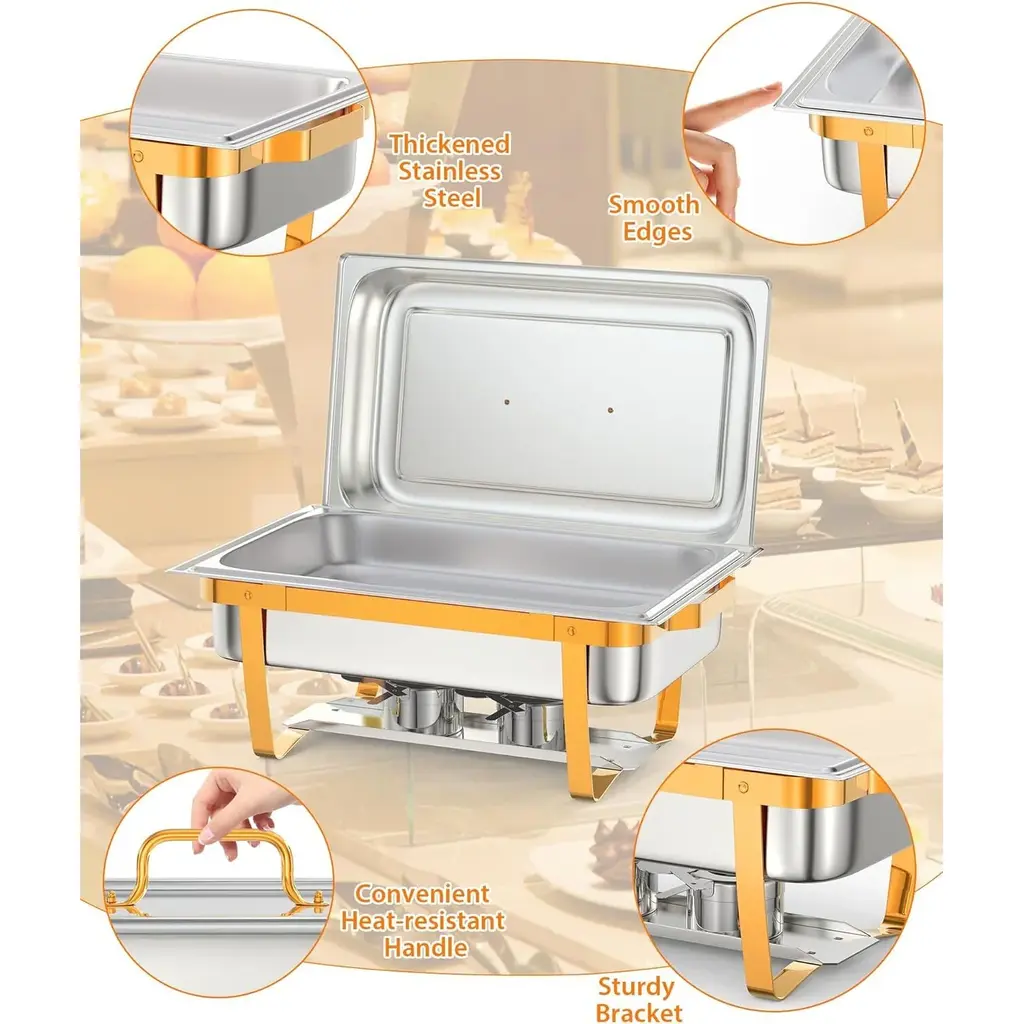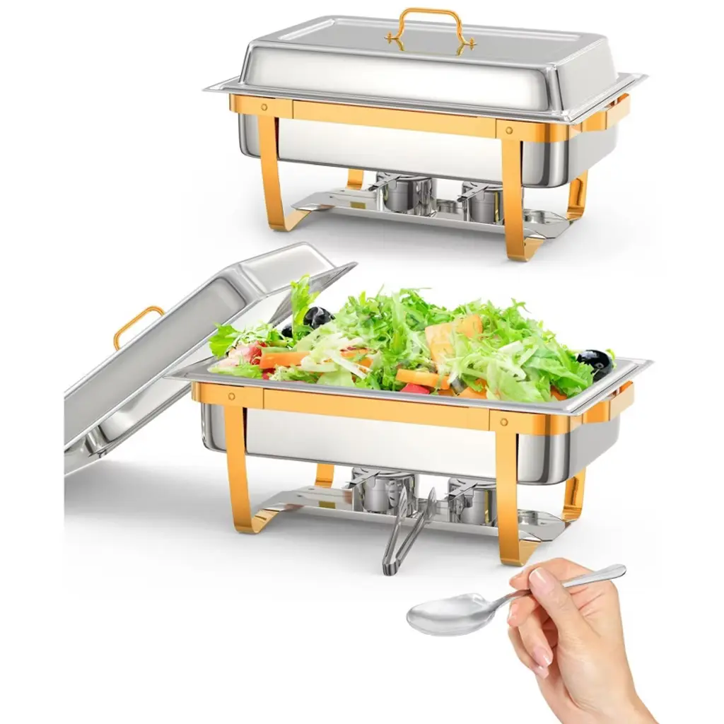 【Food-Grade Stainless Steel】- Made of upgraded SS201 chafing dish is rust resistant and ensure long durability, our chafing set features easy maintenance and cleaning. The lid can be placed on a hinge for convenience. Our chafer is easy to package, transport, and store with foldable legs.【Easy to Install】- You'll only need screws for the lid, while the rest of the parts require no additional hardware. Simply unfold the stand, stack the pans, and you're good to go in just 2 minutes! And when it comes to cleaning up, it's as easy as pie. Thanks to the rolled edges design, you can bid farewell to any worries about accidental cuts.【Keep Food Warm or Cool】- The chafing dish buffet set for catering is designed to effectively keep food warm or cool, ensuring the optimal temperature for various dishes. When needs to warm food, add hot water and the fuel can, and when food needs to be cooled, add ice cubes, which allows for maintaining the desired temperature of the food throughout the event, delivering a delightful dining experience for guests【Multipurpose Occasions】- Each dish can hold 8 quart,it is the perfect choice as a buffet warmer, catering trays and warmers, buffet kit, for catering and food service.Widely used to buffets, hotel breakfast and brunch areas, wedding, parties, banquets and any events.The chafing dish buffet set elegantly display catering food straight from the oven onto the buffet table.【Package Component Included】- 2 x Rectangle Lids; 2 x Food Pans; 2 x Water Pans; 2 x Chafing Dish Frames; 4 x Fuel Cans; 1 x Spoon; 1 x Tweezer