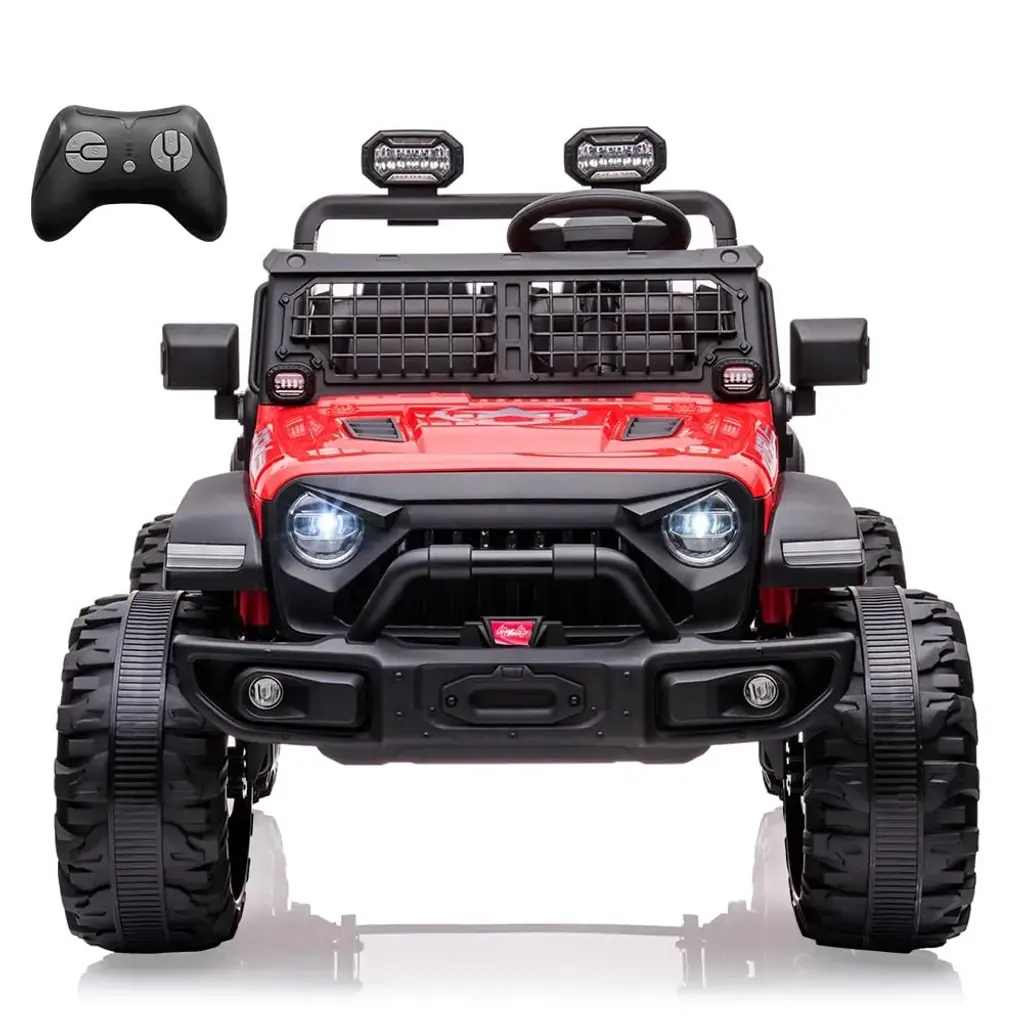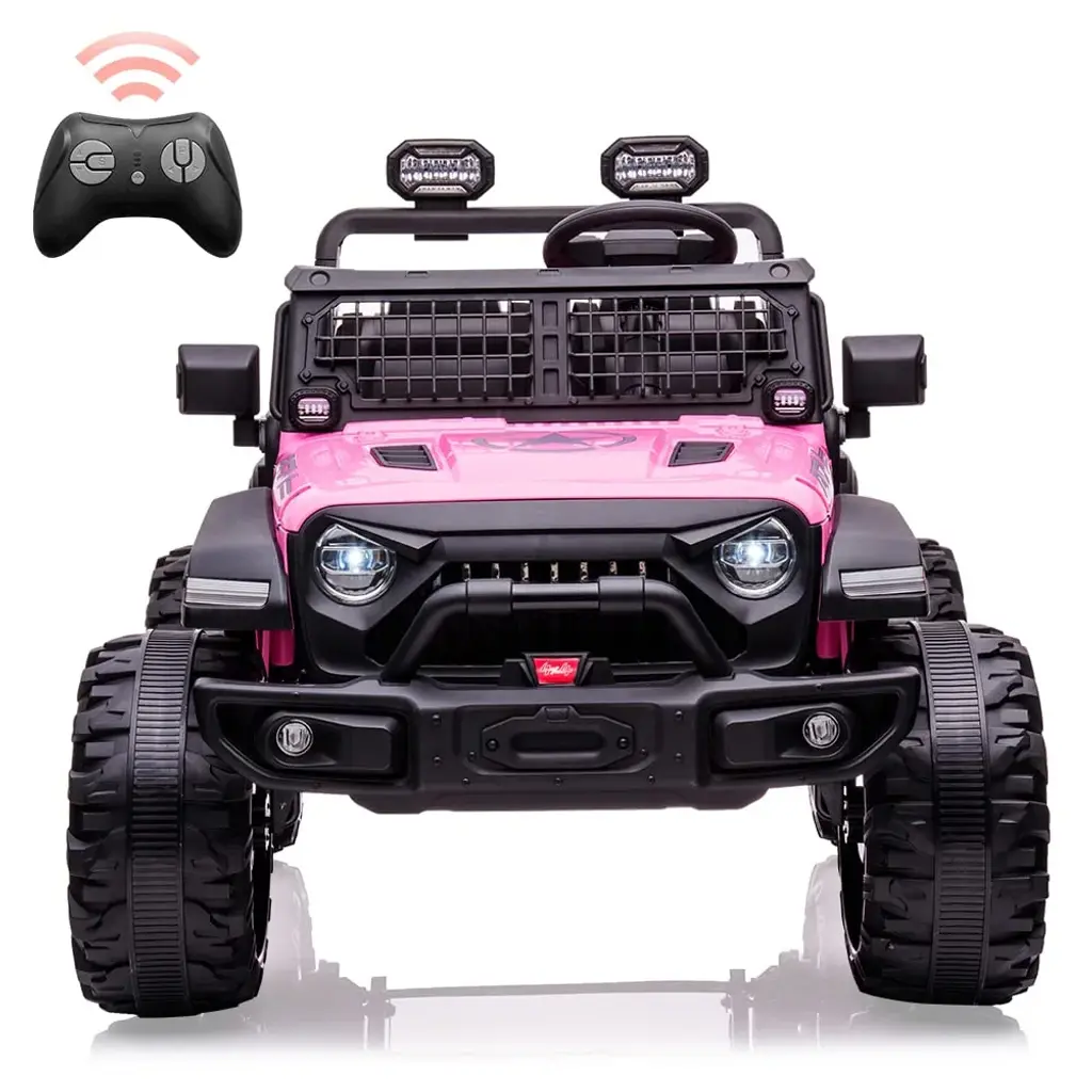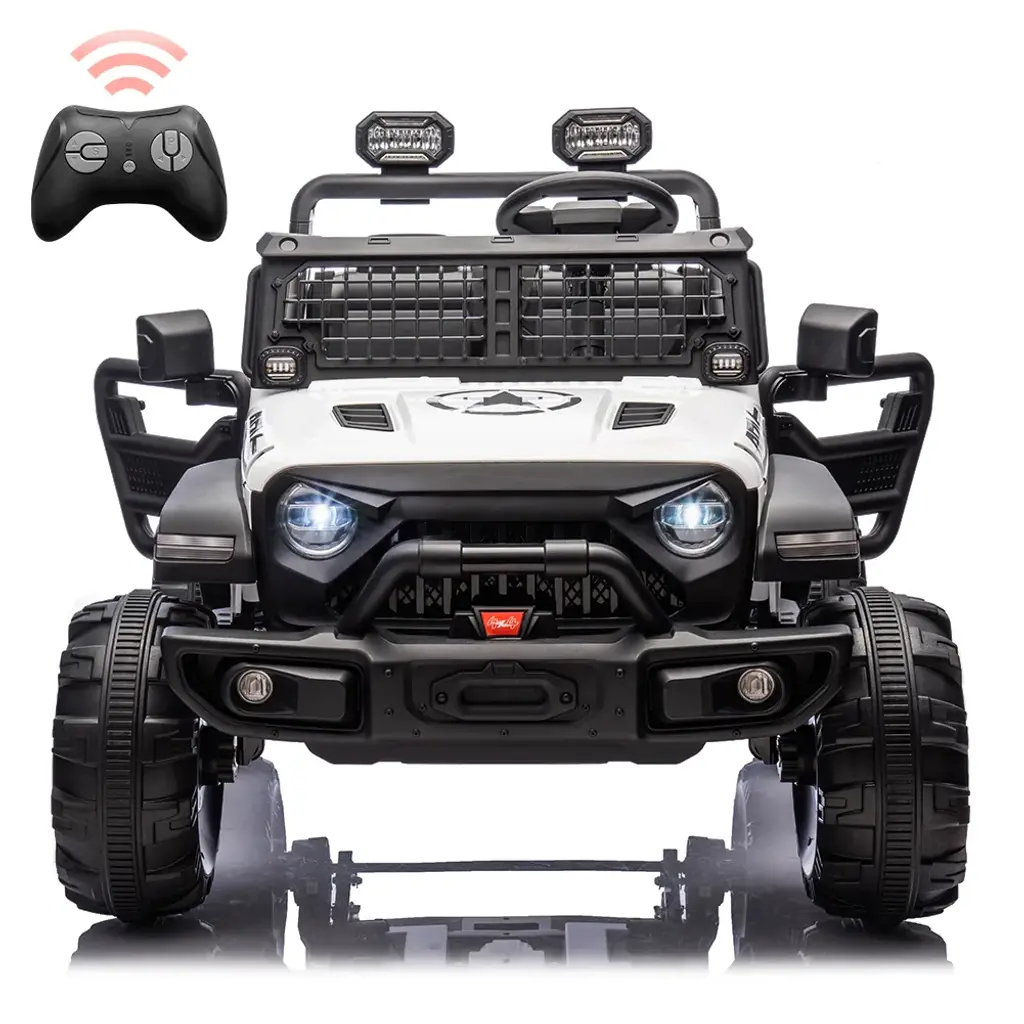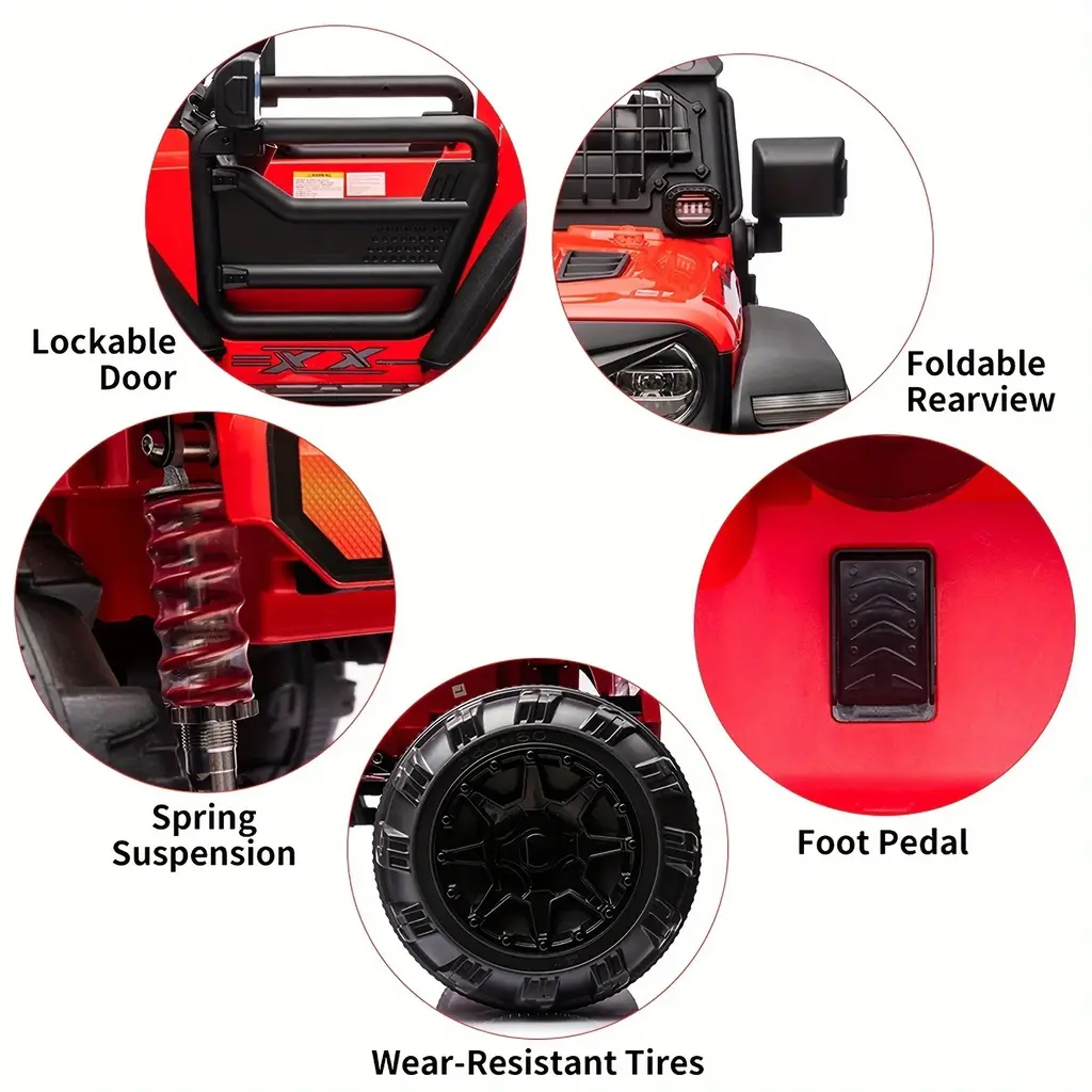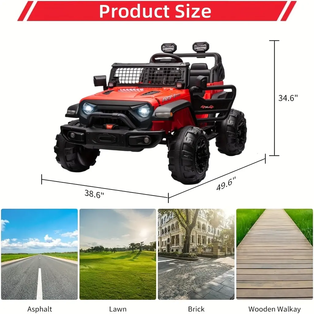 Built-in Fun Features:This ride-on vehicle comes fully equipped with an MP3 player, USB port, FM radio, bright LED headlights, horn, Bluetooth connectivity, and a bottle holder, providing endless entertainment for children. The front storage bin allows kids to bring their favorite toys along on their adventures.Spacious 20" Seats:With overall dimensions of 49.6" x 38.6" x 34" (L x W x H) and a generous seat width of 20", this two-seater design accommodates two kids aged 2.5 to 4 years or one child aged 4 to 8 years. Each seat is equipped with a single safety belt, ensuring secure rides for one or two little passengers.Manual & Parental Control Options:Parents can join in on the fun by using the remote control to guide the car, while kids also have the freedom to operate it independently via a foot pedal, allowing them to control their speed. Each wheel features independent bearings for smoother steering, making driving easier and more enjoyable.Powerful Dual 120W Motors:Powered by a robust 24V 9Ah battery and dual 120W motors, this ride-on truck is designed to handle various terrains with ease. The 14.2" large wheels enhance off-road performance, ensuring continuous power and adaptability in any driving condition.Enhanced Driving Comfort:Featuring metal spring shock absorbers, forward and reverse gears, and adjustable high and low-speed settings, this ride-on car offers a smooth and comfortable driving experience. These features not only make it easy to operate but also help improve children's hand-eye coordination while providing an exciting driving experience—making it an excellent gift choice!
