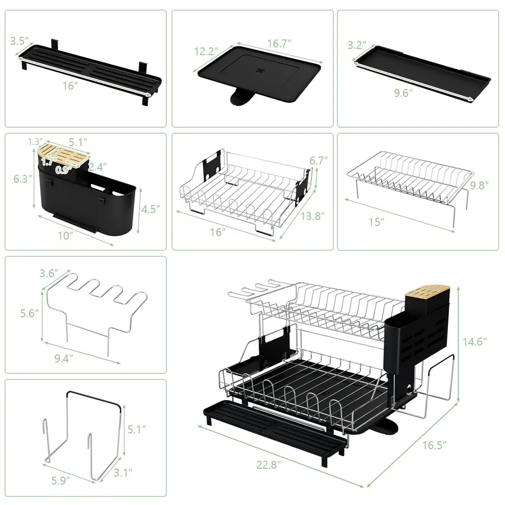 Looking for a way to keep your dishes organized and your countertops dry? Introducing our 2-tier dish drying rack – a game changer for every kitchen. Here's why this dish rack stands out:1. Generous Storage Capacity: This 2-tiered design ensures you have ample space to dry a variety of dishes. From saucers and bowls to mugs and glasses, it efficiently handles your daily dish load, ensuring they are organized and easily accessible.2. Flexibility in Design: With its unique detachable design, this rack offers versatility. Depending on your dish load, you can use it as a single layer or double up for more space. Plus, if you ever need to, you can use the top tier separately by the sink.3. Smart Drainage System: No more water pooling or messy countertops! The included drip tray is designed with a 360° swiveling spout, ensuring water drains directly into the sink. Its extendable design allows you to direct the water flow as per your convenience.4. Built to Last: Crafted with a focus on durability, this dish rack boasts a heavy-duty metal frame that resists rust, ensuring long-term use. Plus, with its anti-slip feet, it remains stable and ensures your countertop remains scratch-free.5. Hassle-Free Maintenance: Set up is a breeze with our straightforward instructions. Cleaning is just as easy – simply wipe it down with a damp cloth. Its detachable parts also mean deep cleaning is effortless when needed.Wrap Up: Maximize your counter space and keep your dishes organized with our innovative 2-tier dish drying rack. Not only does it offer a practical solution for drying dishes, but its sleek design also adds a touch of elegance to any kitchen decor. It's time to upgrade your kitchen organization game!