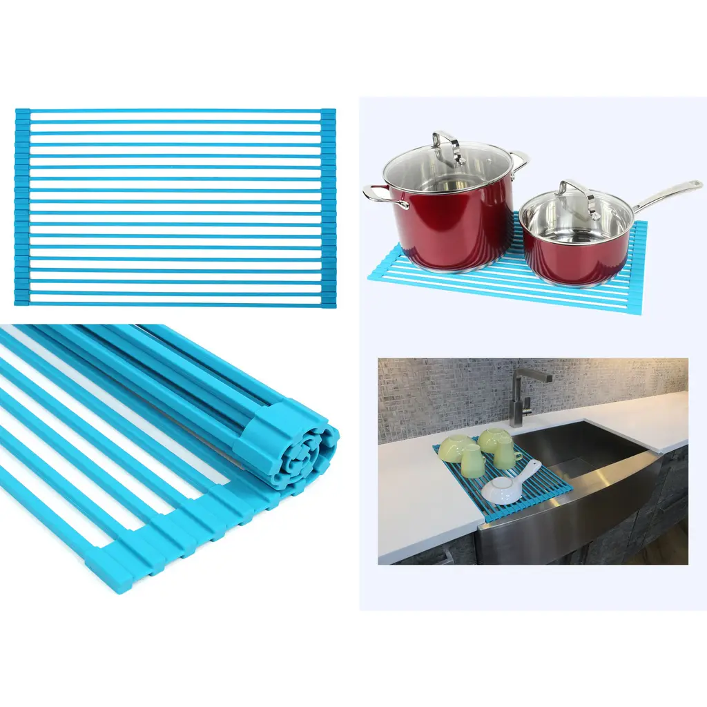 Dry dishes, cookware, and food with this dish rack. Made of silicone, this rack is safe to use and handles temperatures up to 400 degrees, while the innovative roll-up design lets you conserve space in smaller kitchens. Ample dimensions let you dry multiple items simultaneously, while in-sink design makes cleanup after use easy.Roll-up drying rackMade of siliconeMultiple color optionsHeat resistant up to 400 degrees FahrenheitExcellent for drying cookware, dishware, and foodUnrolled measurement is 20.375 inches long x 12.75 inches wide