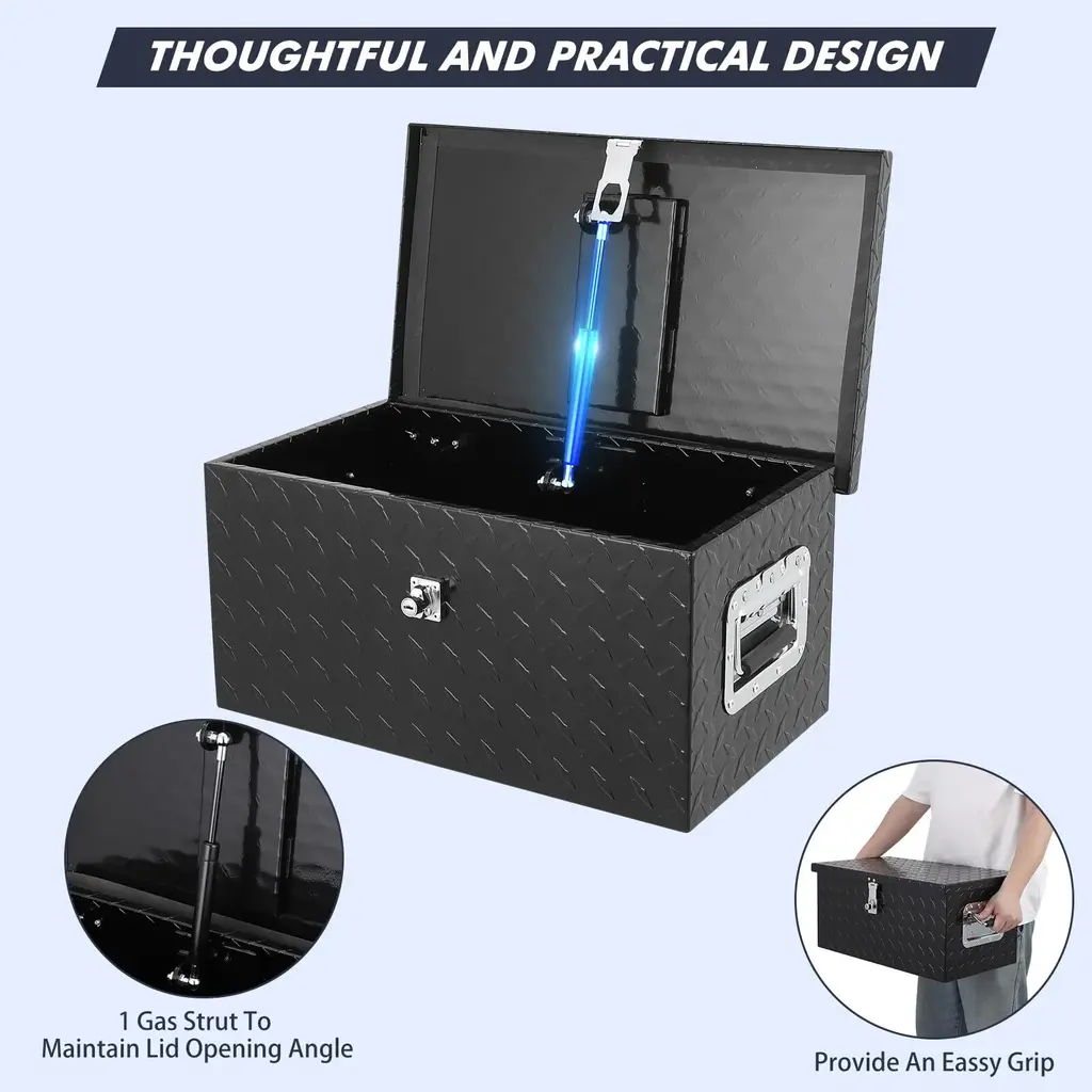 STURDY AND DURABLE: This truck toolbox is constructed with high-density aluminum and a non-slip surface while being highly resistant to oxidation, ensuring it maintains an attractive appearance and stable performance in harsh environments over time. SPACE-SAVING STORAGE: This spacious trailer toolbox measures 20 x 12 x 9.5 inches, providing plenty of room for buckets, maintenance tools, fire extinguishing canisters, warning signs, and other items in your truck. It's versatile and can be used in pickups, trucks, trailers, RVs, and even at home. You no longer need to worry about misplacing small objects with this toolbox. SECURE AND PROTECTIVE: A stainless steel latch keeps your tools and supplies secure, protecting against theft and weather elements. Fully welded seam construction and a weatherproof seal allow this toolbox for trucks to protect your stored items from the rain in all types of harsh weather conditions. LIFT WITH EASE: Features wider carrying handles on both sides, making the tool box easy to grip even with gloves on. Moreover, it comes with an easy-to-open-and-close gas strutted notched lid to assist with opening and closing, hold the lid in place and allow for a soft close. Making it easy for you to access what you need at any time. WIDELY USED: Not only does this toolbox provide ample storage for your tools, it can also be used to store camping supplies, extra accessories or holiday items. Perfect for use at home, in the garage or at work.
