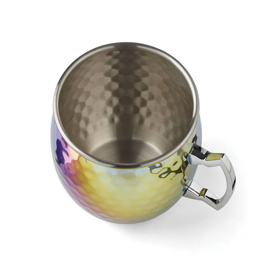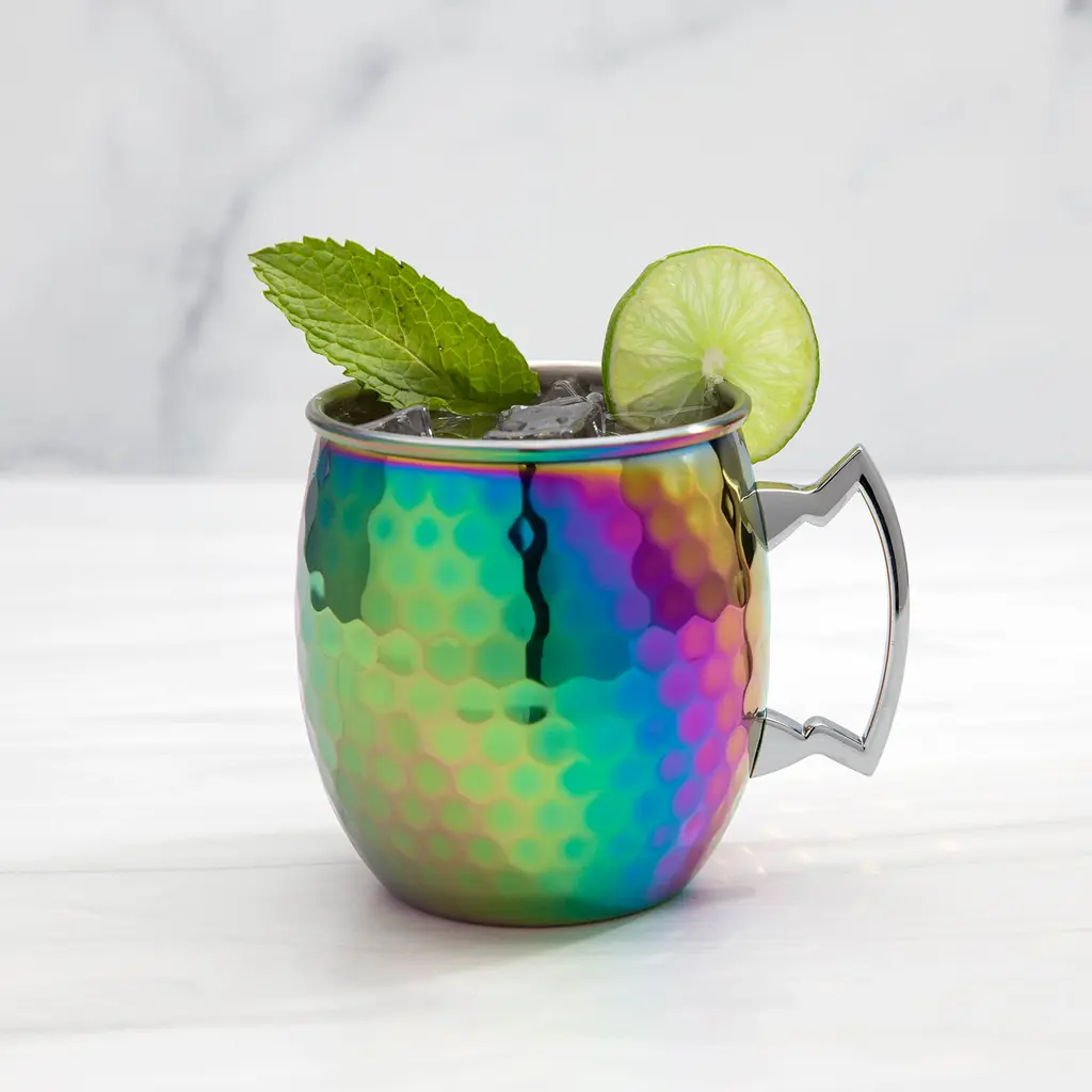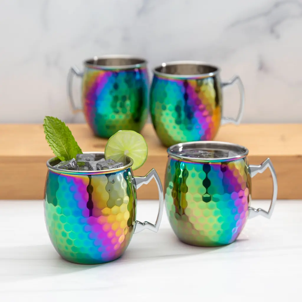 Cheers to these classic Moscow Mule mugs finished with hammered rainbow stainless steel. They're the perfect way to add a timeless touch to any happy hour or holiday celebration. Keep your drinks hot or cold with these chic and shatter-resistant mugs-ideal for picnics, poolsides, campfires, couches, beaches, and more!Features:What is Included: